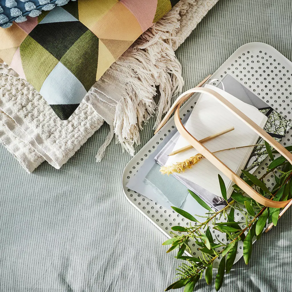 GRÖNFISK Tray with handle - bamboo/white 18x12 ". With GRÖNFISK tray, you can easily gather your things to quickly clear away a work table and transform it into a dining table – and back. Perfect if you live in a small space or just like to use the same areas at home for many different activities.