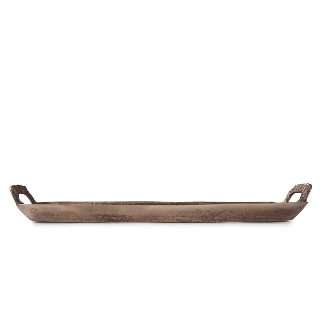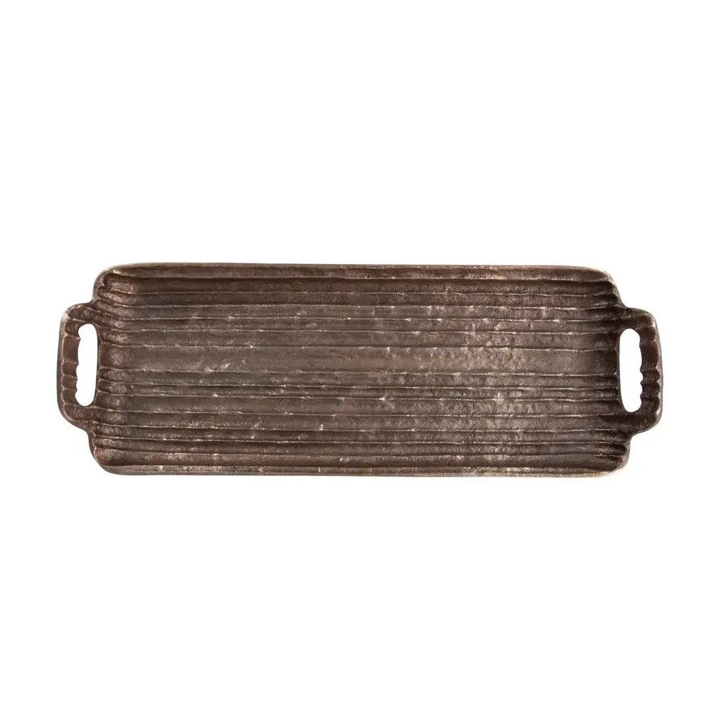 The Grooved Burnished Bronze Tray Texture is the defining factor of any home decor accessory. This aluminum tray is no exception. The exaggerated ribbed texture paired with its unique shape gives the piece an organic and earthy feel. The rich antiqued bronze finish further defines the look. Pair with the additional styles in our collection to complete the look. Dimensions: 20.1/4"w x 7"d x 2.1/2"h Finish: Antiqued Bronze - Materials: Aluminum