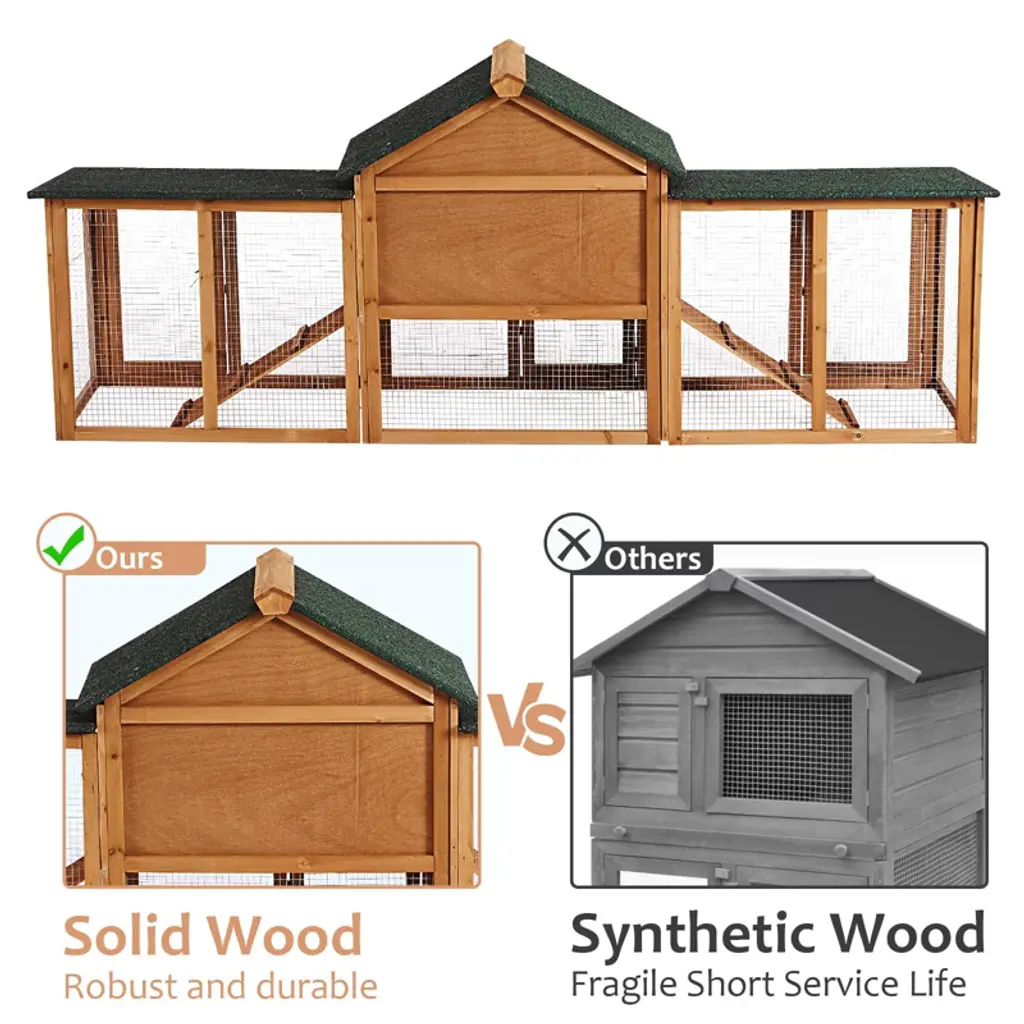 This 82.7-inch dual-level outdoor hutch comfortably houses 2-4 small pets with a lofted sleeping zone and side activity runs. Constructed from predator-resistant galvanized steel mesh and solid fir wood, it features an eco-friendly waterproof coating and asphalt roof for year-round weather protection. The slide-out leak-proof tray enables effortless waste cleanup, while six lockable doors provide multi-angle access for feeding and interaction. Pre-drilled parts and numbered hardware allow tool-light assembly in 30 minutes. Combines robust security, all-climate endurance, and intuitive maintenance—creating a safe, ventilated habitat for rabbits or guinea pigs in gardens or patios.