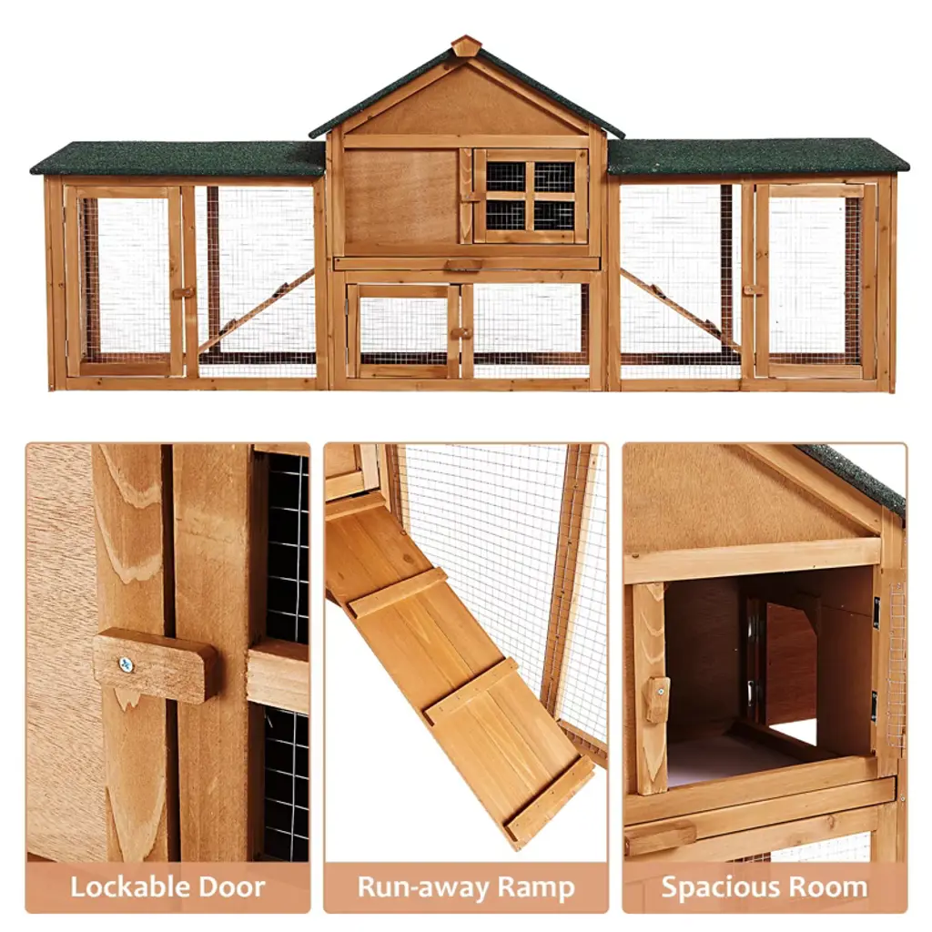 Gustowave 80" Wooden Outdoor Rabbit Hutch & Chicken Coop, Weatherproof Asphalt Roof, Removable Tray & Ramps For Small Animals, Brown