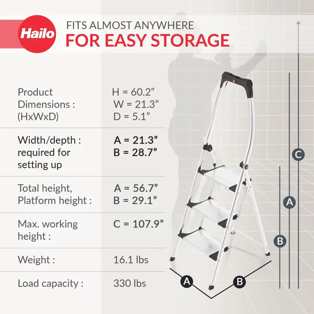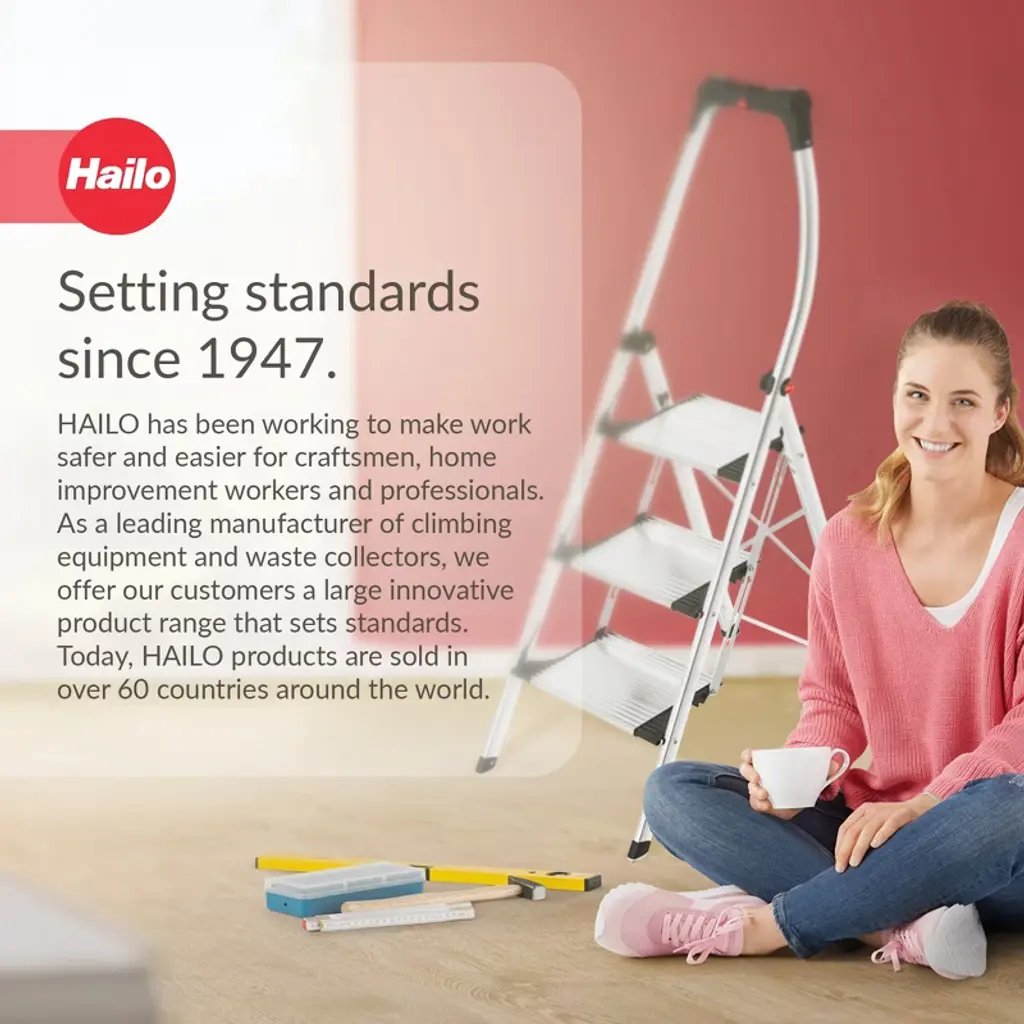 Reach higher with confidence using the Hailo Step Stool, designed to provide safety, stability, and long-lasting durability. Perfect for a wide variety of household and professional tasks, this versatile step stool features a lightweight, foldable aluminum frame that combines strength with portability. An integrated tray keeps tools and small items close at hand, while the curved aluminum safety rail provides a secure grip and added support. The wide, stair-style steps feature a non-slip ribbed surface for maximum comfort, and the Soft-Grip plastic feet ensure stability on multiple flooring types, including wood, tile, and carpet. Engineered to hold up to 330 pounds, this step stool is suitable for both indoor and outdoor use. Use it in the kitchen, garage, office, or workshop to safely reach higher spaces. A folding lock with safety catch keeps the stool securely open during use, and when the job is done, it folds down to just a few inches wide for convenient storage and transport. Compact, sturdy, and easy to handle, the Hailo Step Stool is the reliable solution whenever you need a safe lift.