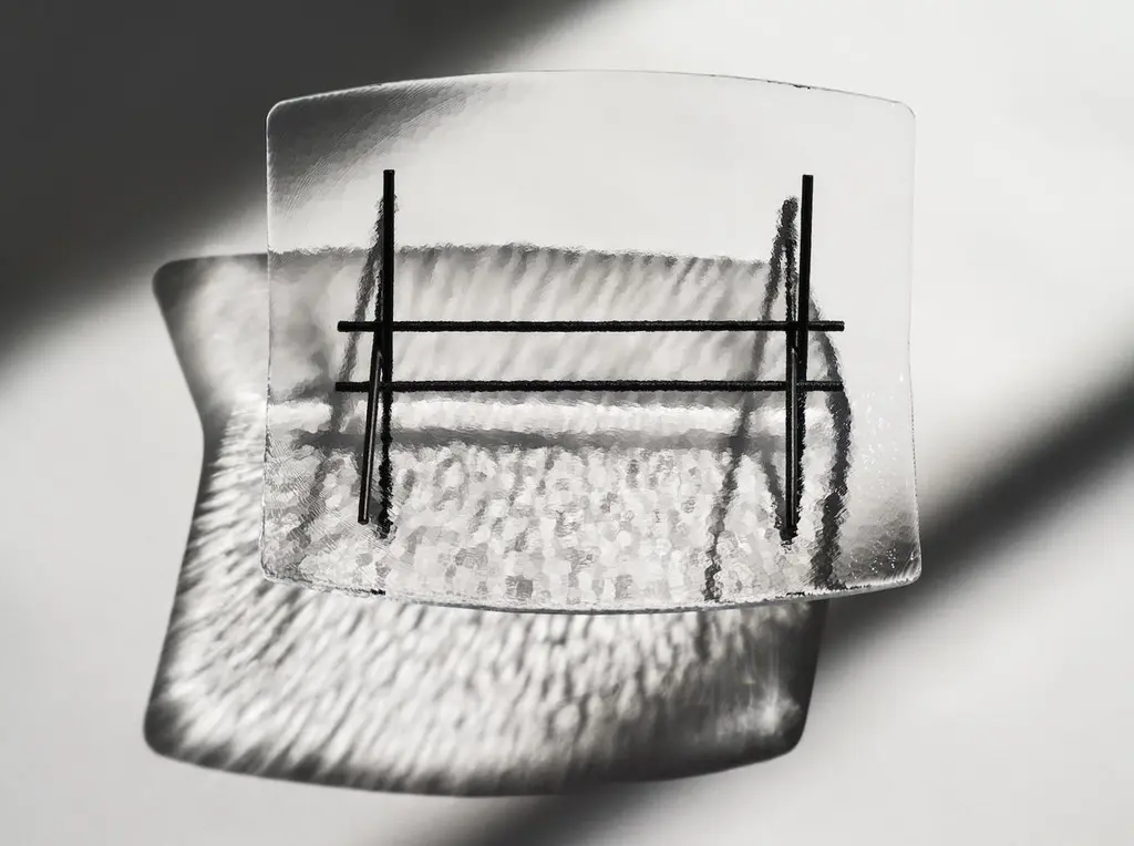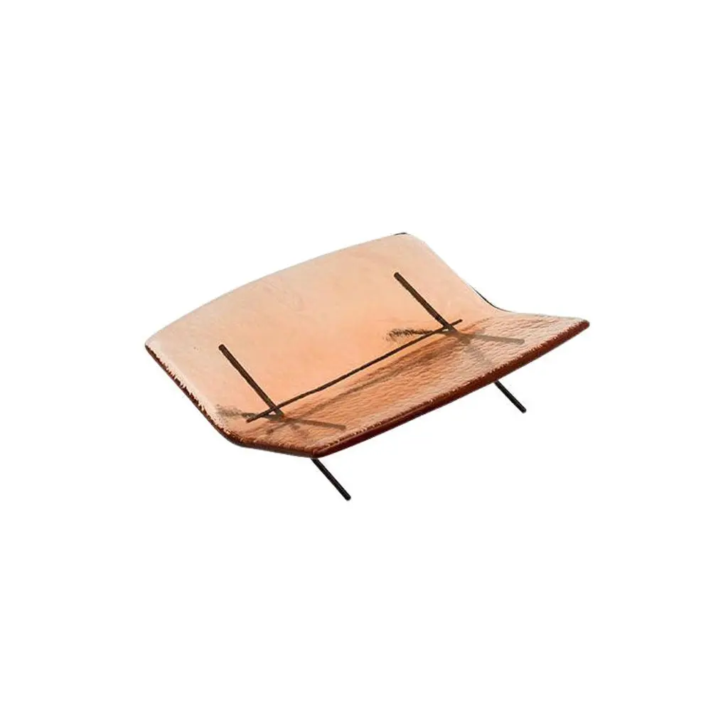 Grey Hakou B tray by Mason Editions.Dimensions: 36 × 30 × 11 cmMaterials: Glass and ironColours: transparent, fume or light pink glass + black metal baseAll the poetry, delicacy and charm of Japanese culture is apparent in Hakou, the line of fruit dishes and knick knack trays designed by Matteo Fiorini for Mason Editions. A sheet of glass crafted in a thickness of one centimetre, with a shape that recalls a leaf or a boat slightly tilted by the wind, appears to be suspended over a dainty base consisting of a series of metal rods, intersected on the shorter side to form a slender trestle. The sunlight comes through the glass gracefully, creating a play of lights and shadows.A clear footed fruit bowl that won’t go unnoticed, available in 3 different colours: clear glass, rose pink or smoked. Enjoy the singular beauty of Hakou, as each carefully handcrafted piece is unique.Mason Editions is an Italian company specialized in the production of design furniture, lighting solutions and accent pieces. Born from the lifelong passion for lighting and entrepreneurial spirit of Fabio and his partner Silvia, Mason Editions places itself halfway between fine art and exquisite craftsmanship. A collection of lighting, design objects and furnishing accessories, signed by artists Serena Confalonieri, Martina Bartoli and Matteo Fiorini, head of the creative direction.Mason Editions comes from the experience of an Italian lighting company placed in the Veneto region.This new brand of furniture elements was born from the meeting between the entrepreneur Fabio Mason and three international designers who designed the first collection for a sophisticated public. Therefore the collection wants to be eclectic and timeless.The material contrast and fresh design, with essential shapes, mark the mason editions collection.In conclusion, the elegant Italian sign highlights proposals suitable for all environments.Mason editions is a set of experiences, artisans, and productive know-how that creates a capable system.