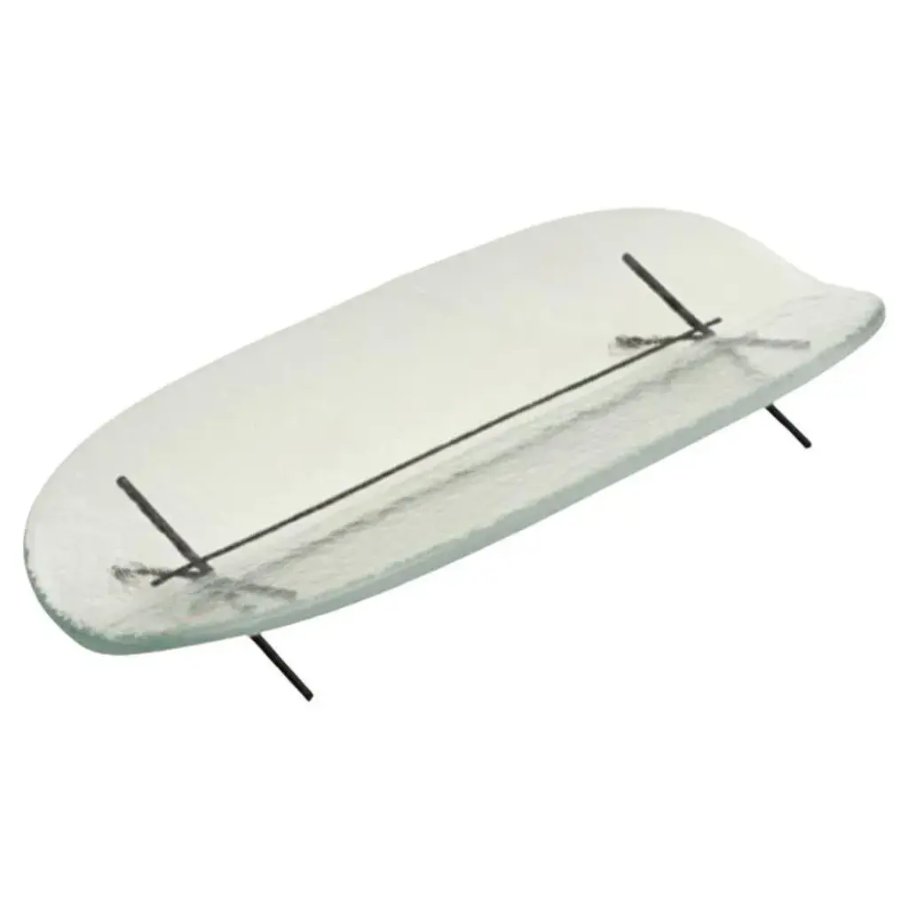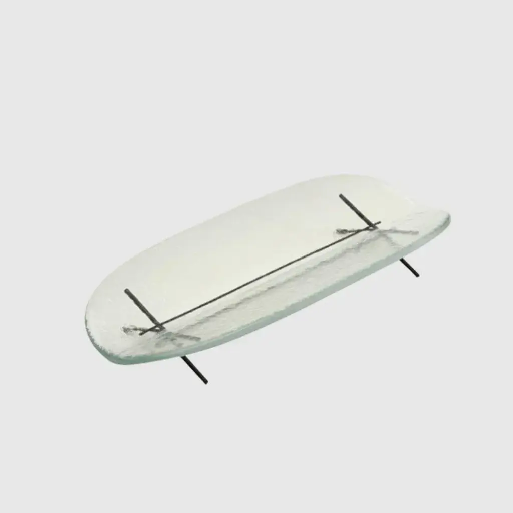 Hakou C tray by Mason Editions Dimensions: 60 × 26 × 9 cm Materials: Glass and iron Colors: transparent, fume or light pink glass + black metal base All the poetry, delicacy, and charm of Japanese culture is apparent in Hakou, the line of fruit dishes and knick-knack trays designed by Matteo Fiorini for Mason Editions. A sheet of glass crafted in a thickness of one centimeter, with a shape that recalls a leaf or a boat slightly tilted by the wind, appears to be suspended over a dainty base consisting of a series of metal rods, intersected on the shorter side to form a slender trestle. The sunlight comes through the glass gracefully, creating a play of lights and shadows. Large glass centerpiece carefully handcrafted in Italy, reason behind every piece is unique. A sophisticated designer accessory that suits any dining room and coffee table.