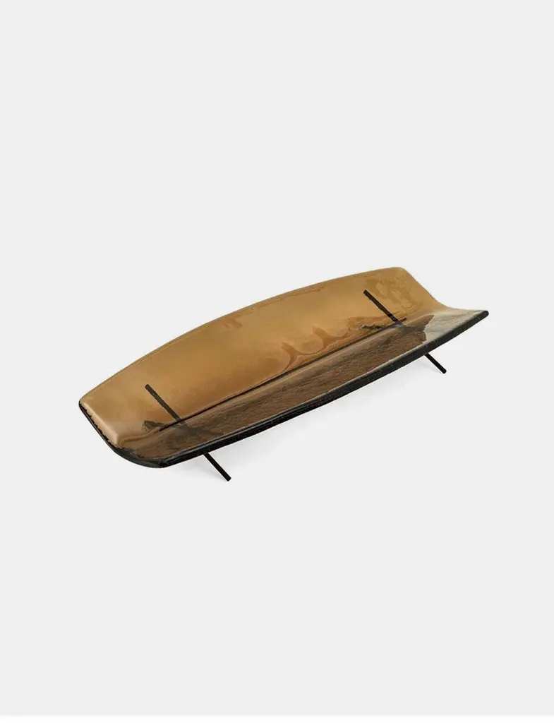Hakou D tray by Mason EditionDimensions: 60 × 26 × 9 cmMaterials: Glass and ironColours: transparent, fume or light pink glass + black metal baseAll the poetry, delicacy and charm of Japanese culture is apparent in Hakou, the line of fruit dishes and knick knack trays designed by Matteo Fiorini for Mason Editions. A sheet of glass crafted in a thickness of one centimetre, with a shape that recalls a leaf or a boat slightly tilted by the wind, appears to be suspended over a dainty base consisting of a series of metal rods, intersected on the shorter side to form a slender trestle. The sunlight comes through the glass gracefully, creating a play of lights and shadows.A rectangular glass tray to compliment your dining table. Stylish, simple and timeless design of a handcrafted glass sheet, sitting on a sturdy black metal support. The union of style and functionality.Mason Editions is an Italian company specialized in the production of design furniture, lighting solutions, and accent pieces. Born from the lifelong passion for lighting and entrepreneurial spirit of Fabio and his partner Silvia, Mason Editions places itself halfway between fine art and exquisite craftsmanship. A collection of lighting, design objects, and furnishing accessories, signed by artists Serena Confalonieri, Martina Bartoli, and Matteo Fiorini, head of the creative direction Mason Editions comes from the experience of an Italian lighting company placed in the Veneto region. This new brand of furniture elements was born from the meeting between the entrepreneur Fabio Mason and three international designers who designed the first collection for a sophisticated public. Therefore the collection wants to be eclectic and timeless. The material contrast and fresh design, with essential shapes, mark the mason editions collection. In conclusion, the elegant Italian sign highlights proposals suitable for all environments. Mason editions is a set of experiences, artisans, and productive know-how that creates a capable system.