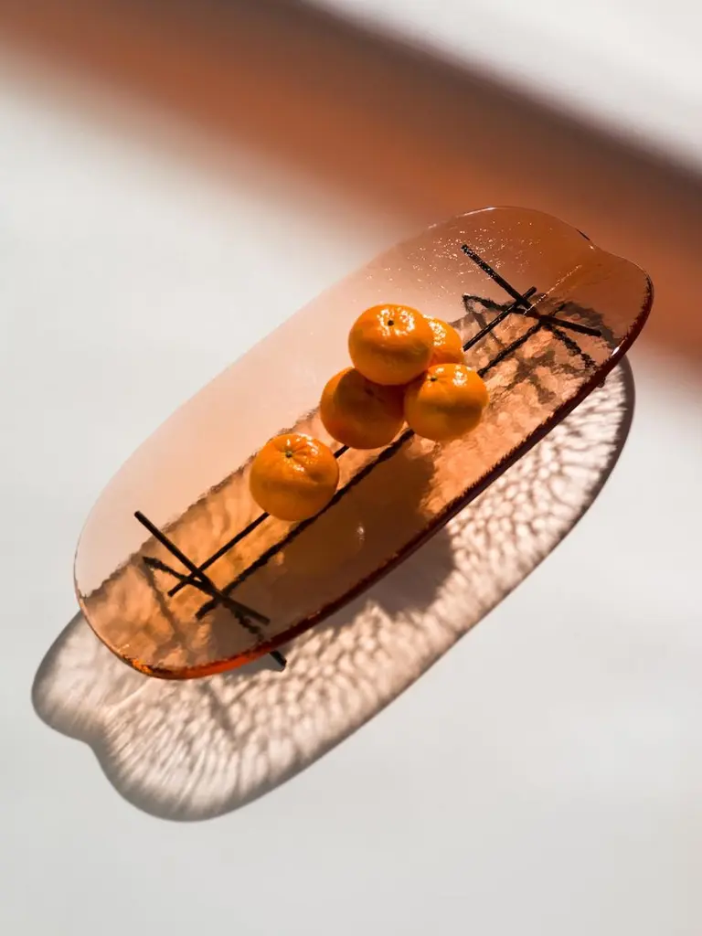 Hakou D tray by Mason EditionDimensions: 60 × 26 × 9 cmMaterials: glass and ironColours: transparent, fume or light pink glass + black metal baseAll the poetry, delicacy and charm of Japanese culture is apparent in Hakou, the line of fruit dishes and knick knack trays designed by Matteo Fiorini for Mason Editions. A sheet of glass crafted in a thickness of one centimetre, with a shape that recalls a leaf or a boat slightly tilted by the wind, appears to be suspended over a dainty base consisting of a series of metal rods, intersected on the shorter side to form a slender trestle. The sunlight comes through the glass gracefully, creating a play of lights and shadows.A rectangular glass tray to compliment your dining table. Stylish, simple and timeless design of a handcrafted glass sheet, sitting on a sturdy black metal support. The union of style and functionality.Mason Editions is an Italian company specialized in the production of design furniture, lighting solutions, and accent pieces. Born from the lifelong passion for lighting and entrepreneurial spirit of Fabio and his partner Silvia, Mason Editions places itself halfway between fine art and exquisite craftsmanship. A collection of lighting, design objects, and furnishing accessories, signed by artists Serena Confalonieri, Martina Bartoli, and Matteo Fiorini, head of the creative direction Mason Editions comes from the experience of an Italian lighting company placed in the Veneto region. This new brand of furniture elements was born from the meeting between the entrepreneur Fabio Mason and three international designers who designed the first collection for a sophisticated public. Therefore the collection wants to be eclectic and timeless. The material contrast and fresh design, with essential shapes, mark the mason editions collection. In conclusion, the elegant Italian sign highlights proposals suitable for all environments. Mason editions is a set of experiences, artisans, and productive know-how that creates a capable system.