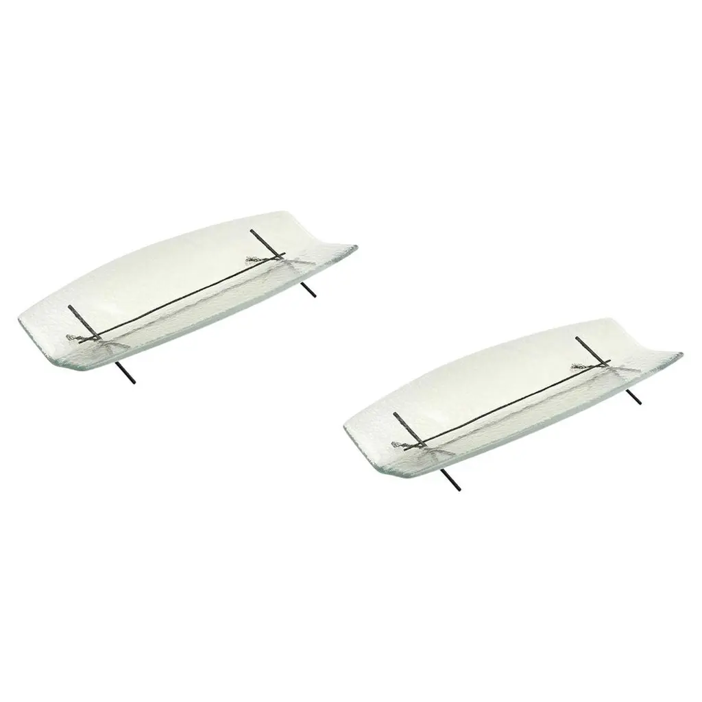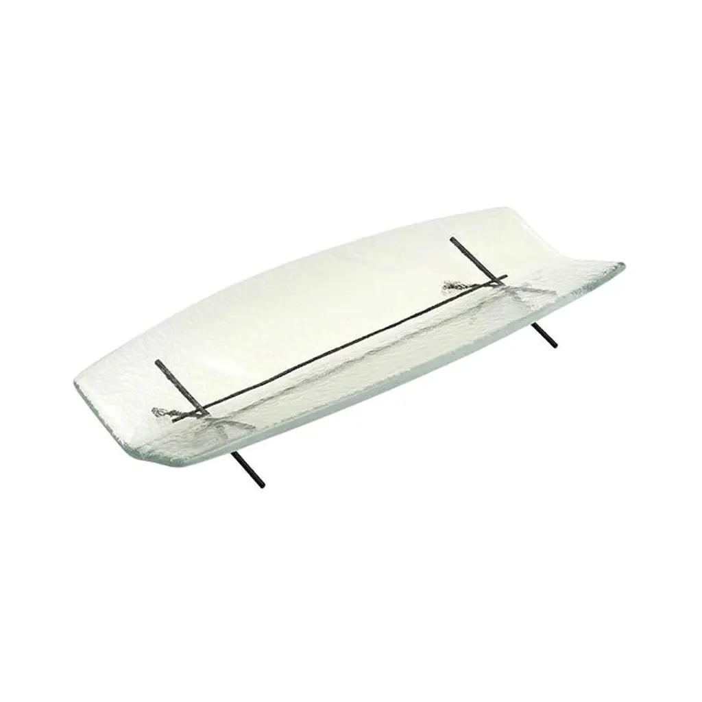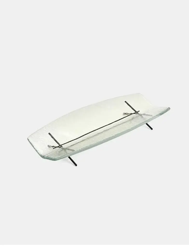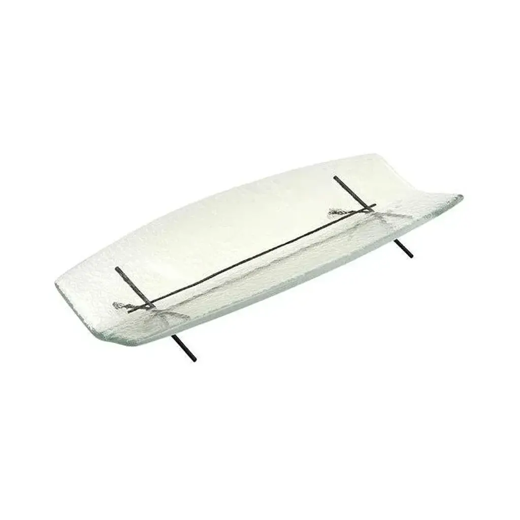 Hakou D tray by Mason Edition Dimensions: 60 × 26 × 9 cm Materials: glass and iron Colours: transparent, fume or light pink glass + black metal base All the poetry, delicacy and charm of Japanese culture is apparent in Hakou, the line of fruit dishes and knick knack trays designed by Matteo Fiorini for Mason Editions. A sheet of glass crafted in a thickness of one centimetre, with a shape that recalls a leaf or a boat slightly tilted by the wind, appears to be suspended over a dainty base consisting of a series of metal rods, intersected on the shorter side to form a slender trestle. The sunlight comes through the glass gracefully, creating a play of lights and shadows. A rectangular glass tray to compliment your dining table. Stylish, simple and timeless design of a handcrafted glass sheet, sitting on a sturdy black metal support. The union of style and functionality. Mason Editions is an Italian company specialized in the production of design furniture, lighting solutions, and accent pieces.