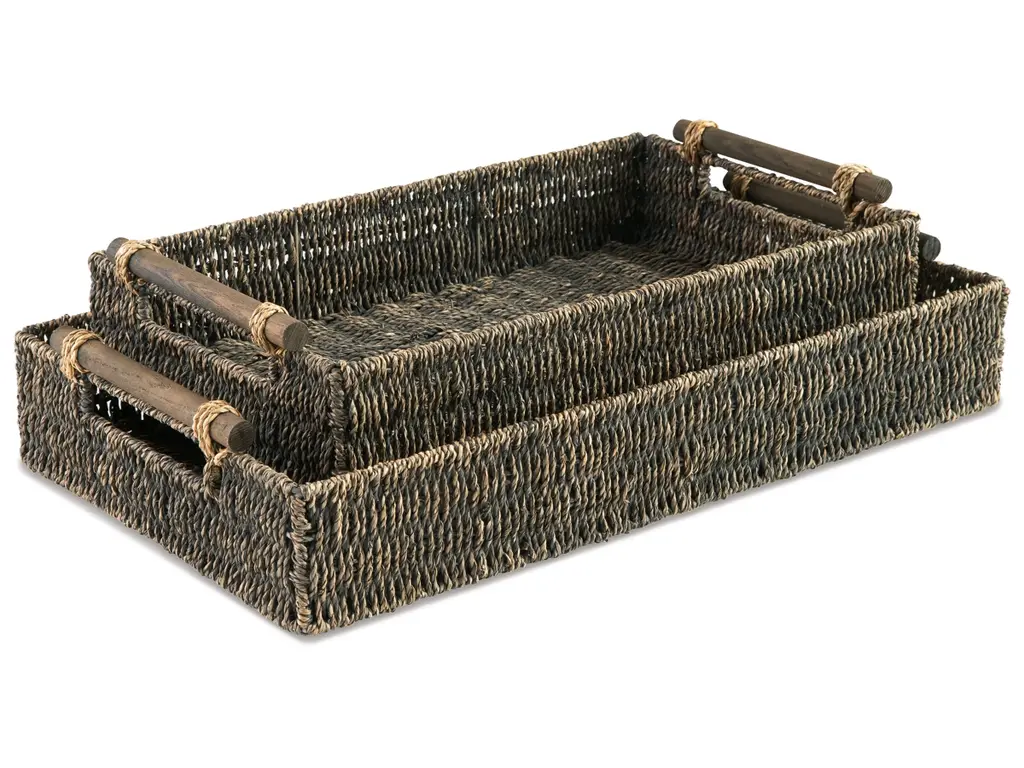 The Halima tray set with cutout wood handles adds a lovely touch of natural appeal to nearly any room. Woven from seagrass in an antiqued gray finish, these lovely trays make a great pick for everything from displaying decorative elements to storing essentials like remotes, game controllers and much more.