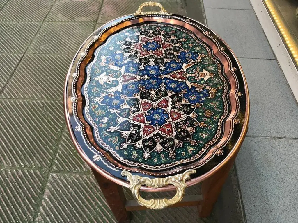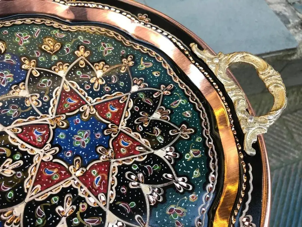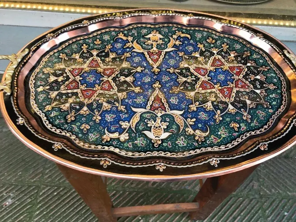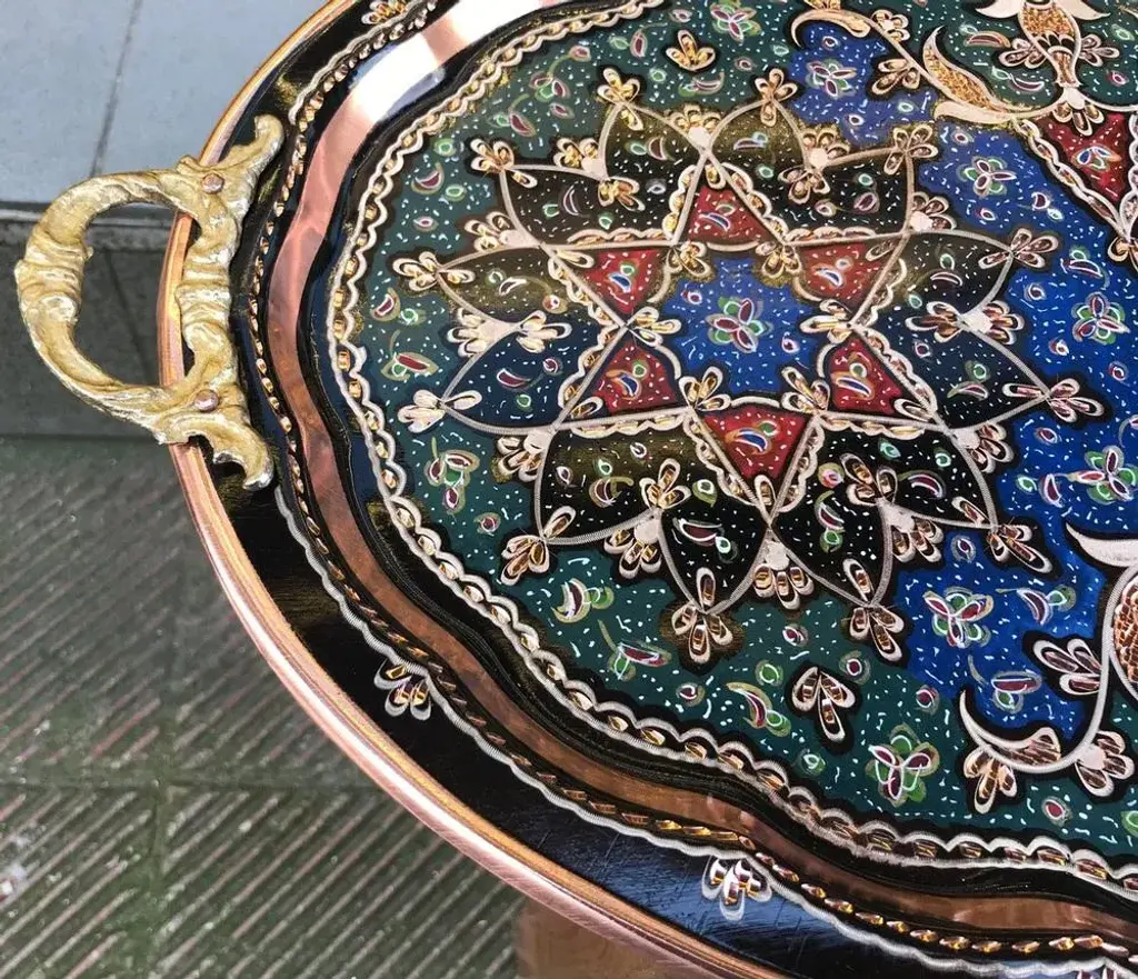 Unique engraved oval table tray with handles made by copper. Inlaid flower design and perfect for serving. Great for displaying your unique decoration. Would make a wonderful gift. Sizes; Width: 45 cm \.17.7 inches Height: 35 \.13.8 inches My items are all unique and one of a kind. You can wash my items with your hand and you need to dry it properly. All hand painted, hand carved, varnished and waterproof.