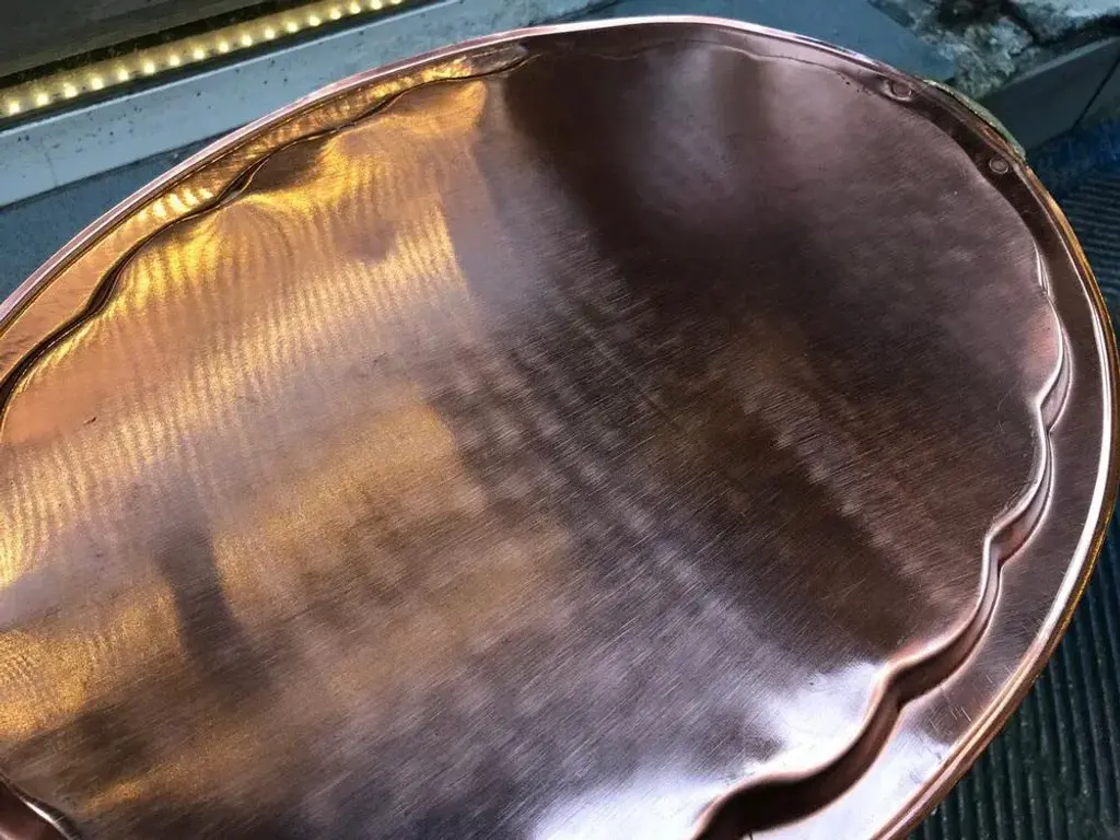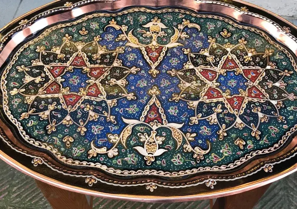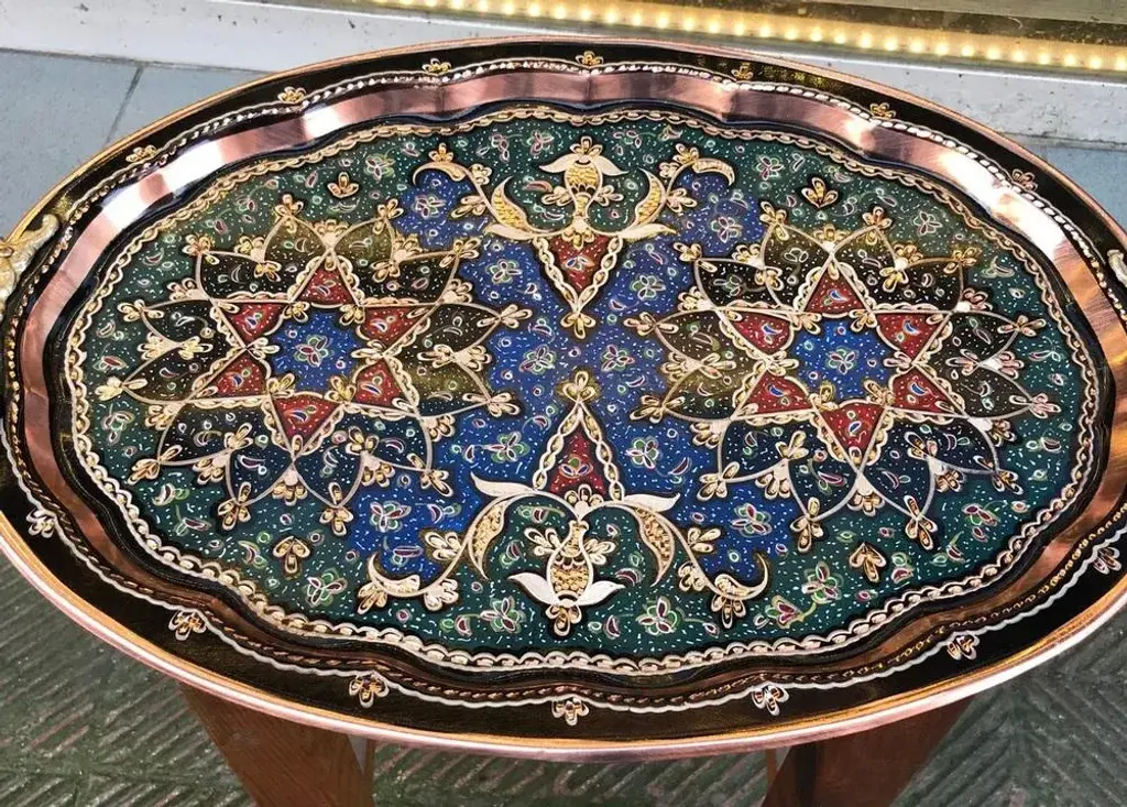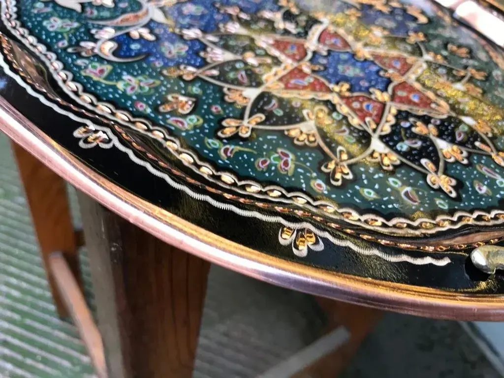 Unique engraved oval table tray with handles made by copper. Inlaid flower design and perfect for serving. Great for displaying your unique decoration. Would make a wonderful gift. Sizes; Width: 45 cm \.17.7 inches Height: 35 \.13.8 inches My items are all unique and one of a kind. You can wash my items with your hand and you need to dry it properly. All hand painted, hand carved, varnished and waterproof.