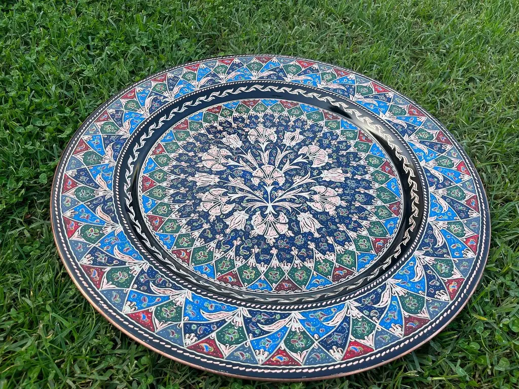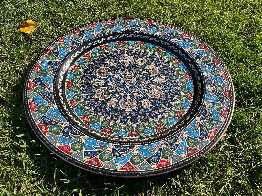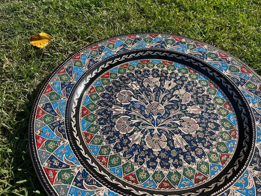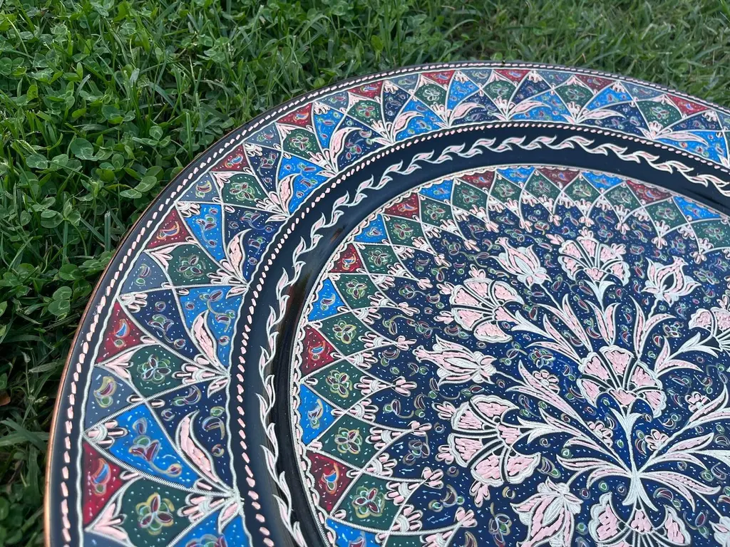 Handmade unique clove design plate made by copper. Colorful design carved wall hanging. Great for displaying your unique decoration. Hand painted dish can be hung to create wonderful wall art. There is an insert on the back of the plate for hanging. SIZE: 43 CM / 17 INCH My items are all unique and one of a kind. You can wash my items with your hand and you need to dry it properly. All hand painted, hand carved, varnished and waterproof.