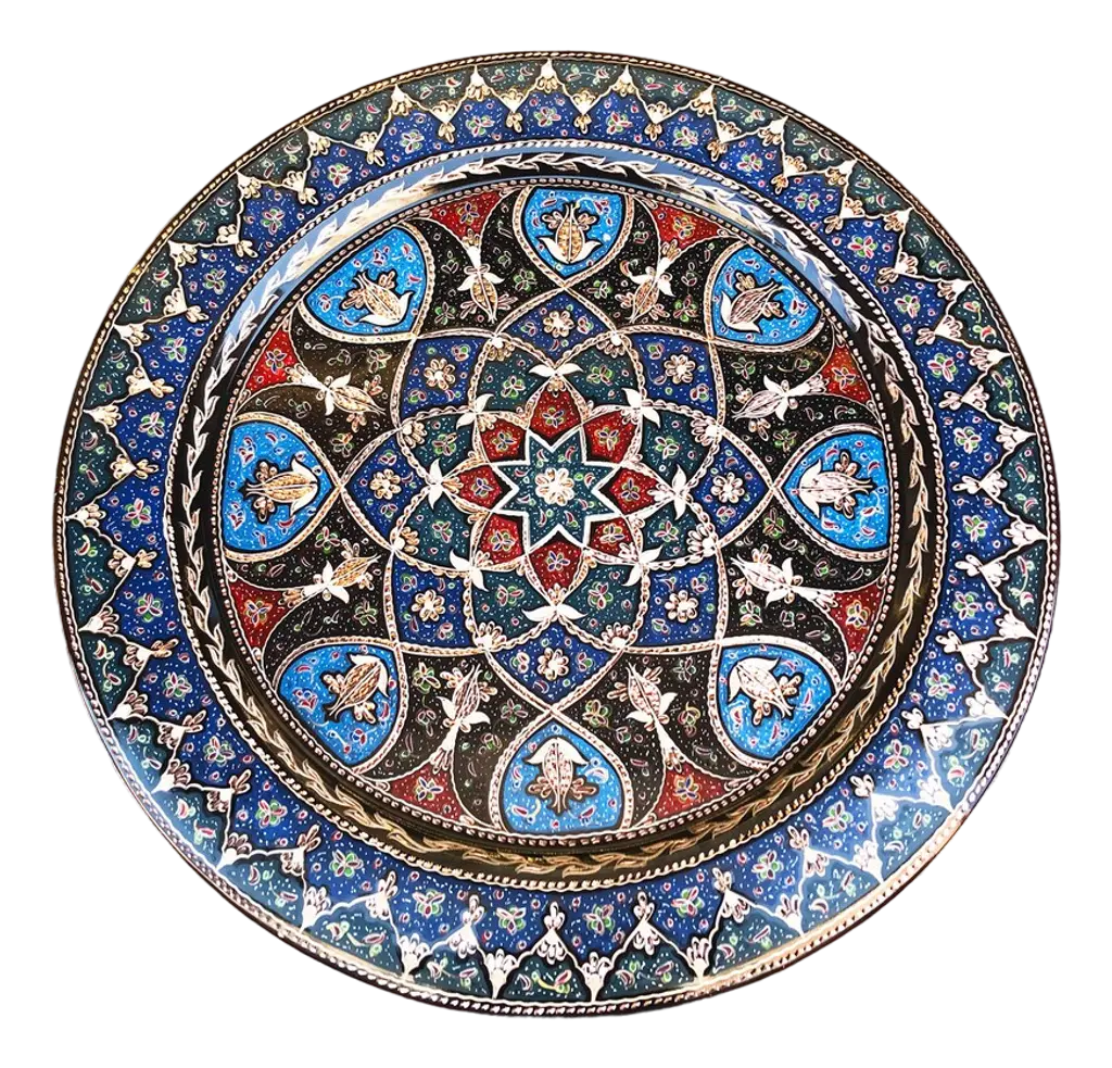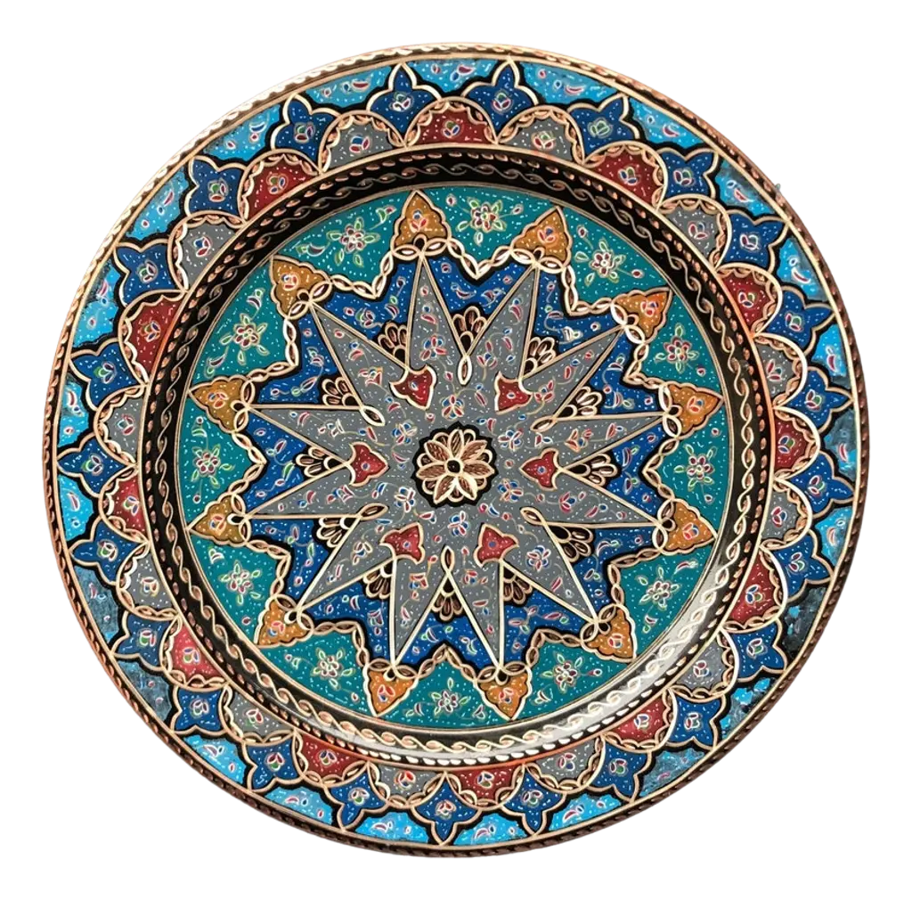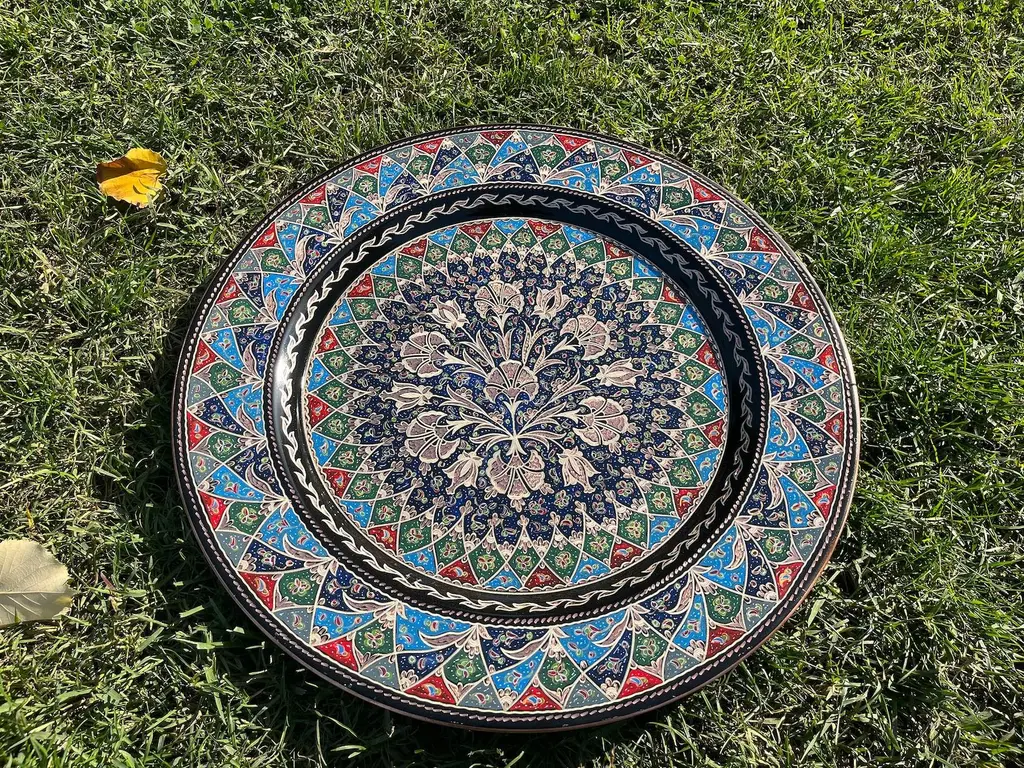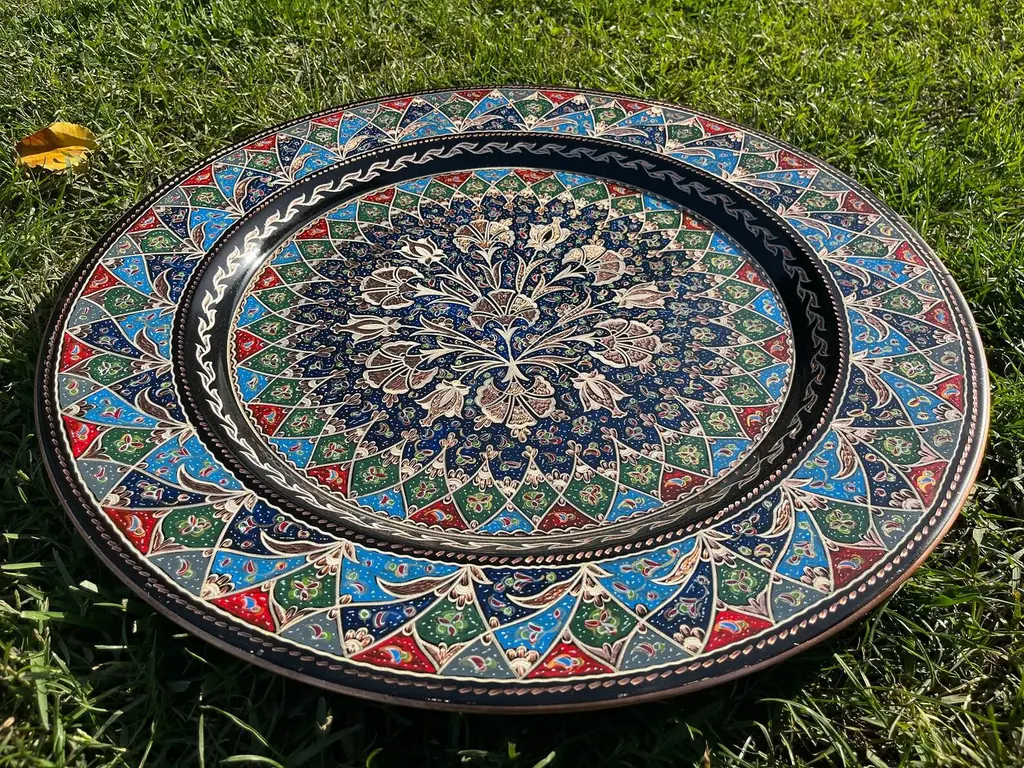 Handmade unique clove design plate made by copper. Colorful design carved wall hanging. Great for displaying your unique decoration. Hand painted dish can be hung to create wonderful wall art. There is an insert on the back of the plate for hanging. SIZE: 43 CM / 17 INCH My items are all unique and one of a kind. You can wash my items with your hand and you need to dry it properly. All hand painted, hand carved, varnished and waterproof.