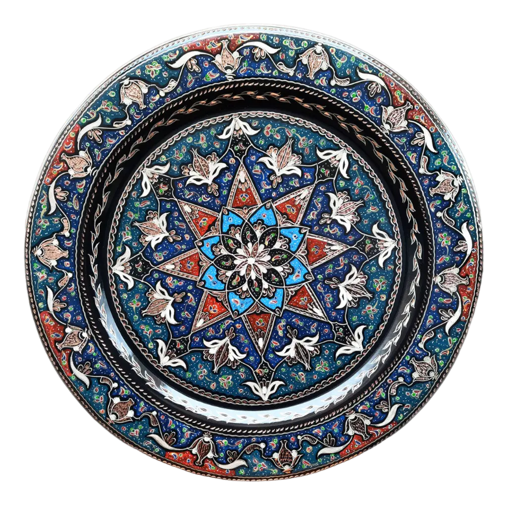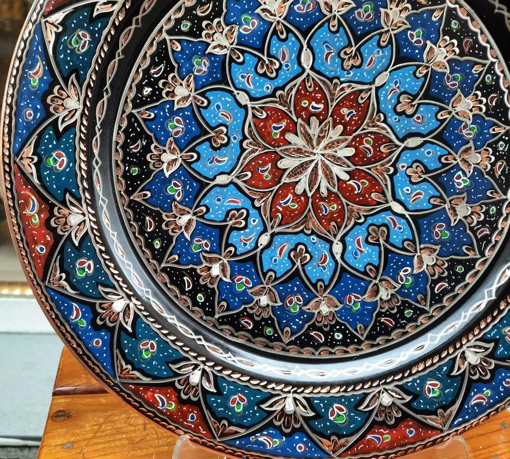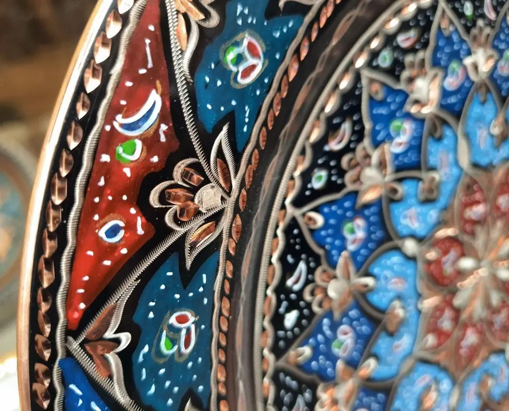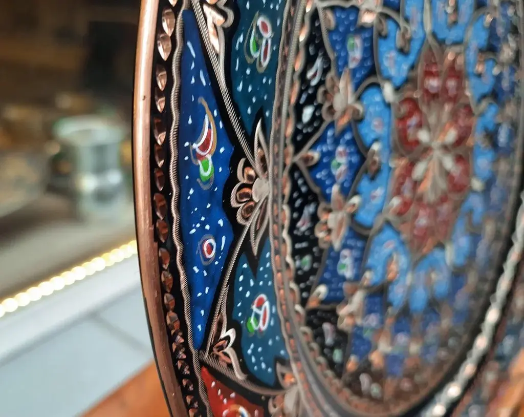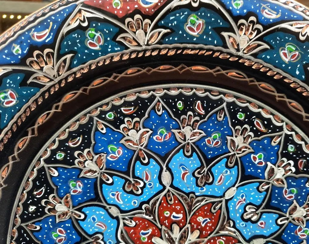 Hand Made Office Desk tray made by copper. Colorful Flower Design for wall hanging. Great for displaying your unique decoration. Hand painted plates can be hung to create wonderful wall art. There is an insert on the back of the plate for hanging. SIZE: 43 CM / 17 INCH My items are all unique and one of a kind. You can wash my items with your hand and you need to dry it properly. All hand painted, hand carved, varnished and waterproof.