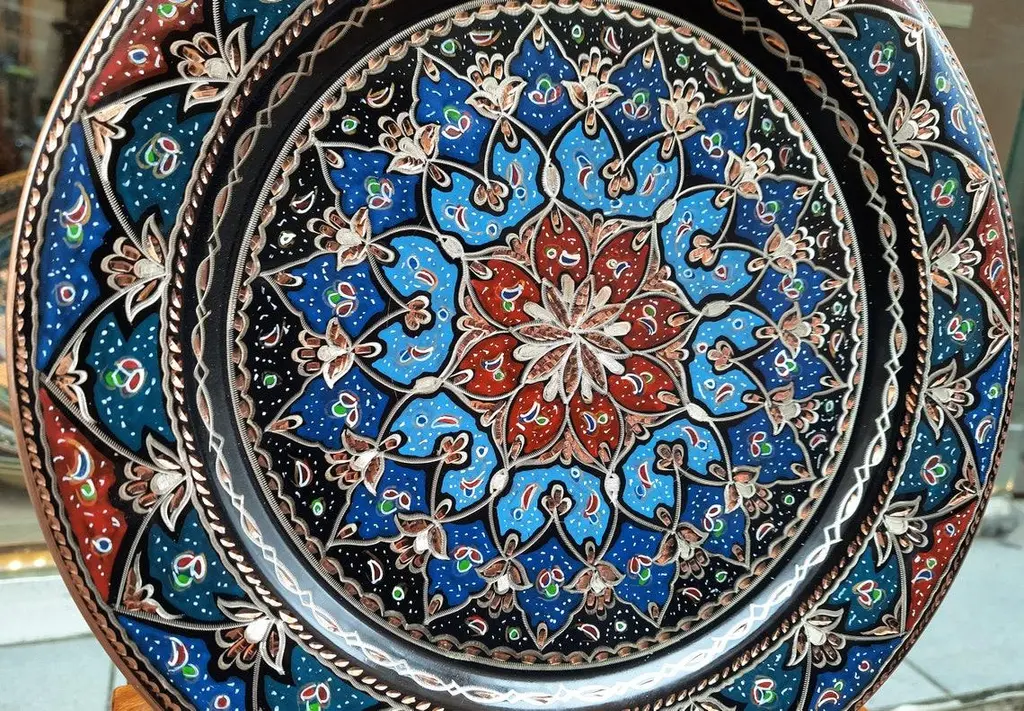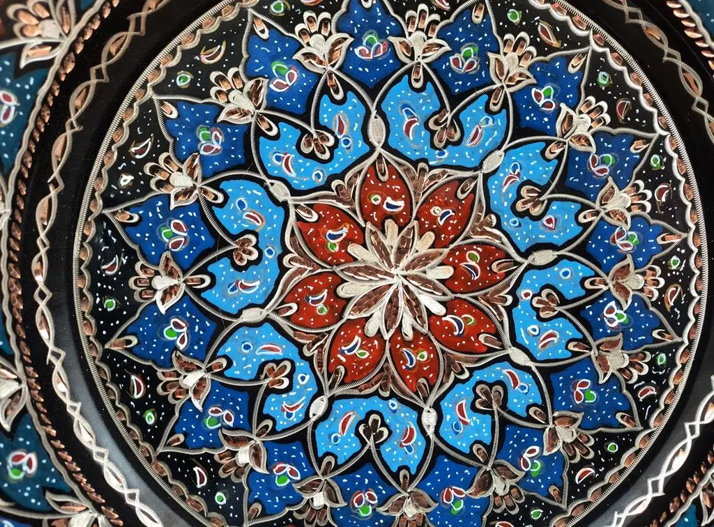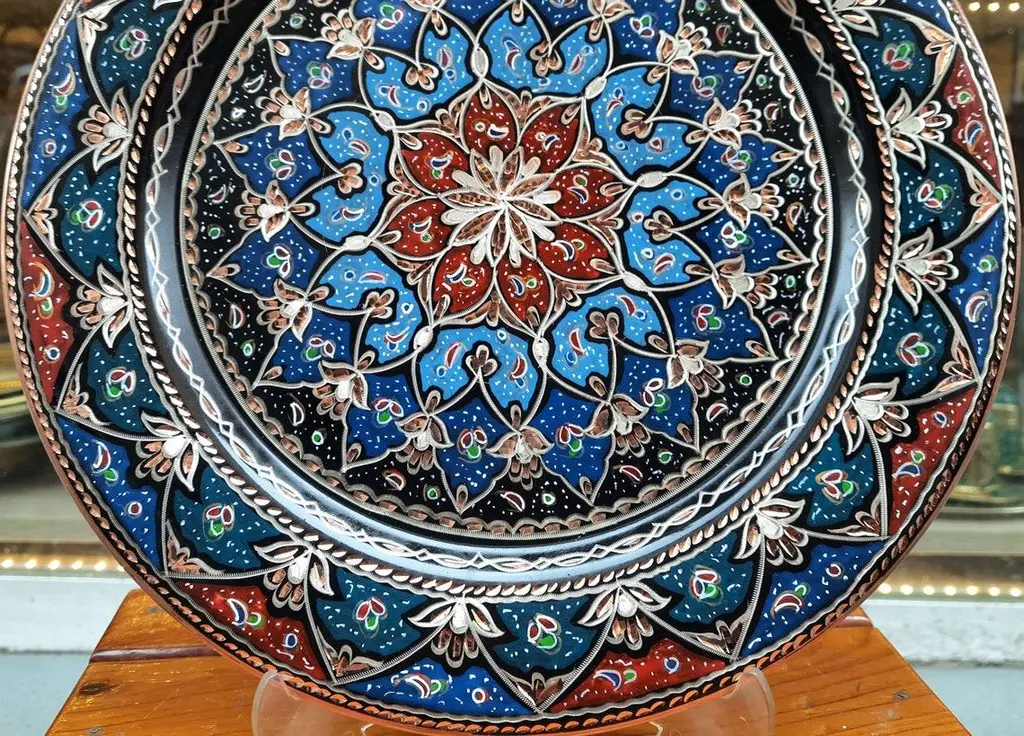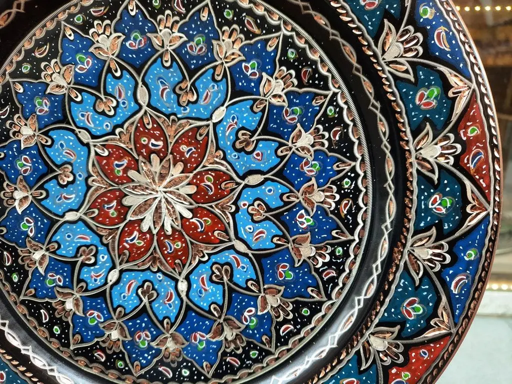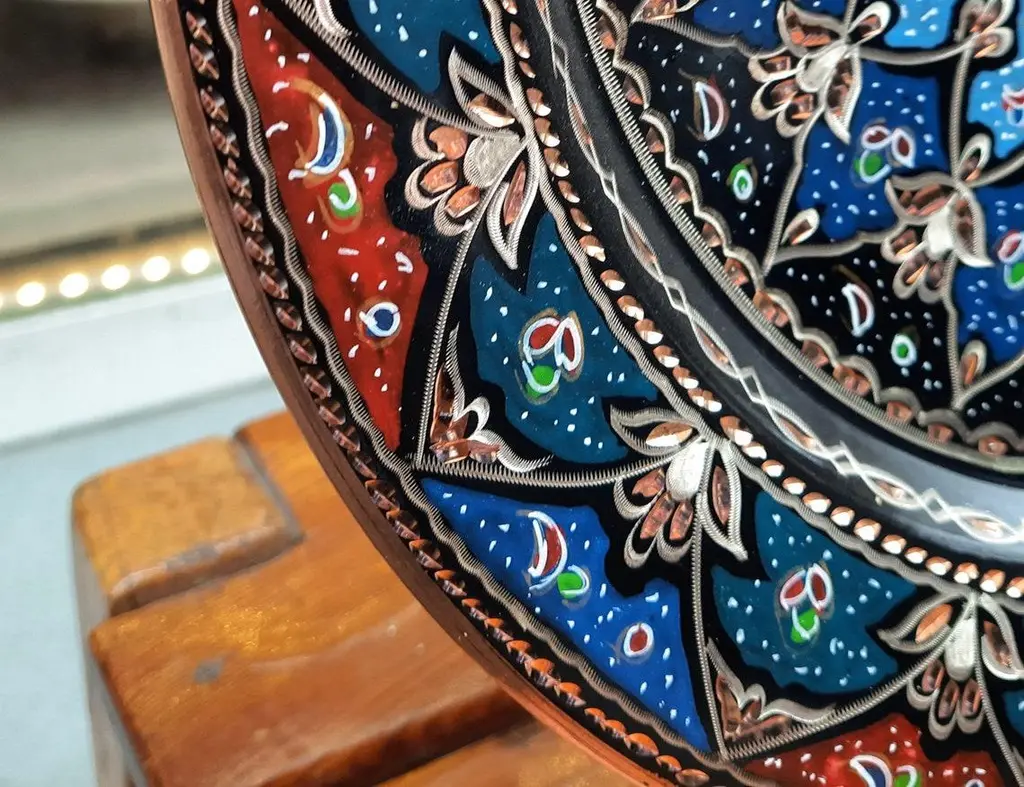 Hand Made Office Desk tray made by copper. Colorful Flower Design for wall hanging. Great for displaying your unique decoration. Hand painted plates can be hung to create wonderful wall art. There is an insert on the back of the plate for hanging. SIZE: 43 CM / 17 INCH My items are all unique and one of a kind. You can wash my items with your hand and you need to dry it properly. All hand painted, hand carved, varnished and waterproof.