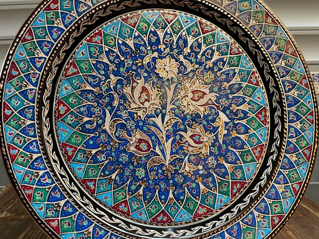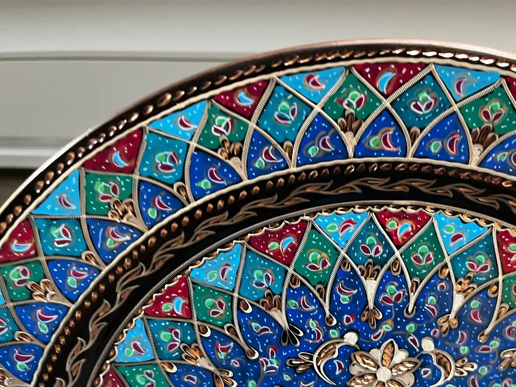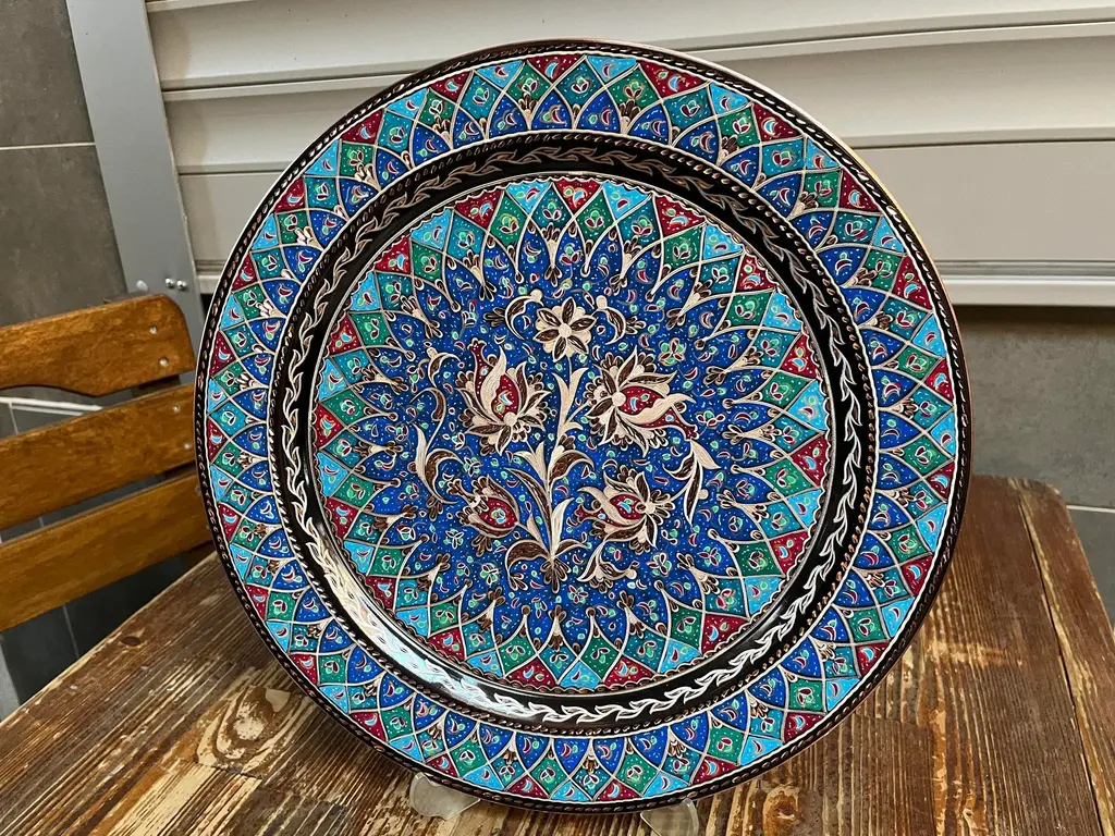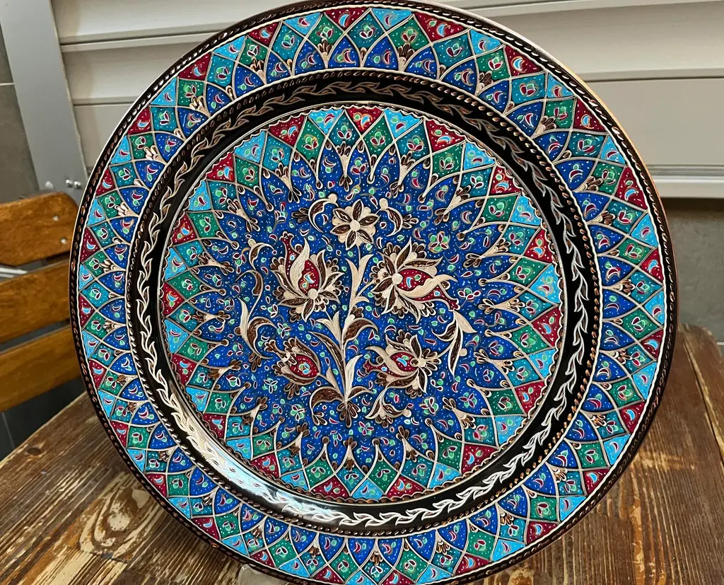 Handmade round metal tray made by copper. Special flower design for wall hanging. Great for displaying your unique decoration. Hand painted plates can be hung to create wonderful wall art. There is an insert on the back of the plate for hanging. SIZE: 43 CM / 17 INCH My items are all unique and one of a kind. You can wash my items with your hand and you need to dry it properly. All hand painted, hand carved, varnished and waterproof.