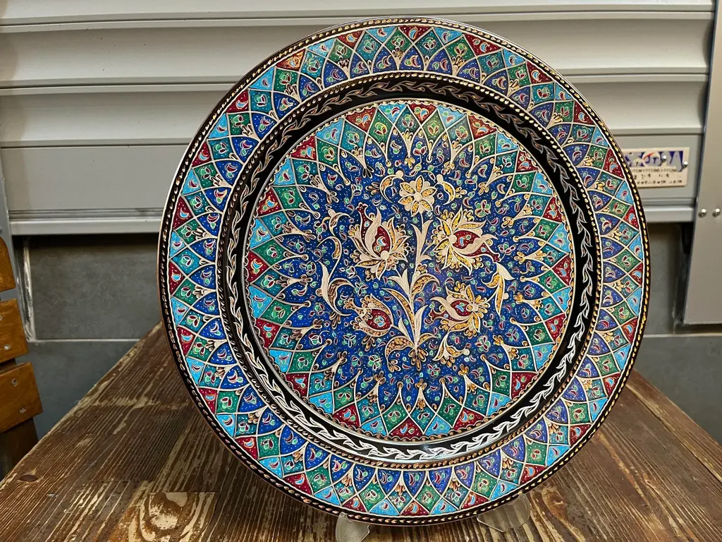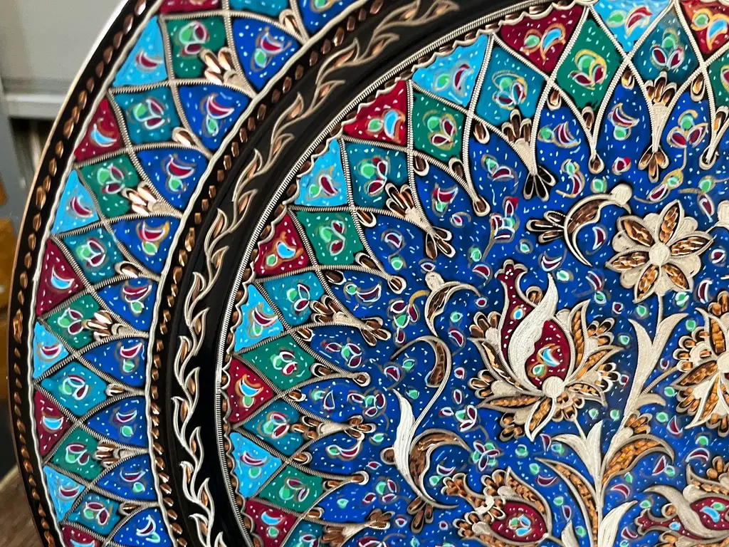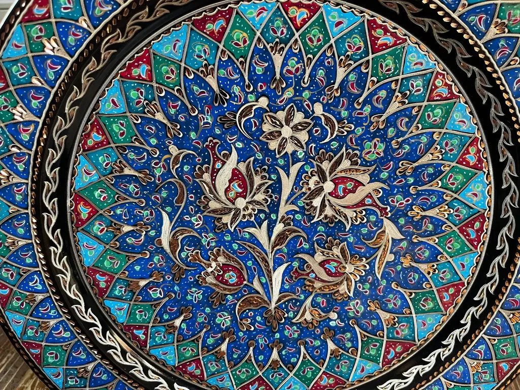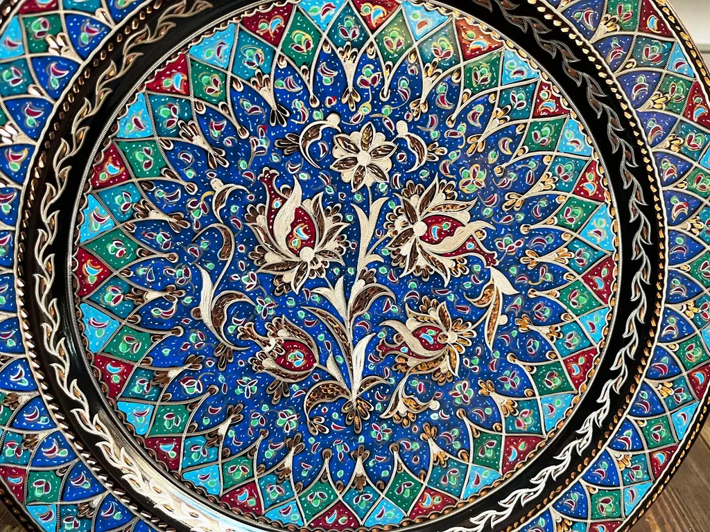 Handmade round metal tray made by copper. Special flower design for wall hanging. Great for displaying your unique decoration. Hand painted plates can be hung to create wonderful wall art. There is an insert on the back of the plate for hanging. SIZE: 43 CM / 17 INCH My items are all unique and one of a kind. You can wash my items with your hand and you need to dry it properly. All hand painted, hand carved, varnished and waterproof.