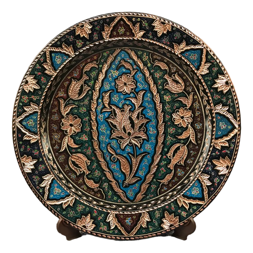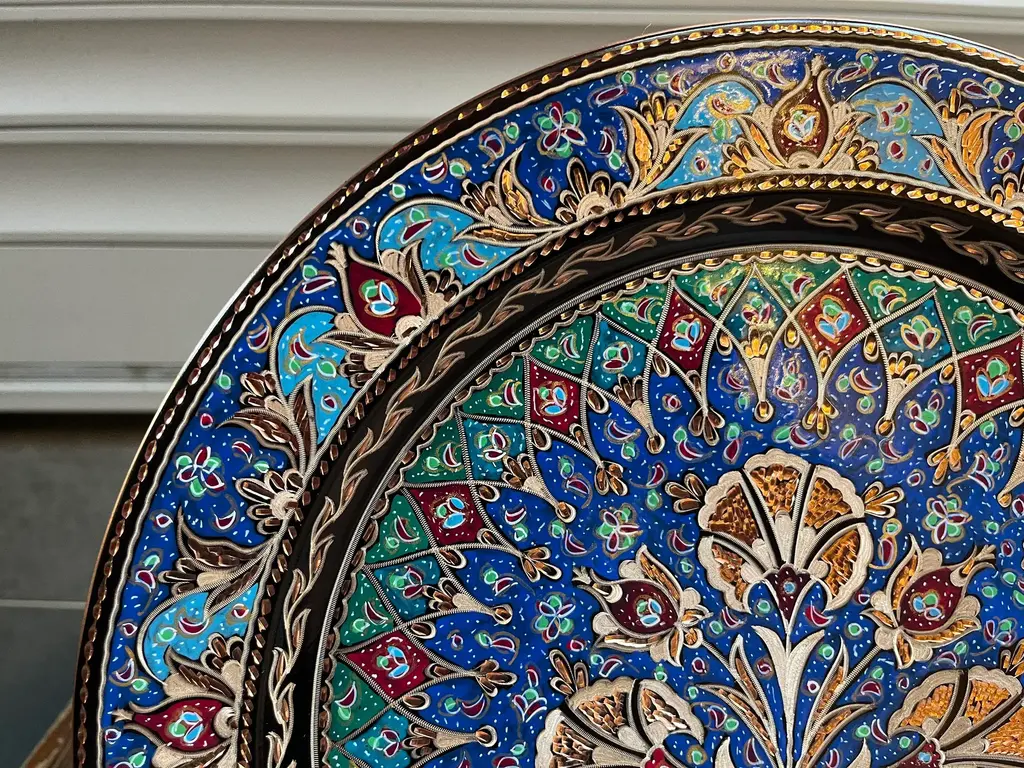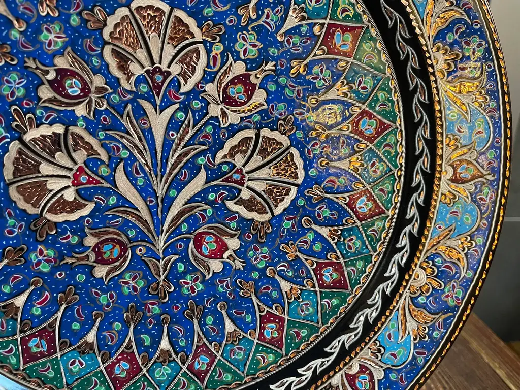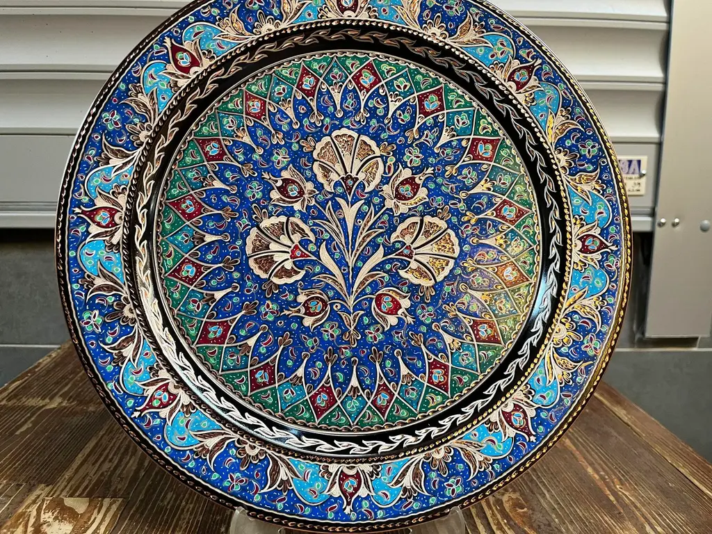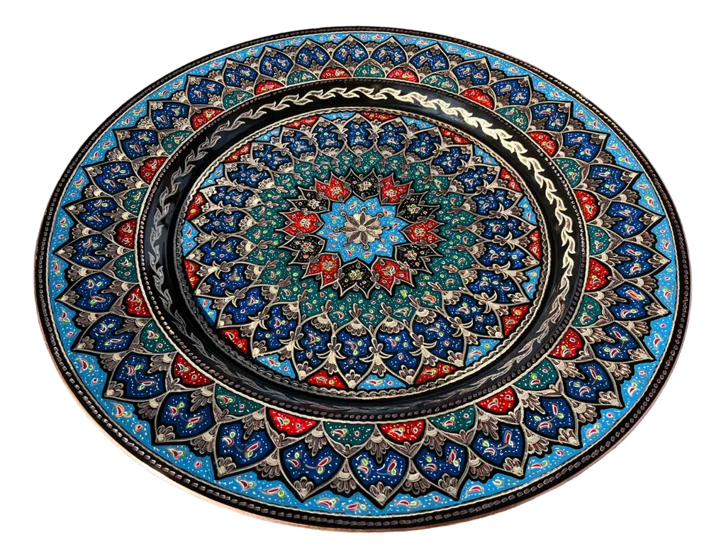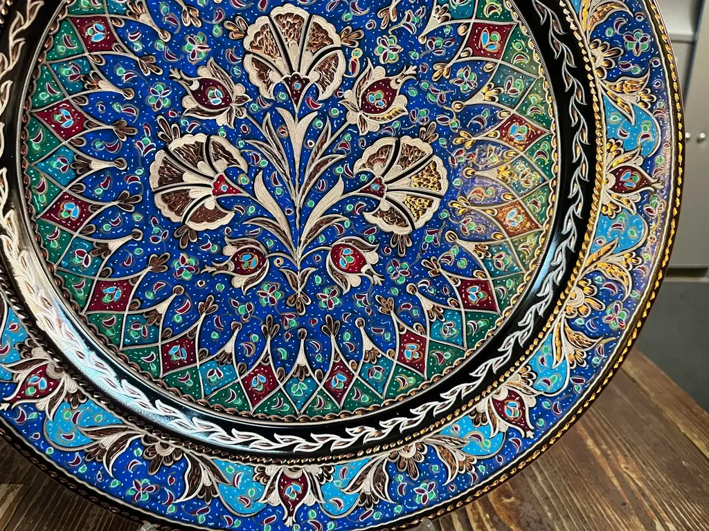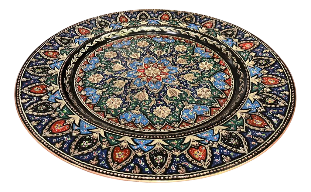 Handmade round tray made by copper. Special flower design for wall hanging. Great for displaying your unique decoration. Hand painted plates can be hung to create wonderful wall art. There is an insert on the back of the plate for hanging. SIZE: 43 CM / 17 INCH My items are all unique and one of a kind. You can wash my items with your hand and you need to dry it properly. All hand painted, hand carved, varnished and waterproof.