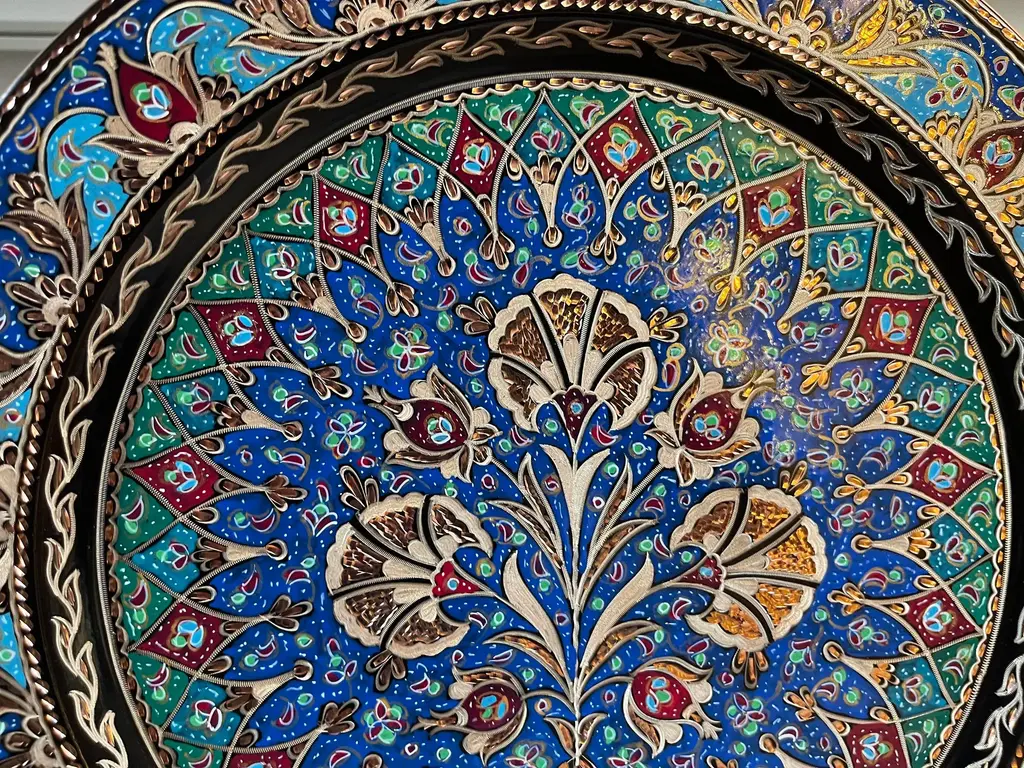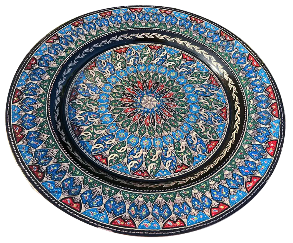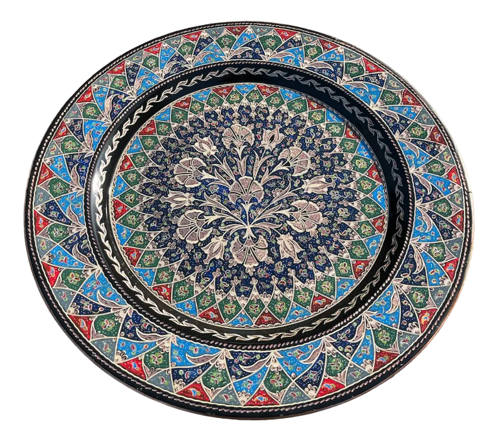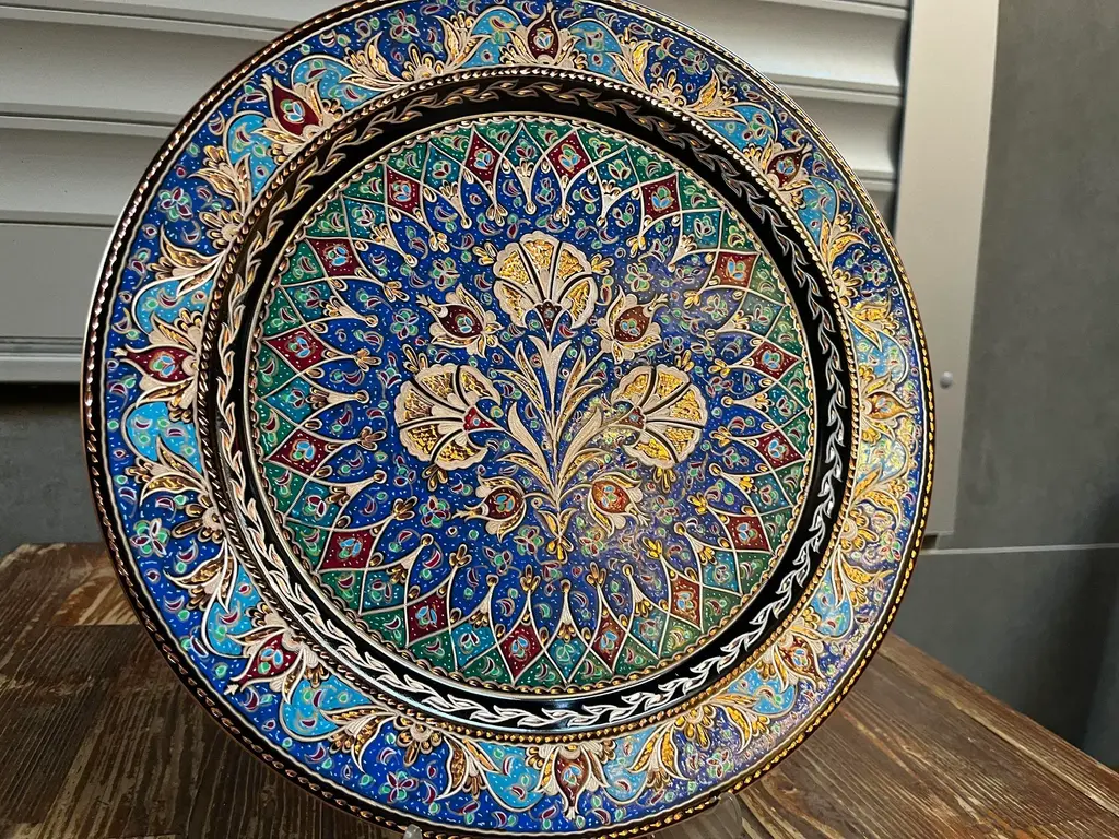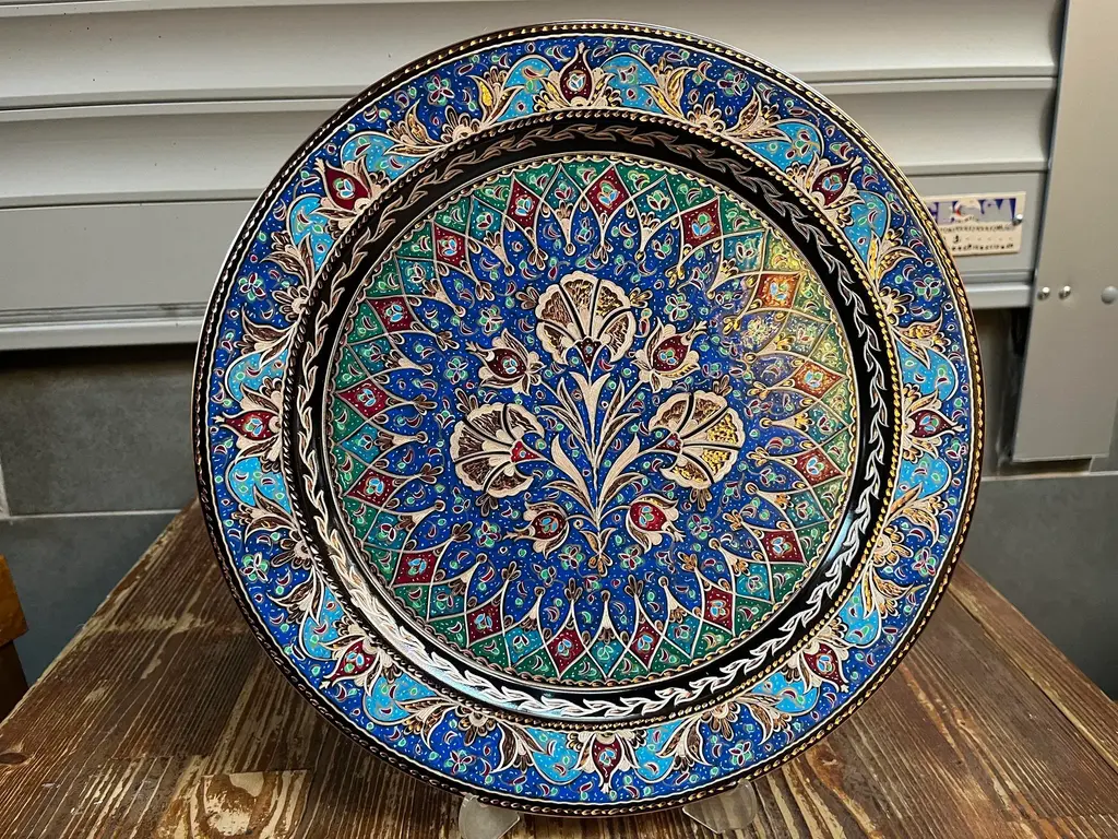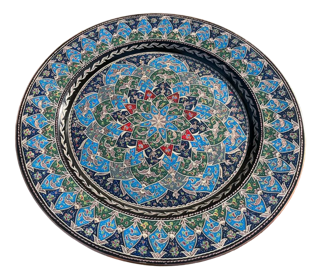 Handmade round tray made by copper. Special flower design for wall hanging. Great for displaying your unique decoration. Hand painted plates can be hung to create wonderful wall art. There is an insert on the back of the plate for hanging. SIZE: 43 CM / 17 INCH My items are all unique and one of a kind. You can wash my items with your hand and you need to dry it properly. All hand painted, hand carved, varnished and waterproof.