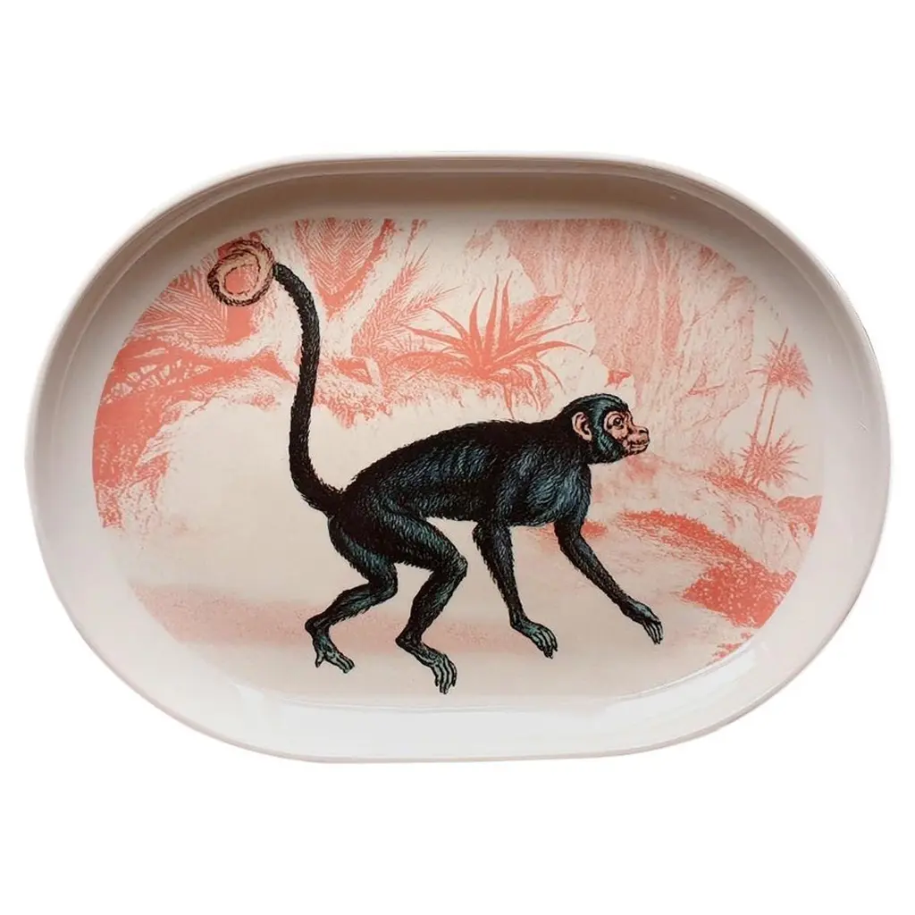 Add a touch of exotic elegance to your home with this hand-painted iron tray. Set against a sleek black background with gold accents, the design features a tropical palm tree and a monkey at the centre, bringing a sense of adventure and sophistication to any space. Perfect for serving drinks, displaying decorative items, or adding character to a coffee table or console. Please note: Due to the hand-painted nature of this product, no two trays are exactly the same, making each one truly one-of-a-kind.