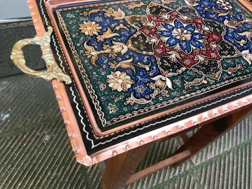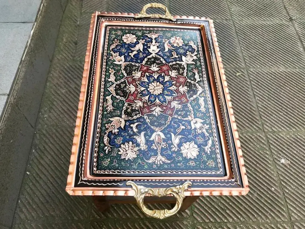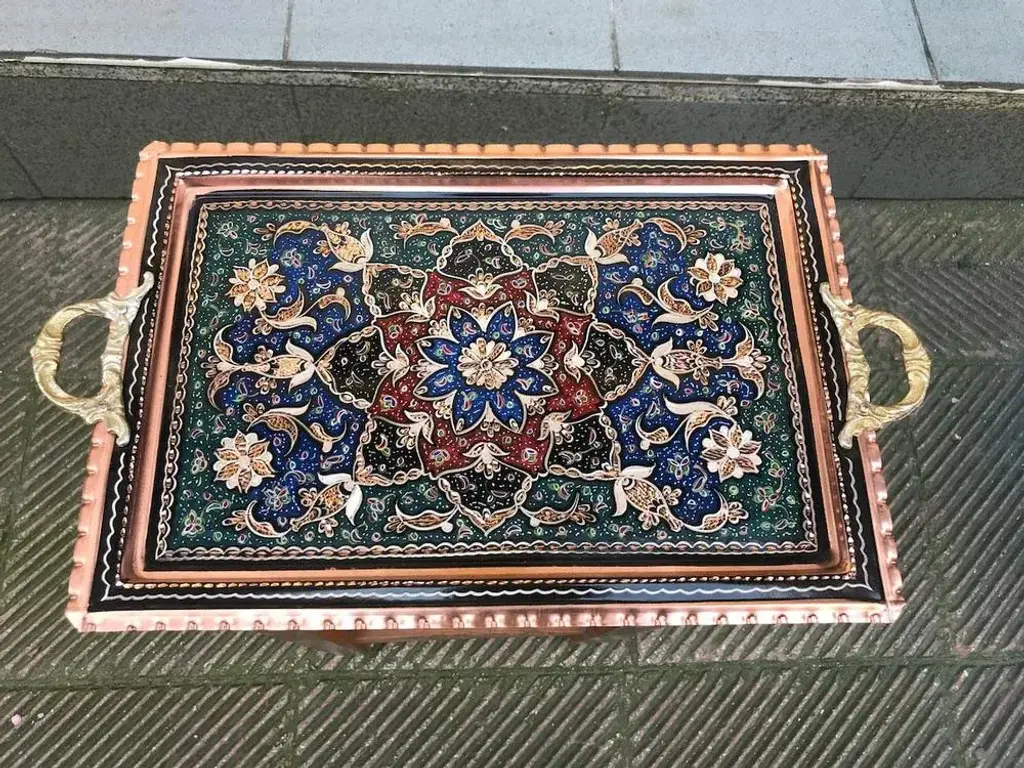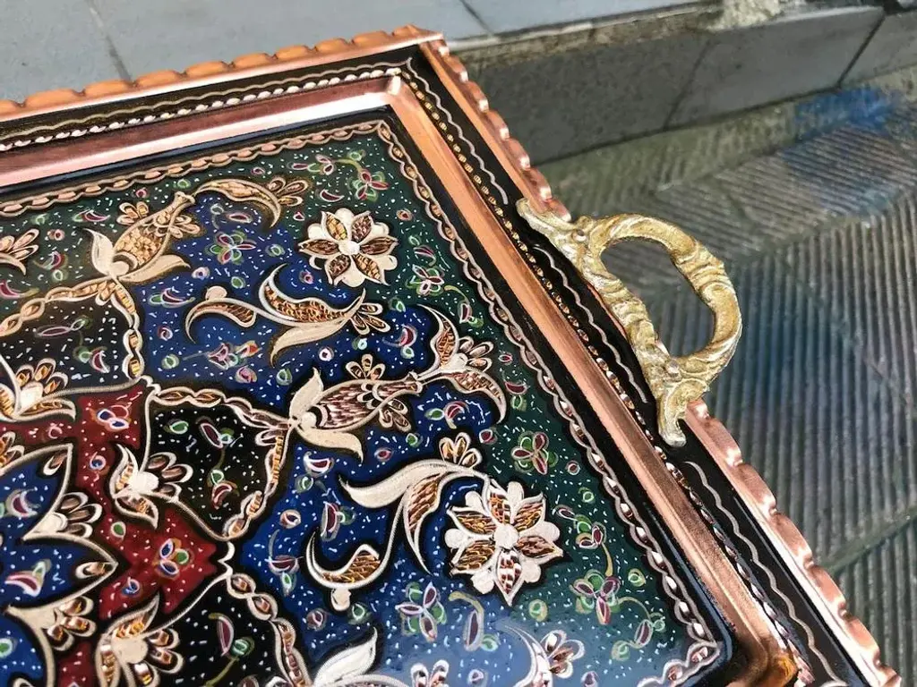 Unique decorative engraved tray with handles made by copper. Inlaid flower design and perfect for serving. Great for displaying your unique decoration. Would make a wonderful gift. Sizes; W:40 cm 15.7 inches H:26 cm 10.6 inches My items are all unique and one of a kind. You can wash my items with your hand and you need to dry it properly. All hand painted, hand carved, varnished and waterproof.