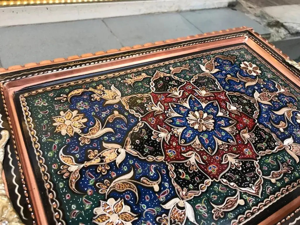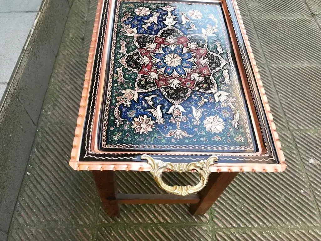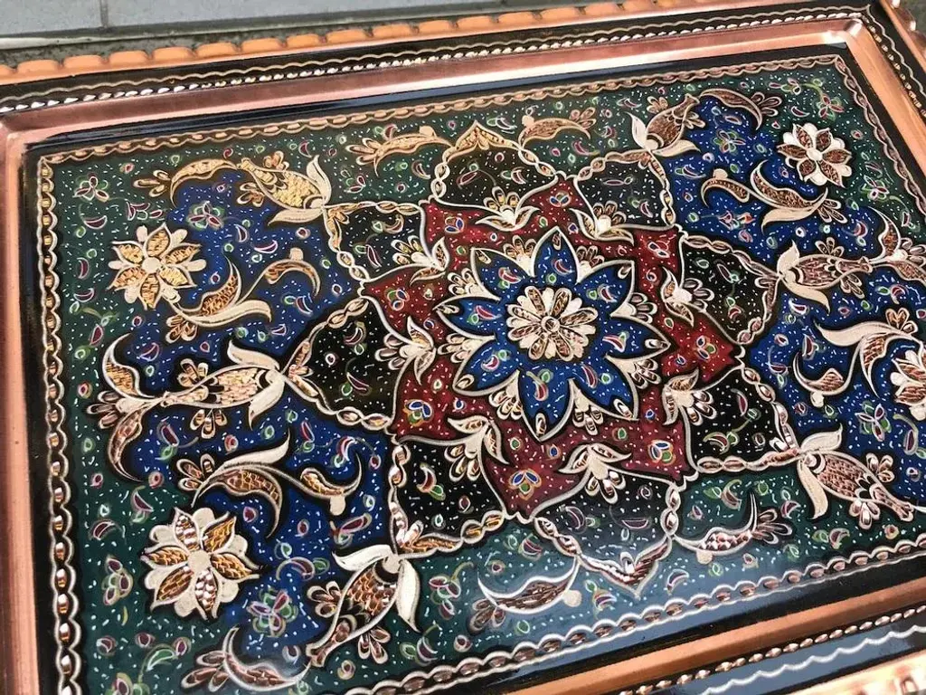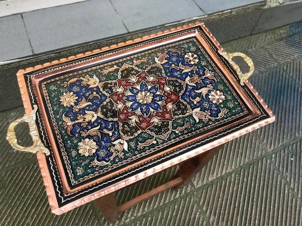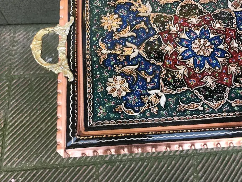 Unique decorative engraved tray with handles made by copper. Inlaid flower design and perfect for serving. Great for displaying your unique decoration. Would make a wonderful gift. Sizes; W:40 cm 15.7 inches H:26 cm 10.6 inches My items are all unique and one of a kind. You can wash my items with your hand and you need to dry it properly. All hand painted, hand carved, varnished and waterproof.