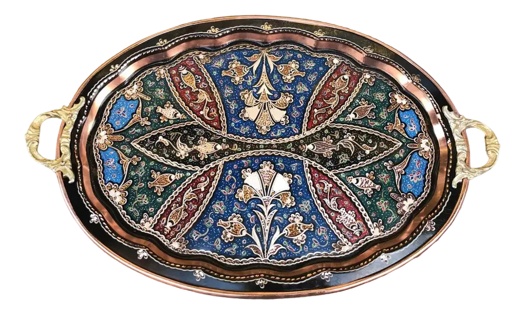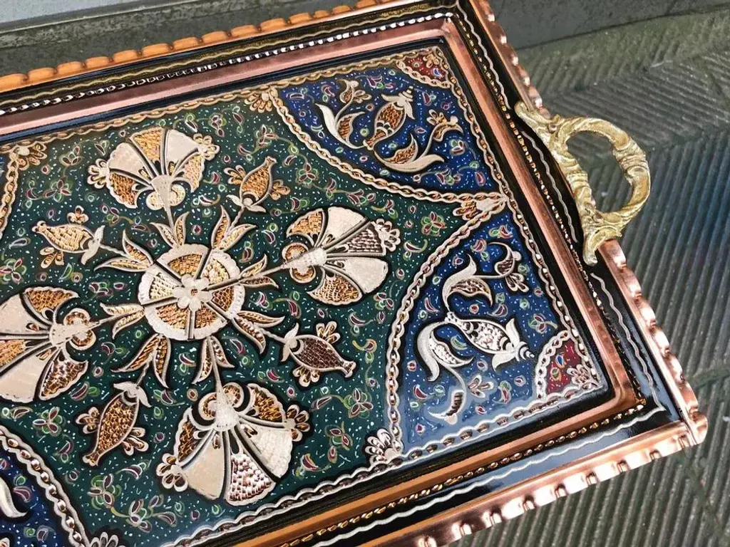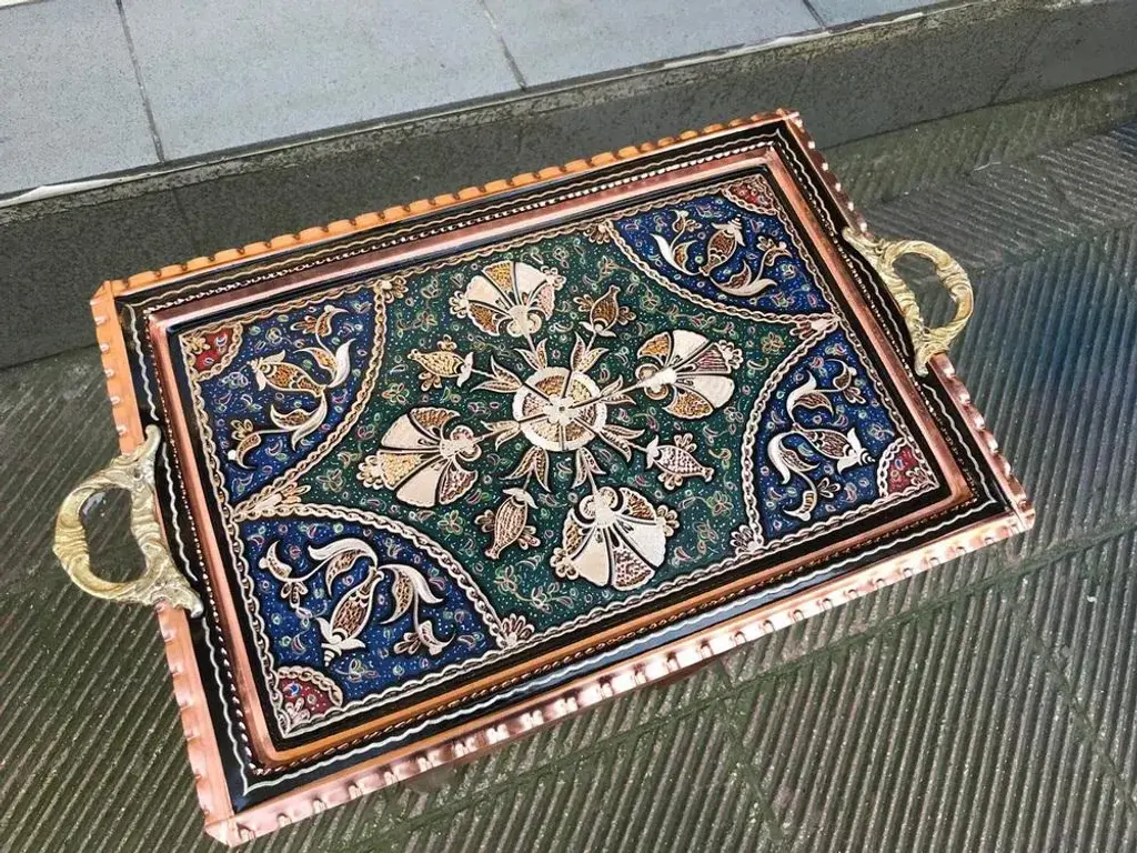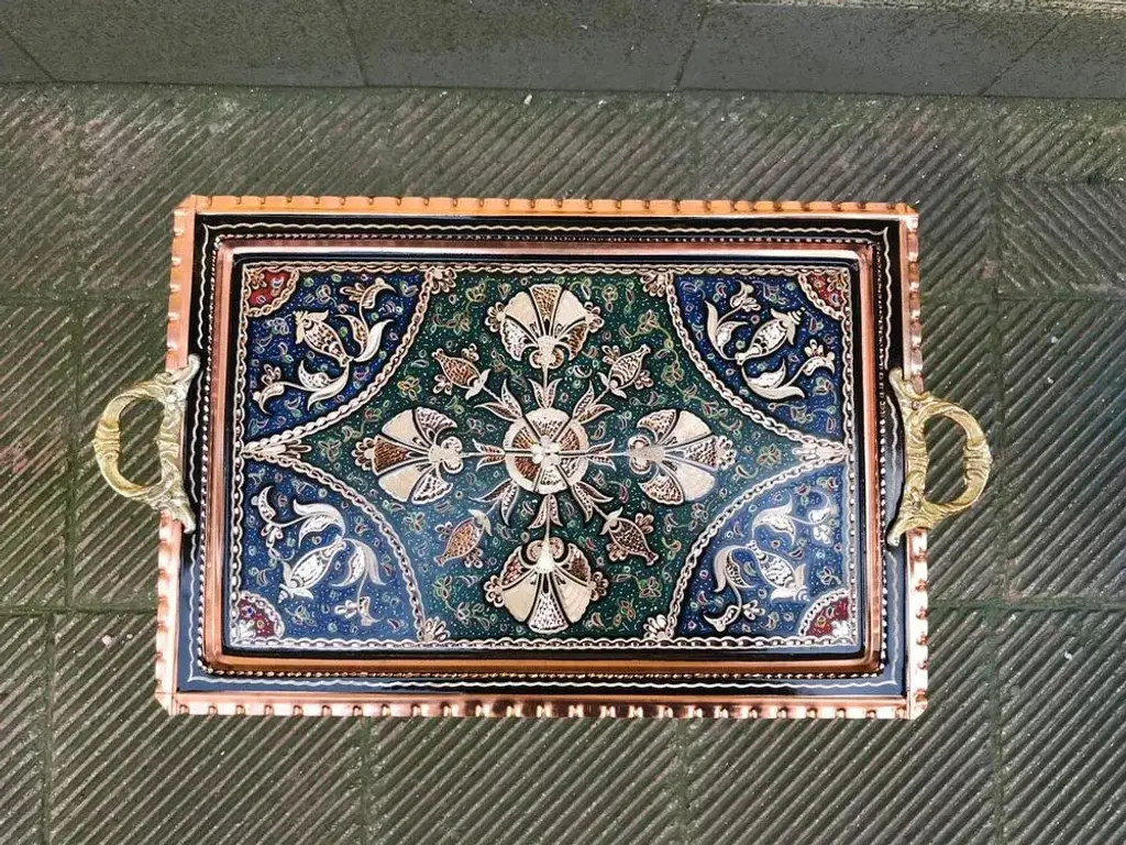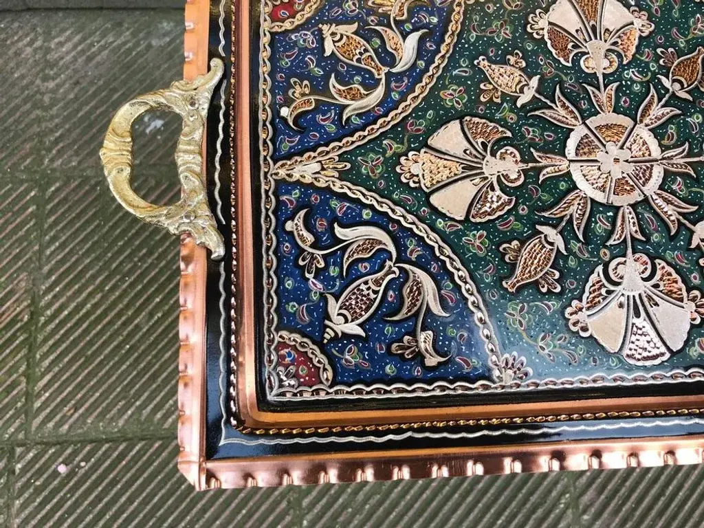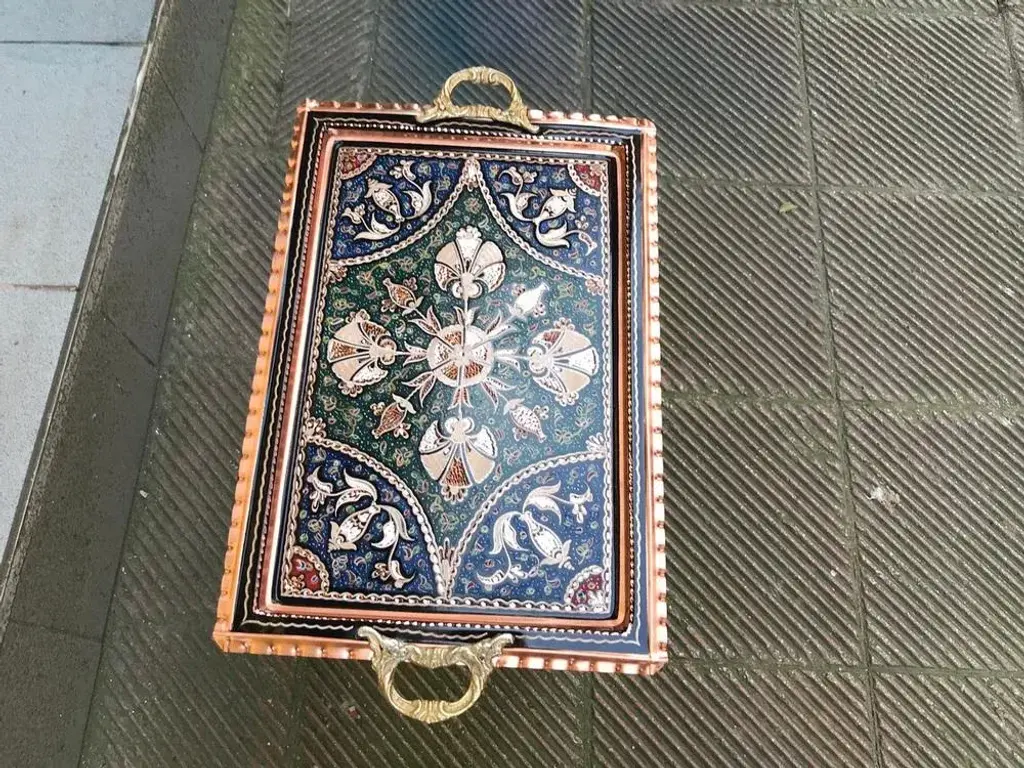 Rectangle One of a kind handmade tray with handles made by copper. Colorful etched clove design and perfect for serving. Great for displaying your unique decoration. Would make a wonderful gift. Sizes; W:40 cm 15.7 inches H:26 cm 10.6 inches My items are all unique and one of a kind. You can wash my items with your hand and you need to dry it properly. All hand painted, hand carved, varnished and waterproof.