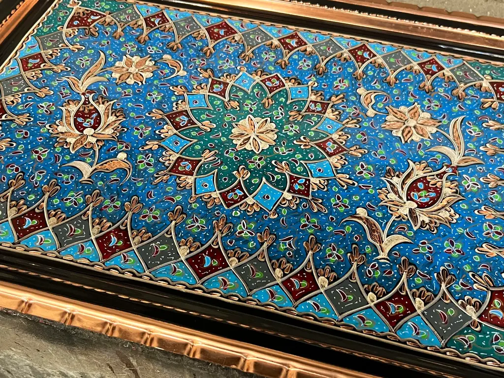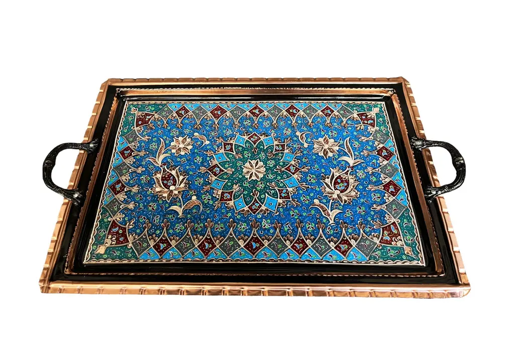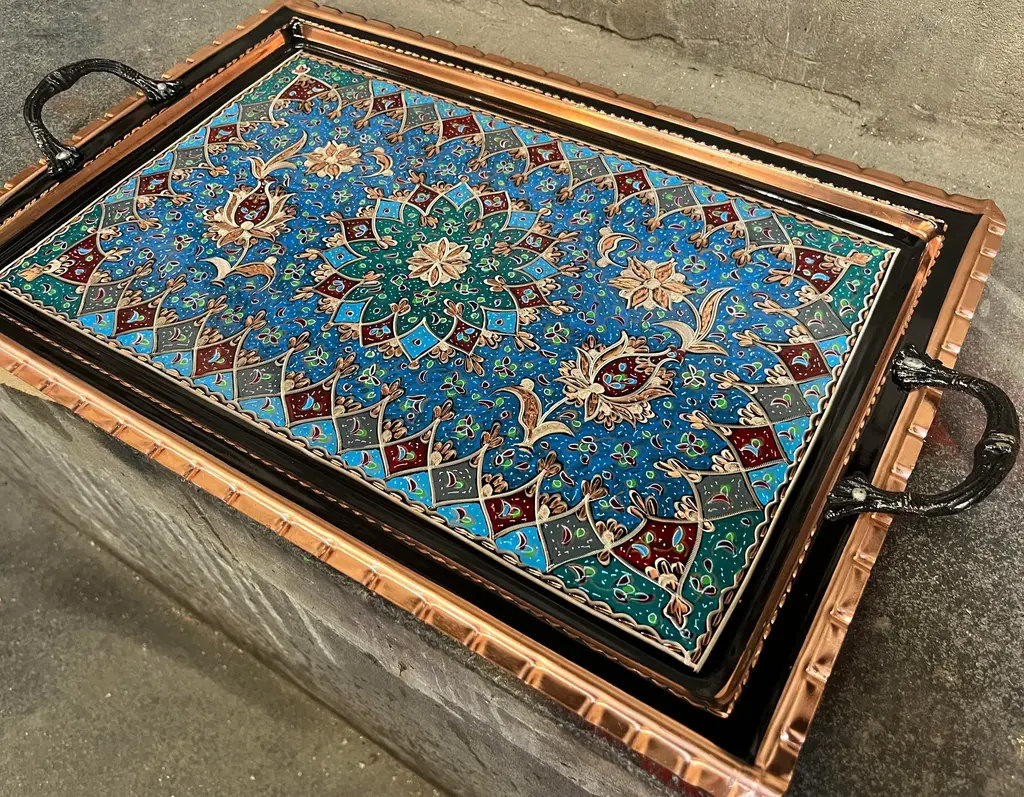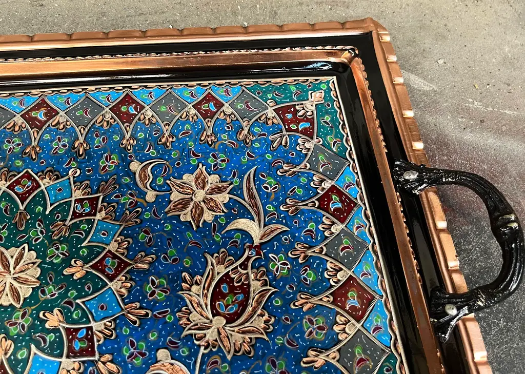 Floral hand carved tray with handles made by copper. Etched design and perfect for serving. Great for displaying your unique decoration. Would make a wonderful gift. Sizes; W:40 cm 15.7 inches H:27 cm 10.6 inches My items are all unique and one of a kind. You can wash my items with your hand and you need to dry it properly. All hand painted, hand carved, varnished and waterproof.