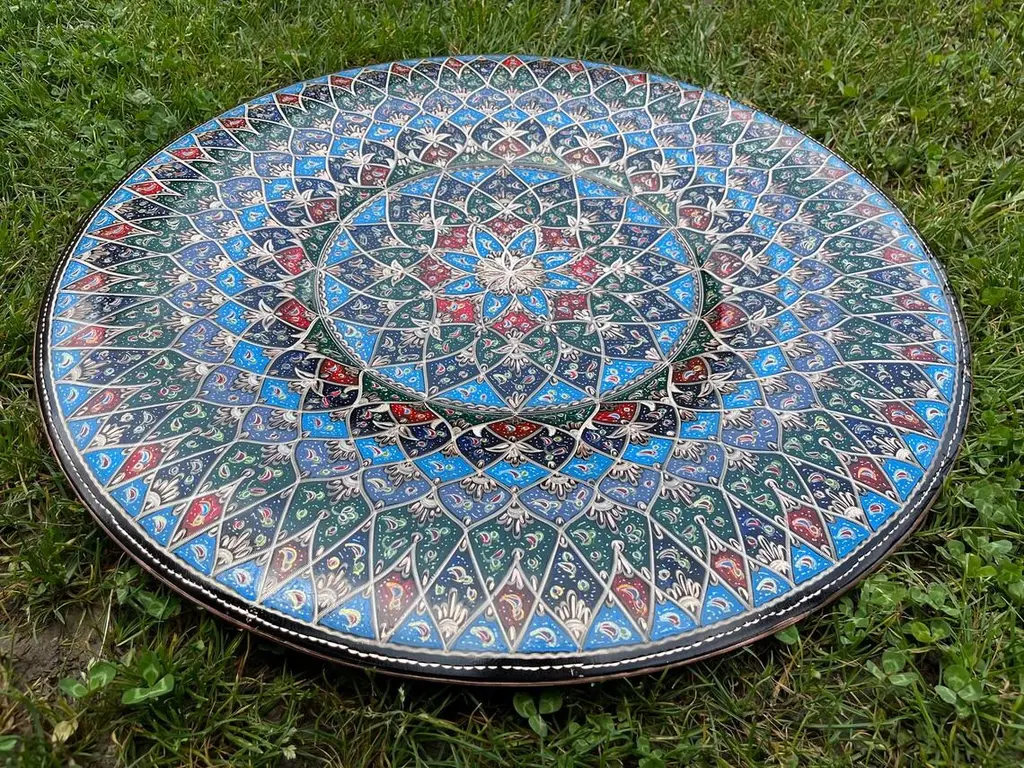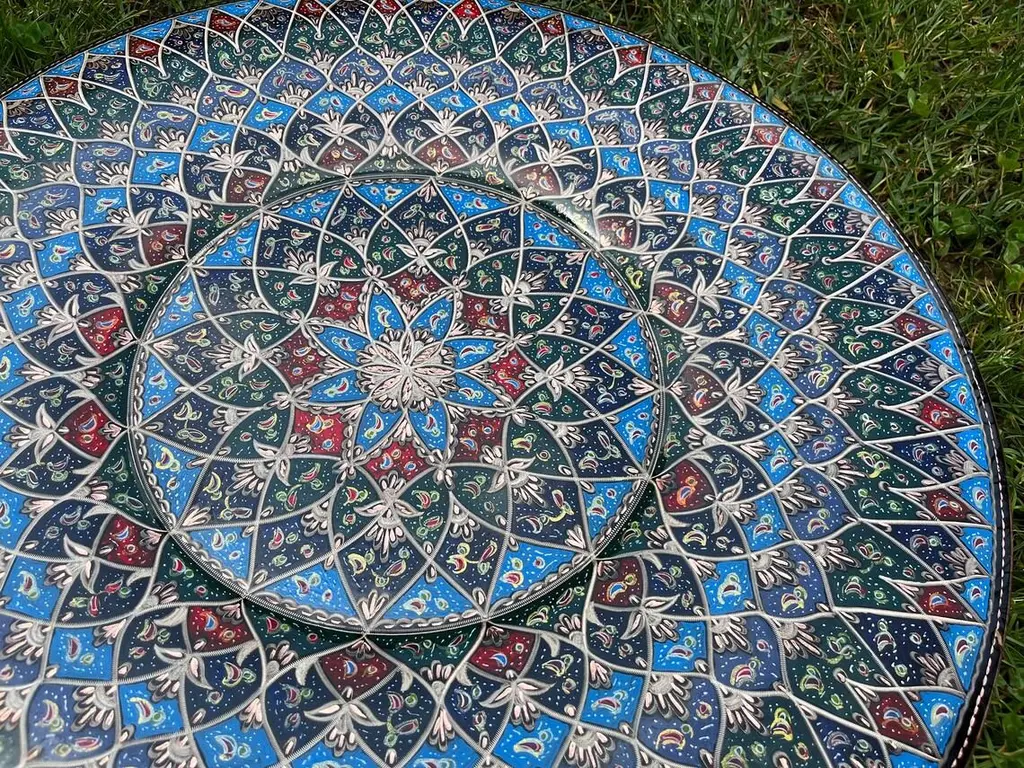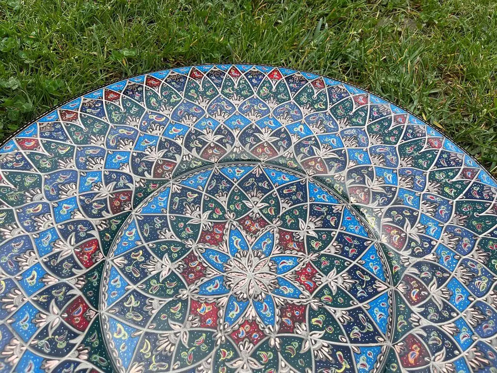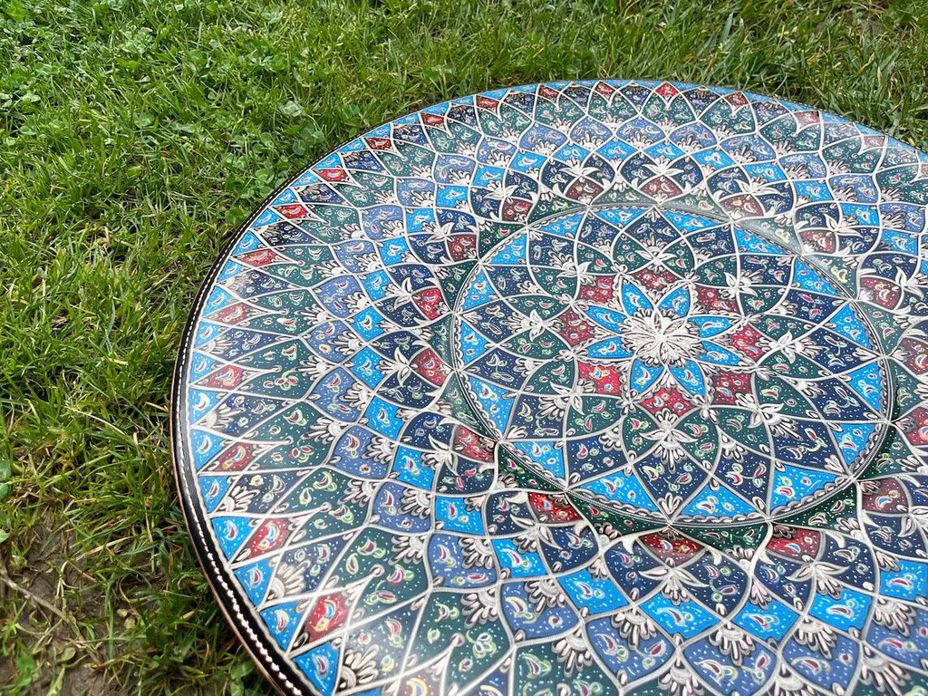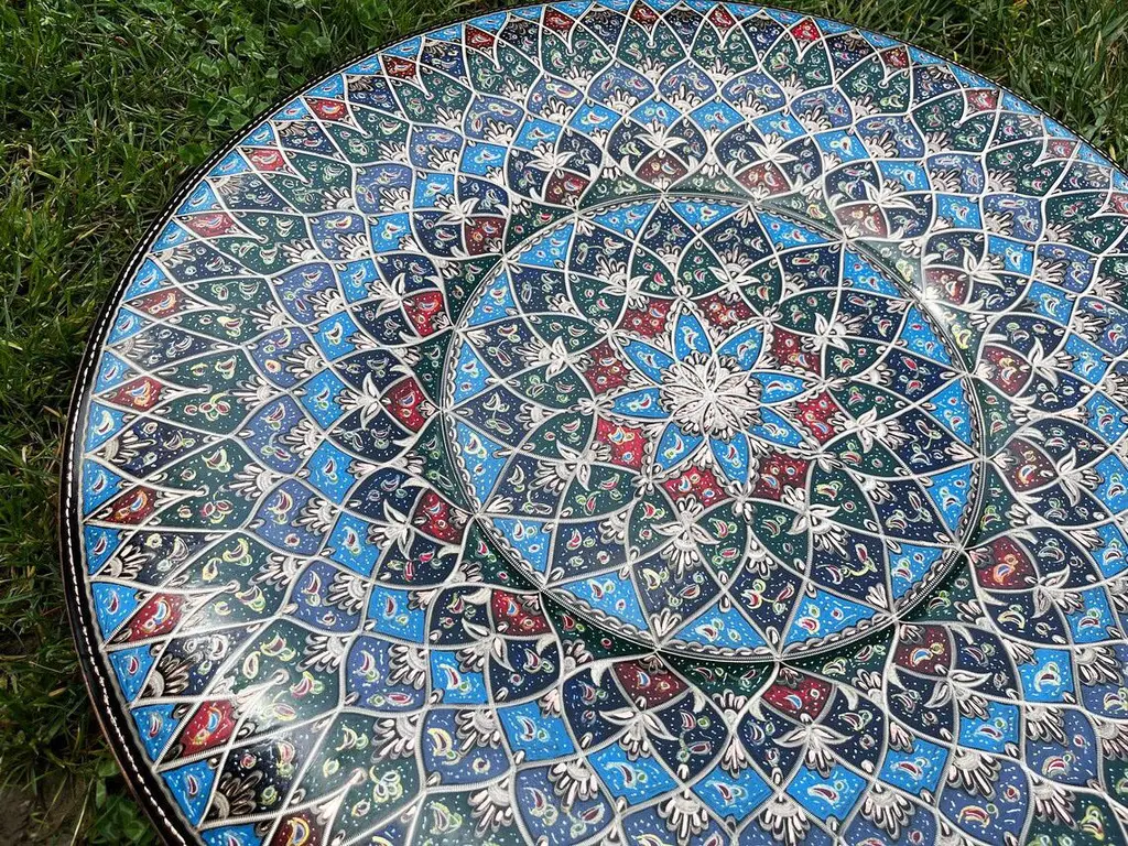 Floral Hand Carved large wall plate made by copper. Stylish flower design for wall hanging. Great for displaying your unique decoration. Hand painted tray can be hung to create wonderful wall art. There is an insert on the back of the plate for hanging. SIZE: 43 CM / 17 INCH My items are all unique and one of a kind. You can wash my items with your hand and you need to dry it properly. All hand painted, hand carved, varnished and waterproof.