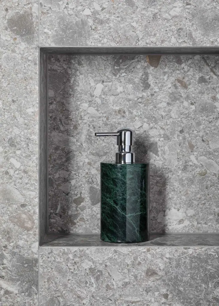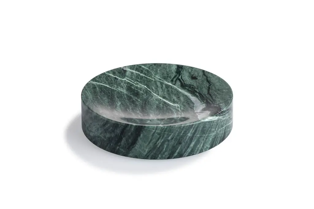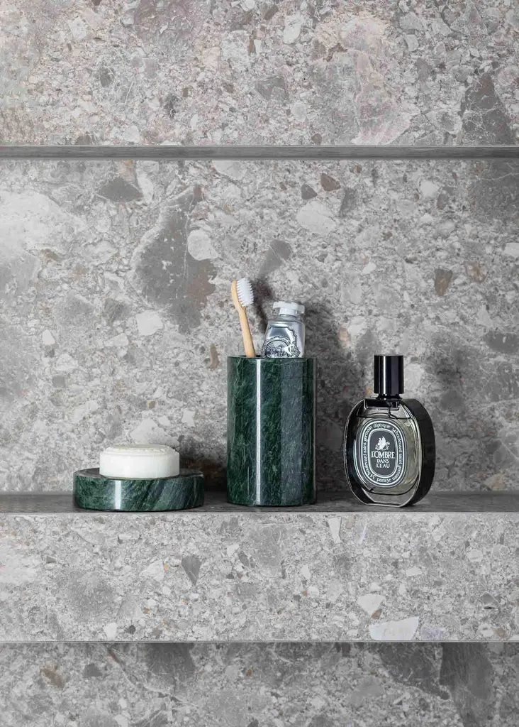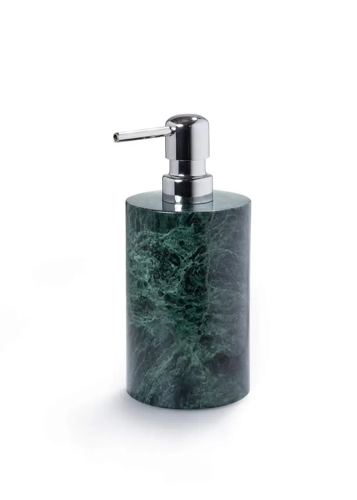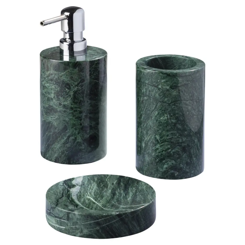 Crafted from elegant Green Guatemala marble, this deluxe bathroom set is designed to enhance both the beauty and functionality of your bathroom, spa, or hotel.The set includes a square tray, soap dispenser, soap dish, toothbrush holder. All four pieces are crafted from polished Green Guatemala marble, adding an elegant touch to the decor of your contemporary or classic-style bathroom.Due to the unique veining of the marble, each item in the set is truly one-of-a-kind. Please note that these items are not dishwasher safe and should be cleaned with water and a delicate, natural soap.