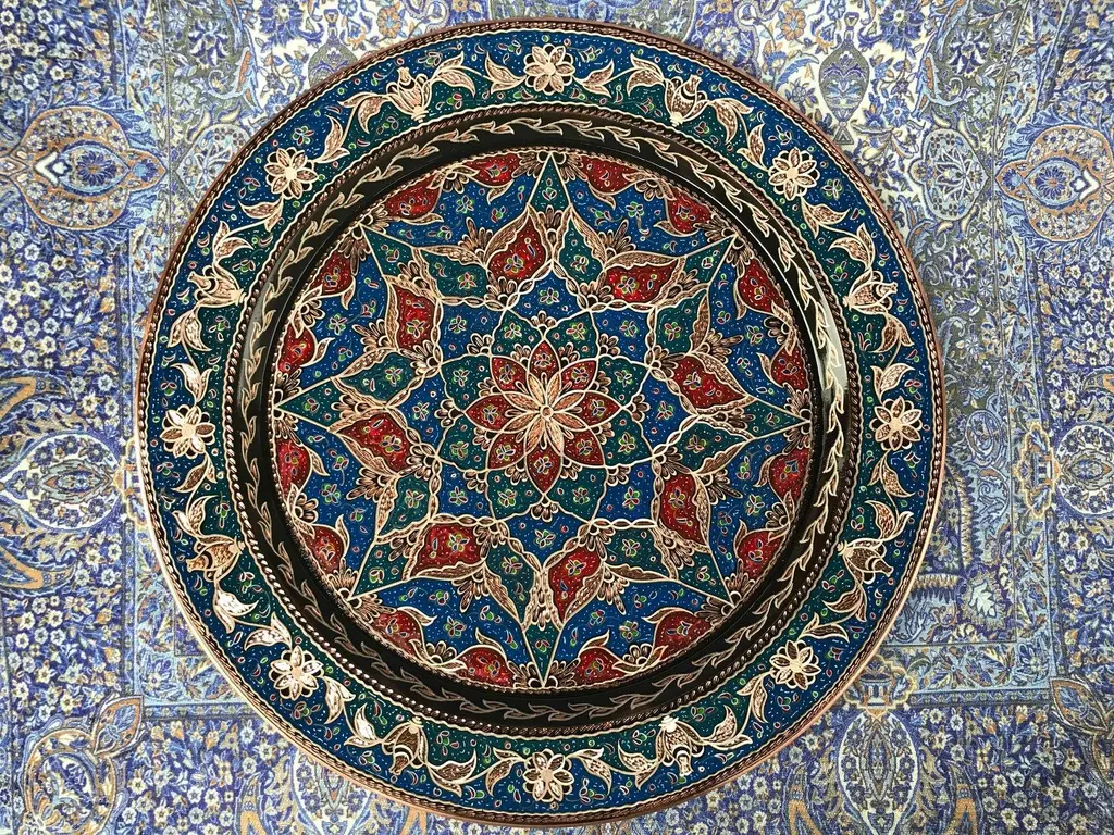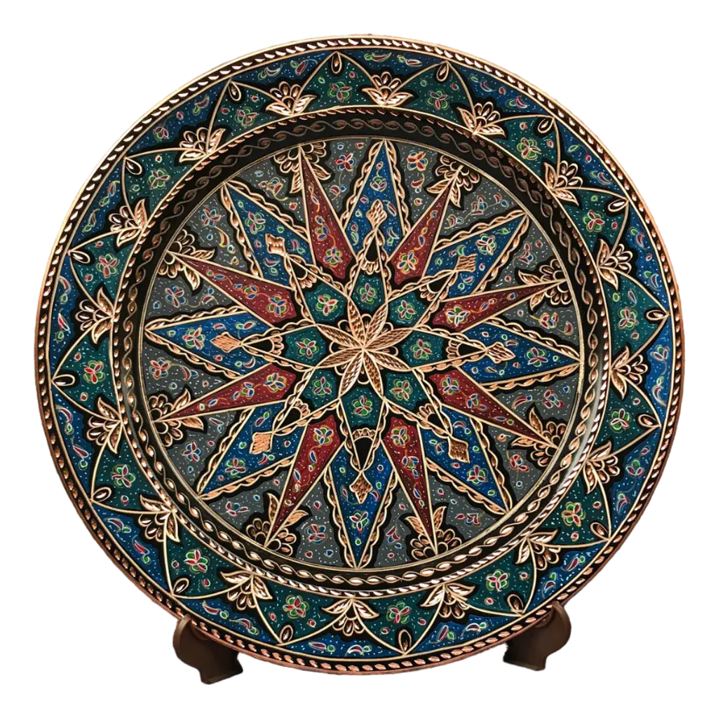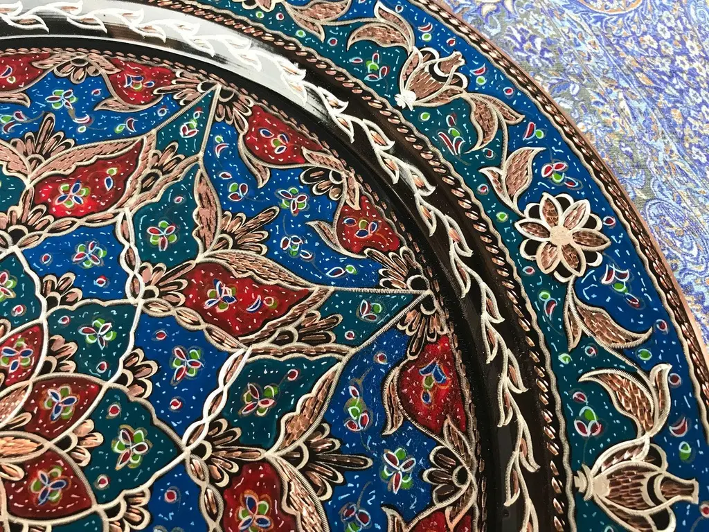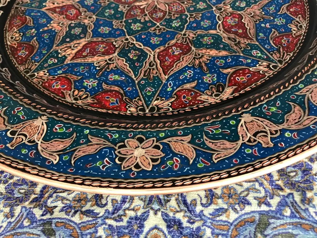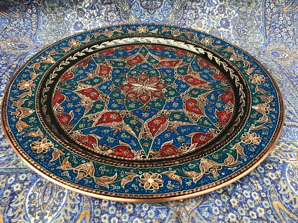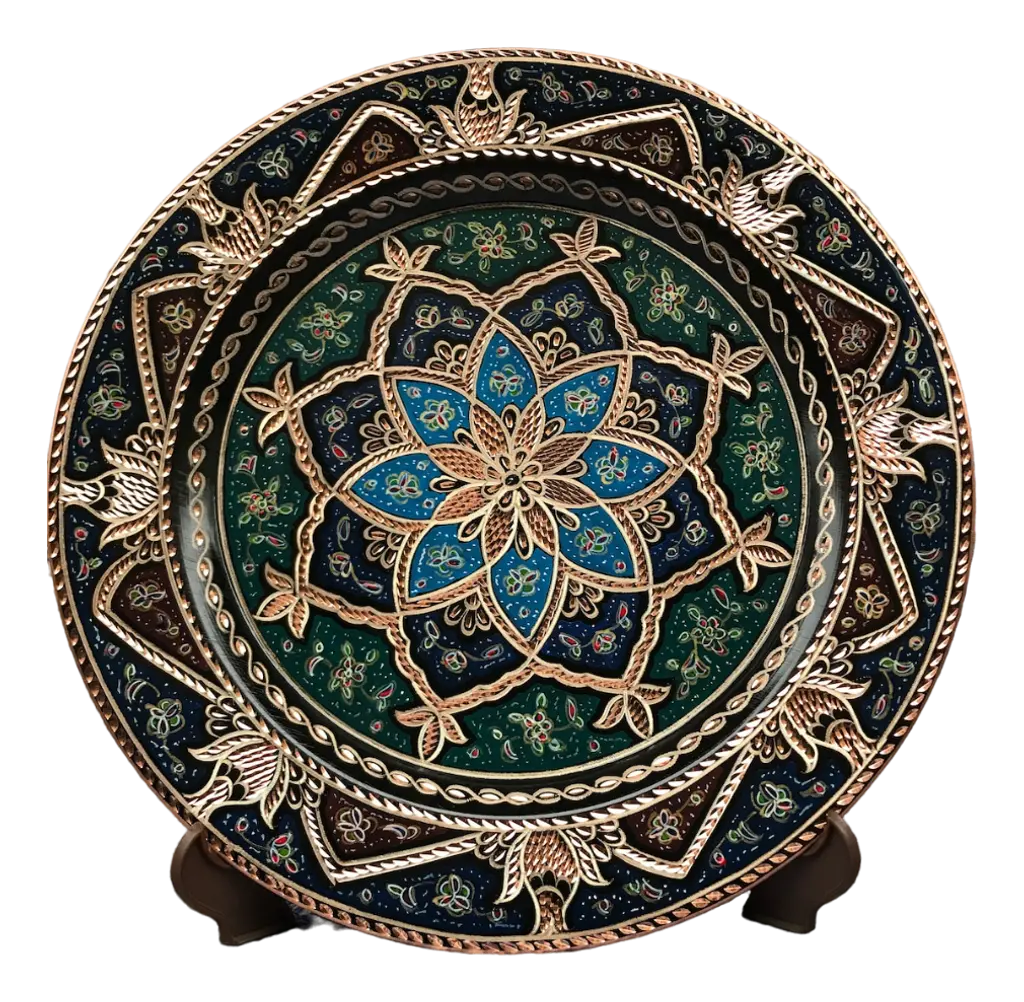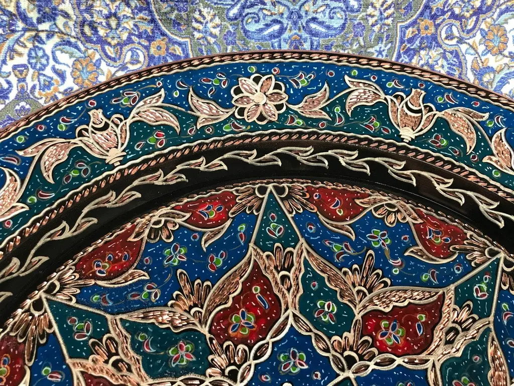 Turkish wall plate made by copper. Colorful design for wall hanging. Great for displaying your unique decoration. Hand painted plates can be hung to create wonderful wall art. There is an insert on the back of the plate for hanging. SIZE: 43 CM / 17 INCH
