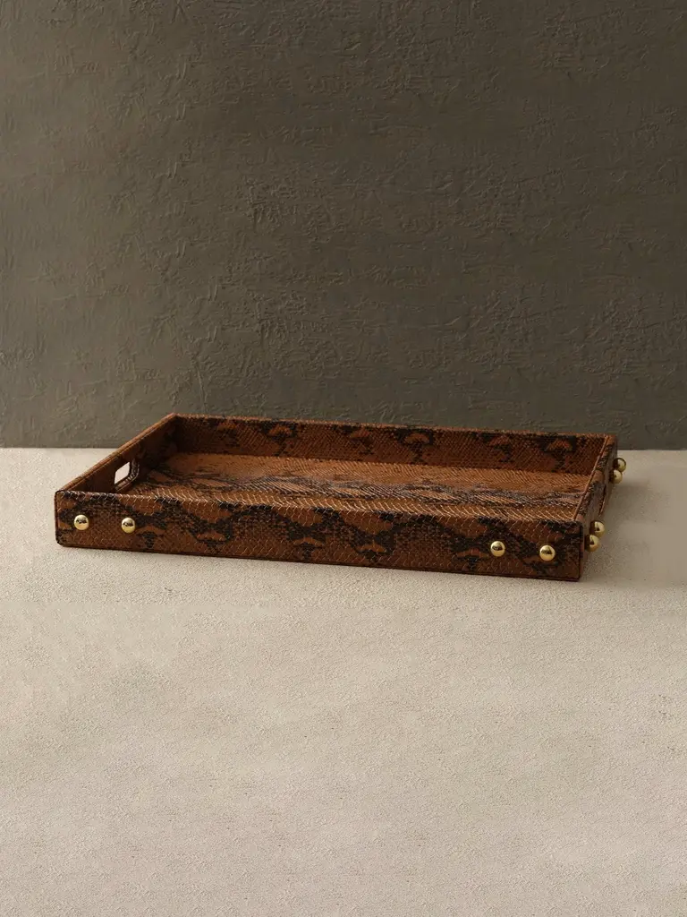 Elevate your tabletop with this boldly patterned Large Leather Tray in a rich snake print finish. Designed for those who appreciate texture and statement accents, this tray is edged with gleaming brass studs and fitted with sleek cutout handles for practical elegance. Whether styled as a centerpiece on a coffee table, used to serve drinks, or to organize vanity essentials, its structured form and luxurious finish bring instant character to any setting.