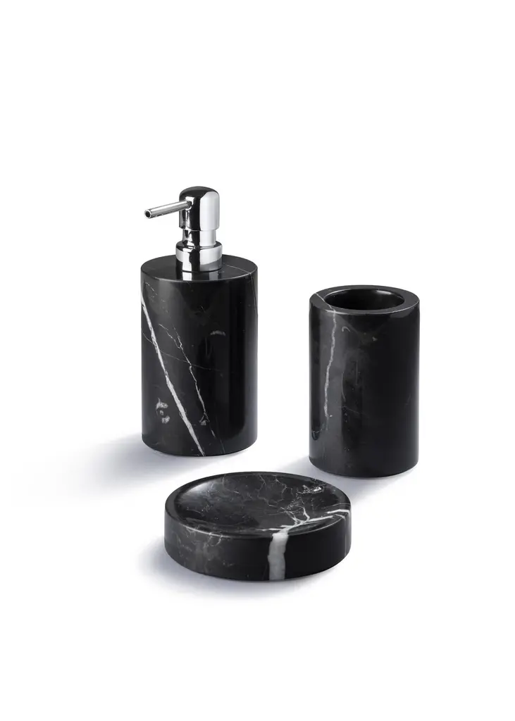 Crafted from elegant Black Marquina marble, this deluxe bathroom set is designed to enhance both the beauty and functionality of your bathroom, spa, or hotel.The set includes a round tray, soap dispenser, soap dish, toothbrush holder. All four pieces are crafted from polished Black Marquina marble, adding an elegant touch to the decor of your contemporary or classic-style bathroom.Due to the unique veining of the marble, each item in the set is truly one-of-a-kind. Please note that these items are not dishwasher safe and should be cleaned with water and a delicate, natural soap.