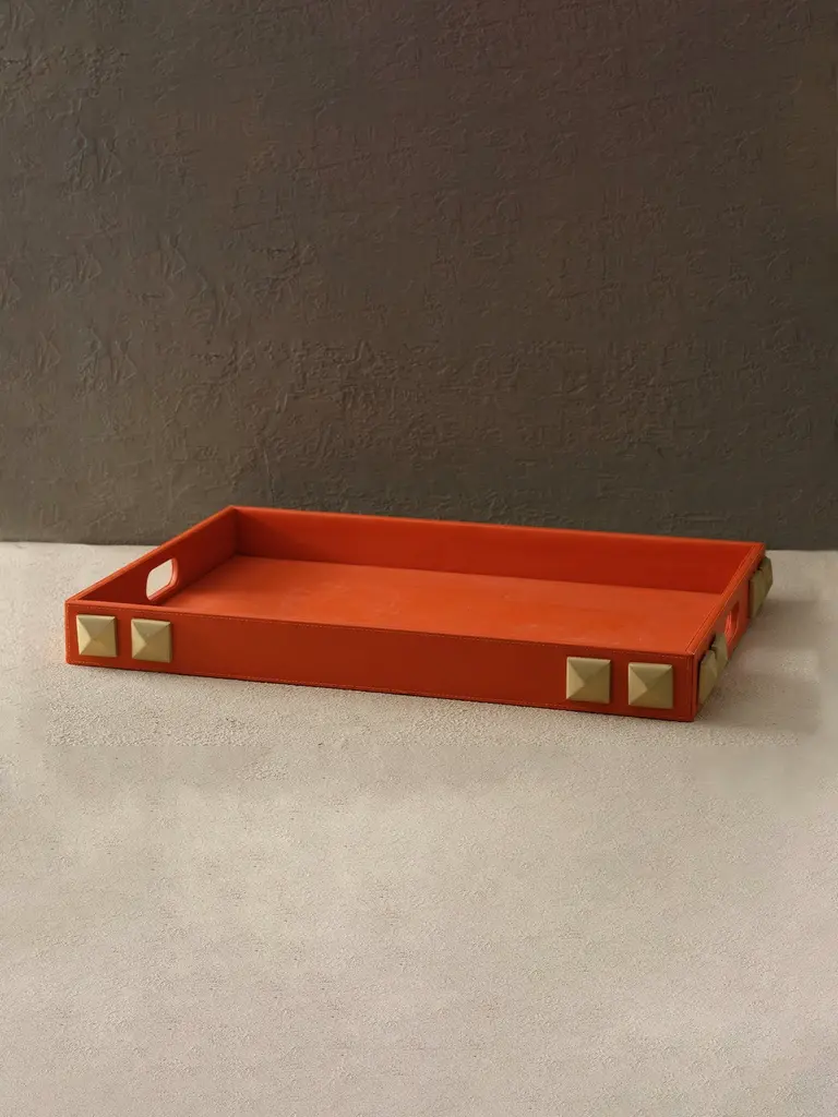 Handmade Orange Leather Tray – Pyramid Brass Stud Accents