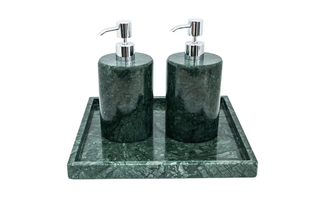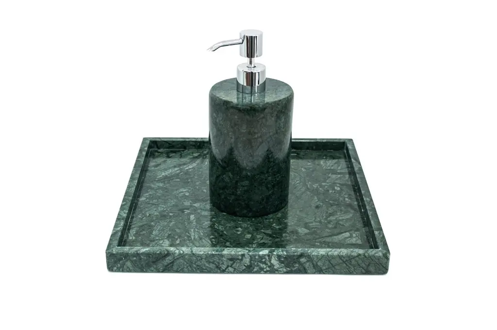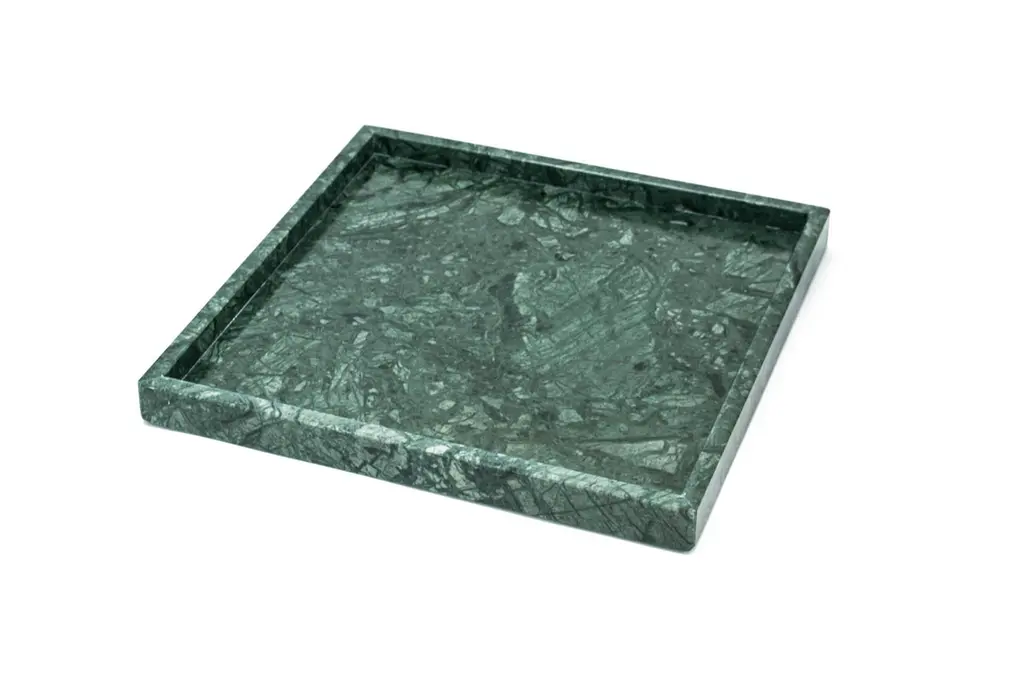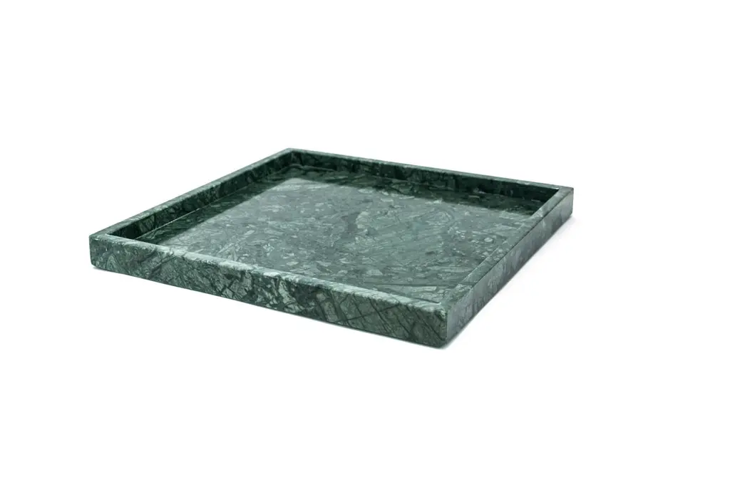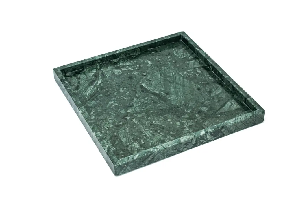 Squared green Guatemala marble tray, ideal for spa, in the bathroom but also as a table centerpiece or in the entrance as a dresser valet. Each piece is in a way unique (every marble block is different in veins and shades) and handmade by Italian artisans specialized over generations in processing marble. Slight variations in shape, color and size are to be considered a guarantee of a handmade creation.Important: Do not use lemon or vinegar on it, clean only with water and natural soap (like Marseilles soap), do not put in dishwasher.This object gives a distinct touch to your house, spa and can be used in the kitchen, on the table or near the bathroom sink.