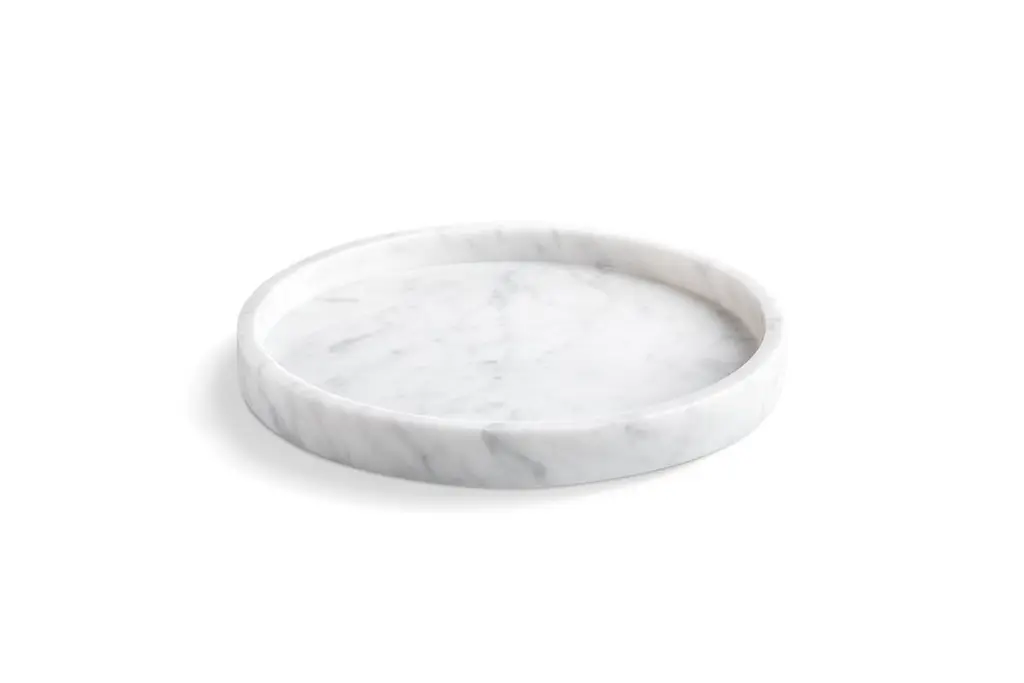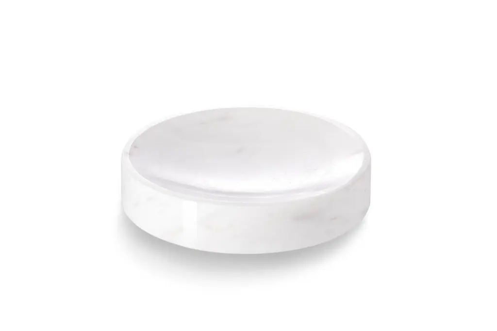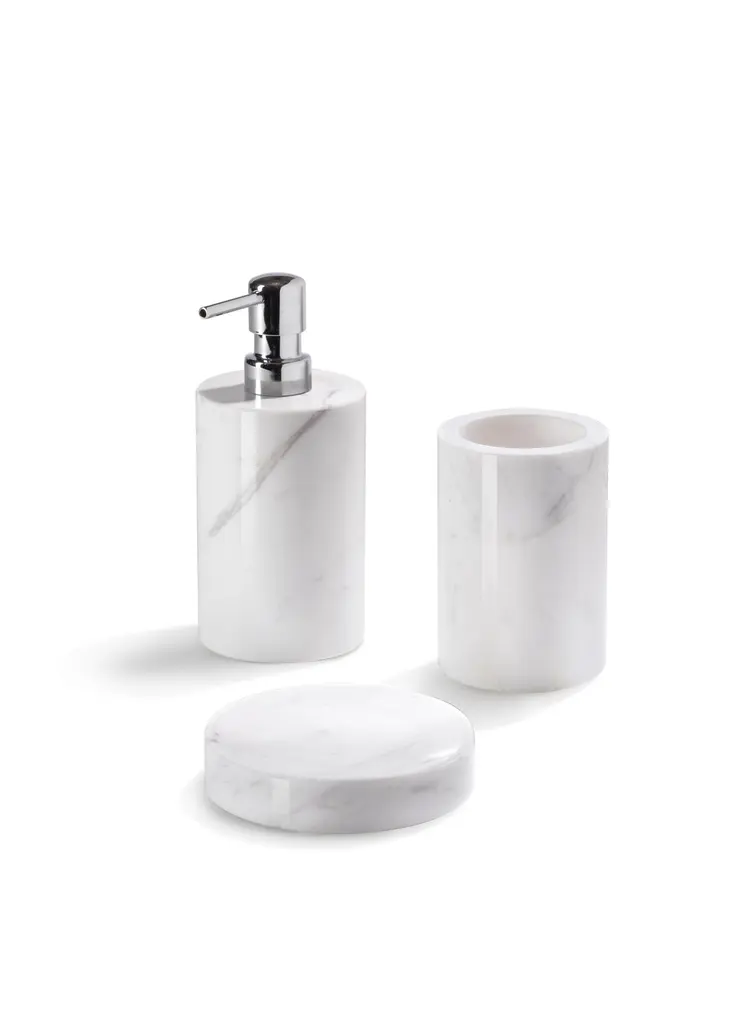 Crafted from elegant white marble, this deluxe bathroom set is designed to enhance both the beauty and functionality of your bathroom, spa, or hotel.The set includes a round tray, soap dispenser, soap dish, toothbrush holder. All four pieces are crafted from polished white marble, adding an elegant touch to the decor of your contemporary or classic-style bathroom.Due to the unique veining of the marble, each item in the set is truly one-of-a-kind. Please note that these items are not dishwasher safe and should be cleaned with water and a delicate, natural soap.