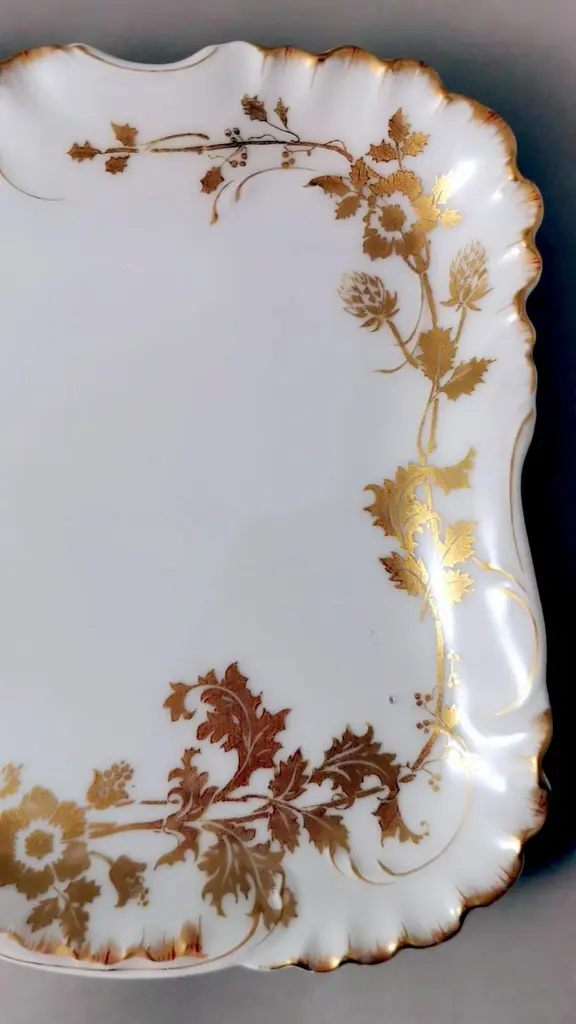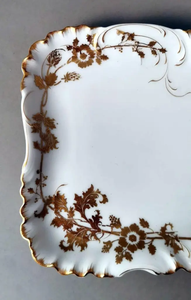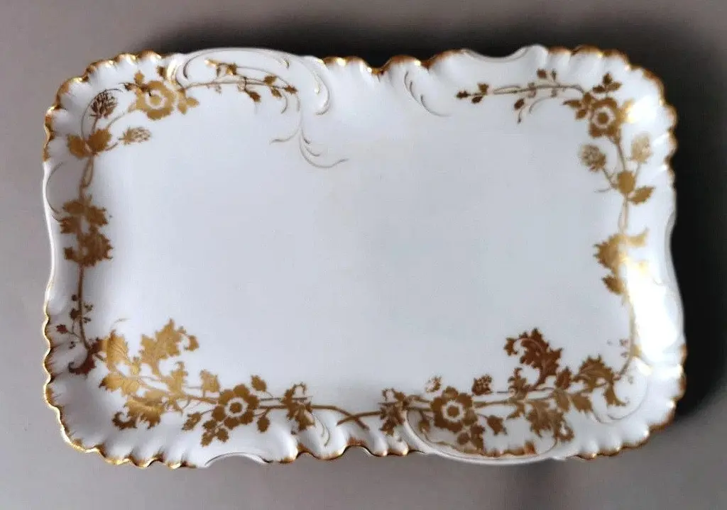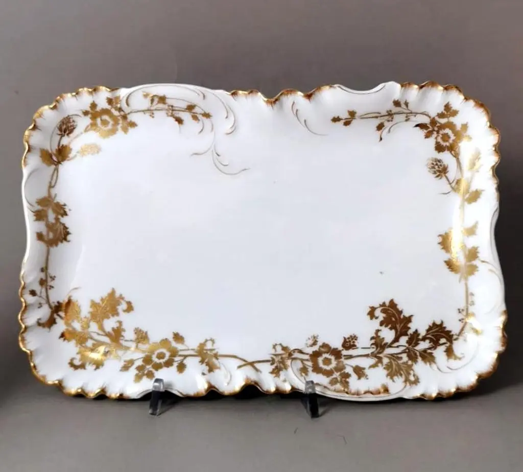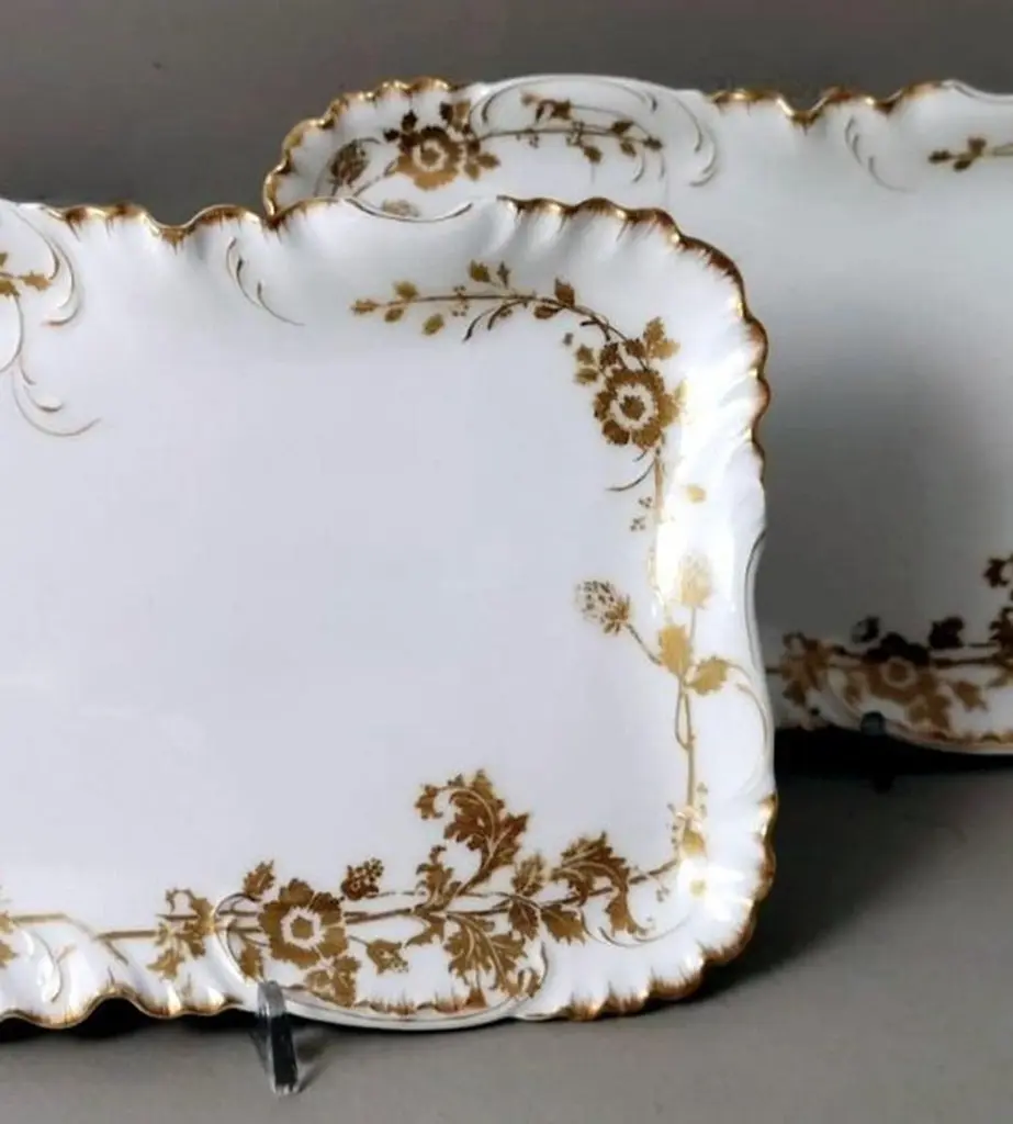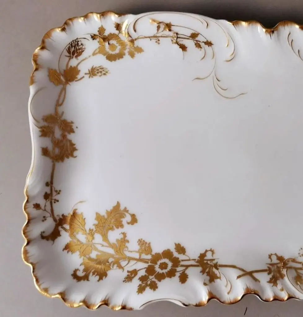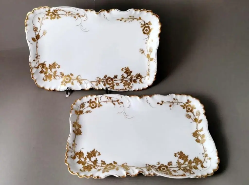 We kindly suggest that you read the entire description, as with it we try to give you detailed technical and historical information to ensure the authenticity of our objects.We would like to inform you that the objects, described below, were part of a complete service that we divided and we offer the loose sale of the individual pieces. Pair of elegant white Limoges porcelain trays; they are rectangular in shape but the rim has been skillfully shaped and shaped in a personal, refined, and sophisticated manner; the beautiful white porcelain has been embellished in a refined manner with exquisite and elaborate handmade pure gold floral decorations arranged with extreme aesthetic taste. The trays were made between 1902 and 1910 in Limoges, France, by the firm Haviland & C.ie. Contrary to popular belief, Limoges does not indicate a factory, but a production area comprising several manufacturers all located in central France. Its fortunes began with the discovery of kaolin deposits near the town, purchased by King Louis XVI, who granted the privilege of manufacturing the first factory in 1711. During the nineteenth century, the number of factories grew, and it was in 1842 that David Haviland, founding his factory, made Limoges, the porcelain capital of the world, a cradle of art without limits. David began to write the history of the Haviland family, a name synonymous with the art of French luxury that has endured to the present day. David Haviland was a skilled American merchant who set up a company to import pottery and porcelain in 1838 in New York; in 1842 he decided to settle in Limoges, where thanks to him porcelain experienced unprecedented flowering. David Haviland became world-famous for his innovative eye and creative genius, so much so that in 1864 he turned out to be France's most important porcelain manufacturer. David Haviland was always eager to push the limits of know-how. He perfected decorative techniques and equipped his manufacturer with revolutionary machines. The world's greatest royal families and heads of state succumbed to the exceptional charm and prestige of this porcelain. These include the wife of Napoleon III, Empress Eugenie, President Jacques Chirac, Prince Rainier of Monaco, as well as Presidents Roosevelt and Lincoln, to name a few. Maison Haviland has been listed as a French brand of enormous excellence for over 175 years, sublimating the finest restaurants in the world's most important palaces, such as the Ritz and Shangri-La Hotel in Paris, Le Dorchester in London, and even the Parisian Hotel Crillon. Haviland's artisans have managed to preserve, pass on and keep their craft alive by combining tradition and modernity. At Haviland, it is the daily passion that builds the success of the Maison, with which they continue to write their legend. Haviland remains one of the few porcelain manufacturers that ensures that 100 % of its production, is entirely produced in Limoges; from manufacturer to creation. Every single decoration is still produced by hand with gold and perfect precision. More than 5000 different decorations have been created by the manufactory, since its founding, always guaranteeing perfect and prestigious workmanship. Measures width cm.27, depth cm.17, height cm.3. The items are in good condition. For all our shipments we use special packaging materials (wooden crates, styrofoam, etc.) for maximum protection and safety of the objects.