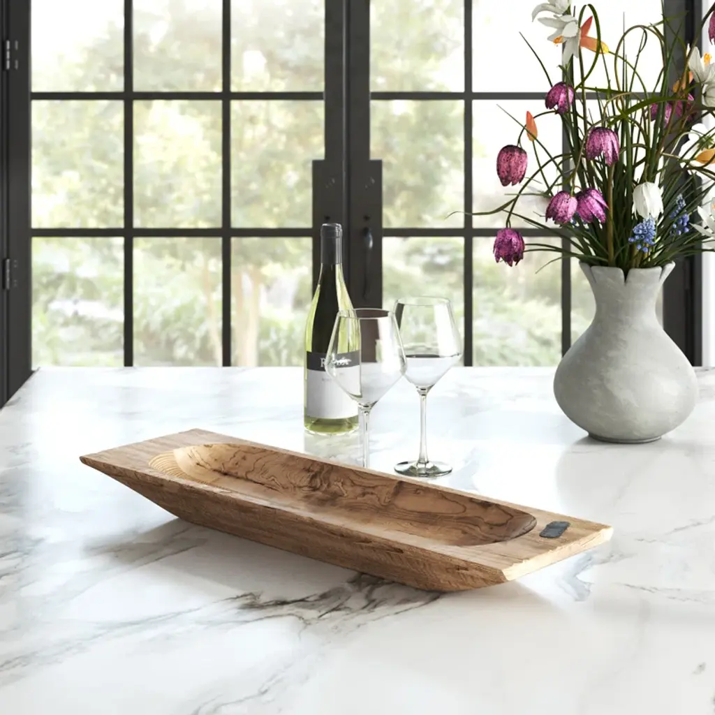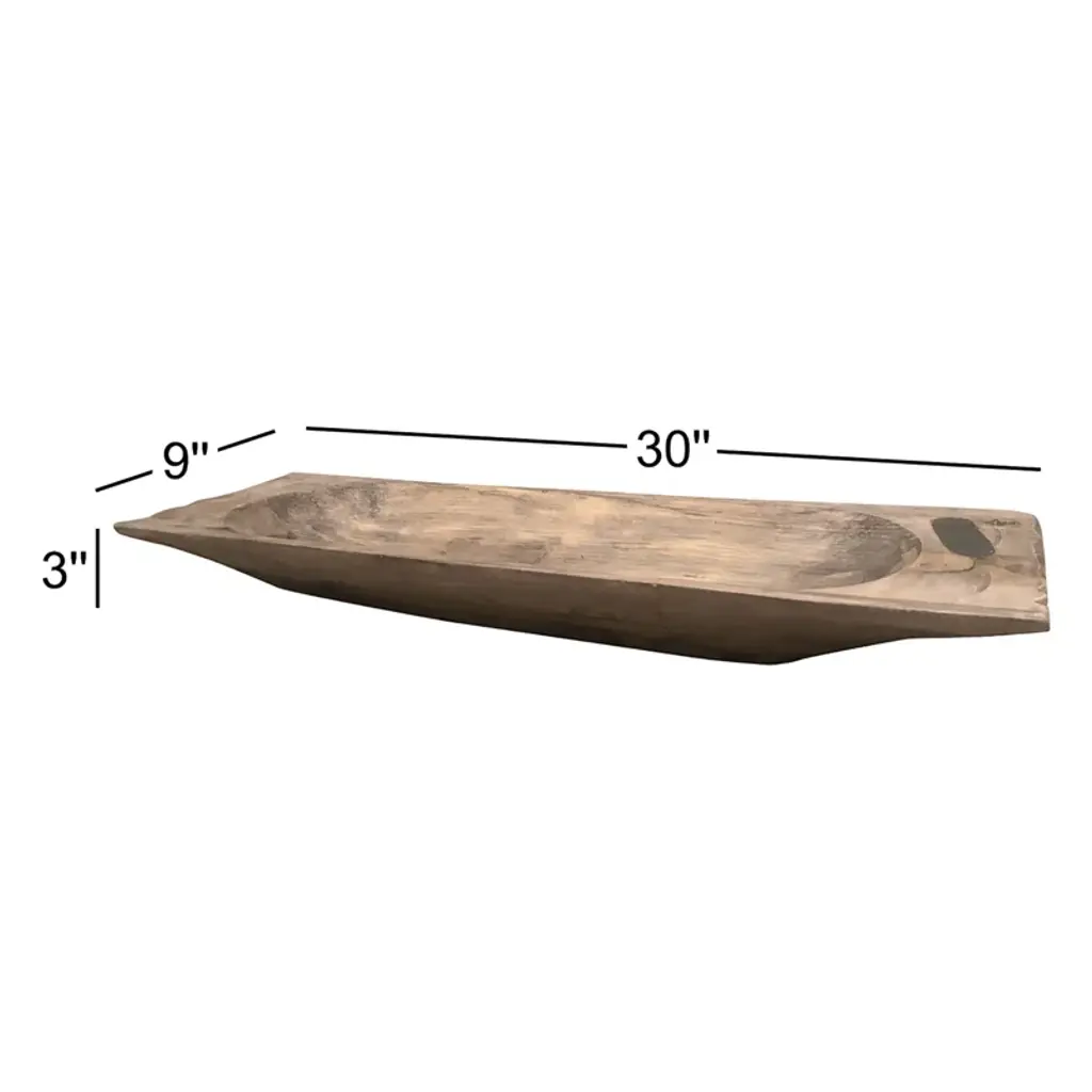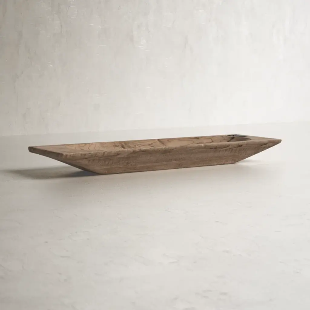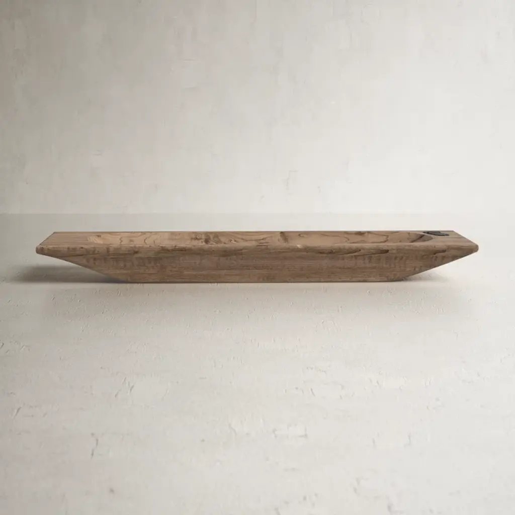 This solid wood tray is a functional and versatile addition to your home. Inspired by traditional Indian dough trays, it features an iron band that adds a rustic touch to its natural wood finish. The rectangular shape makes it ideal for use as an ottoman or coffee table tray in your living or dining room. Its authentic design means that small cracks and uneven surfaces may develop over time, adding character to the piece. Plus, it's food safe, so you can confidently serve snacks and appetizers to your guests.