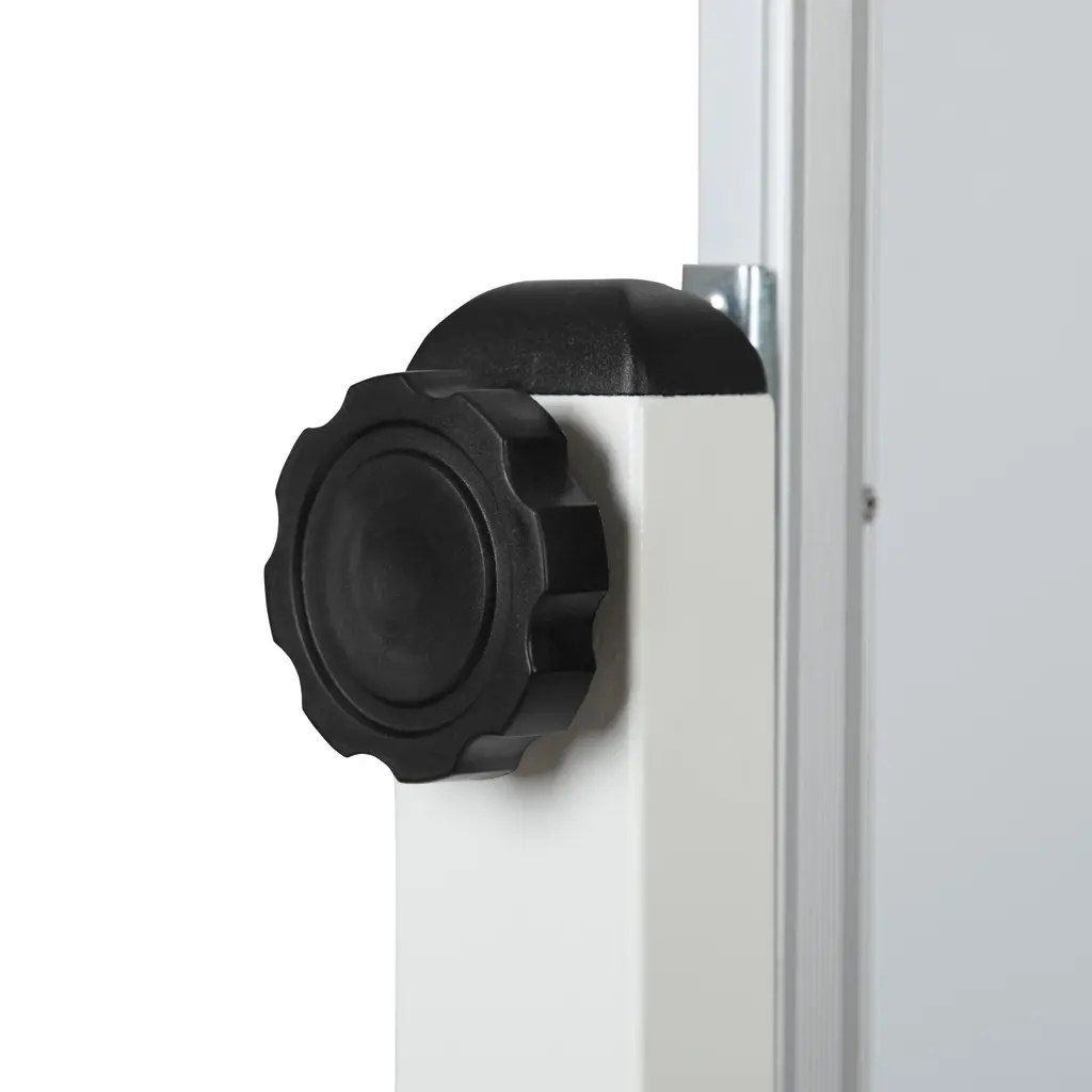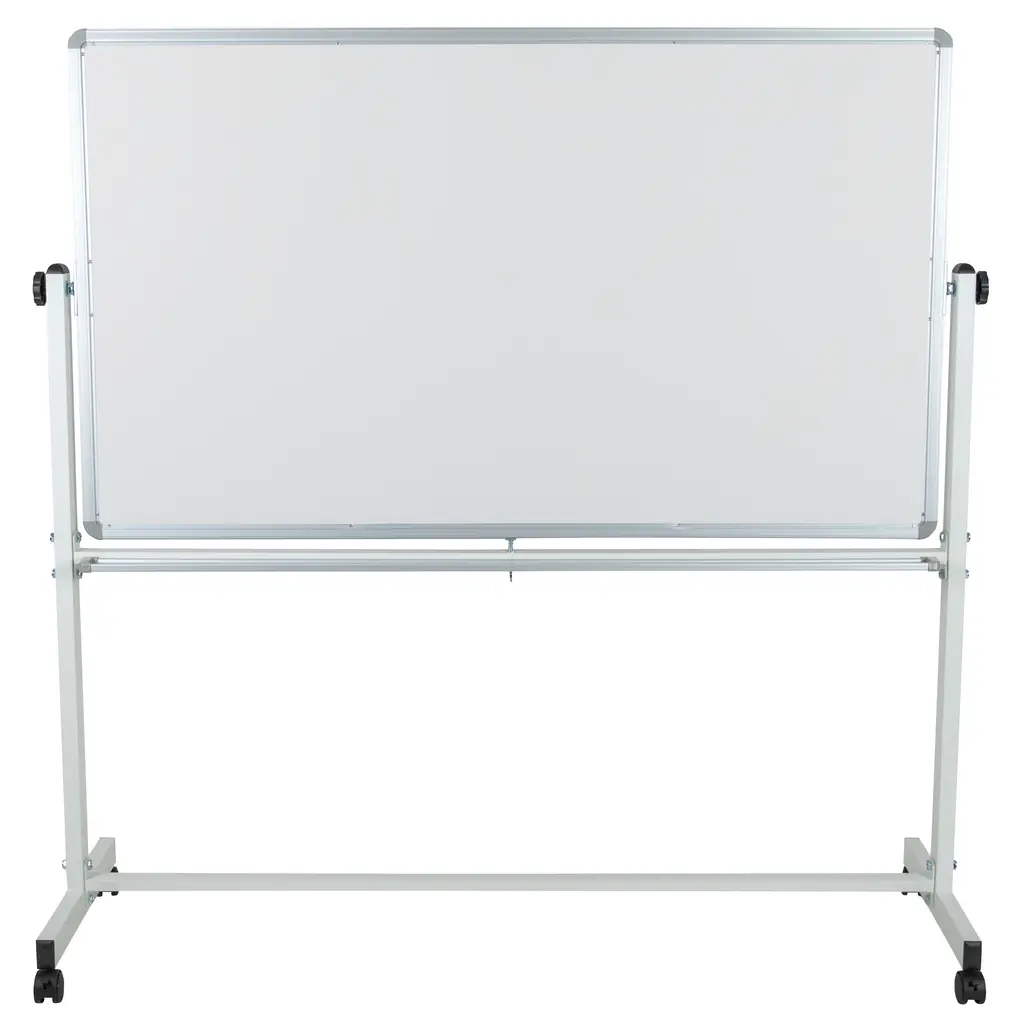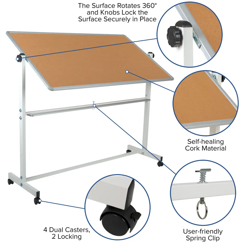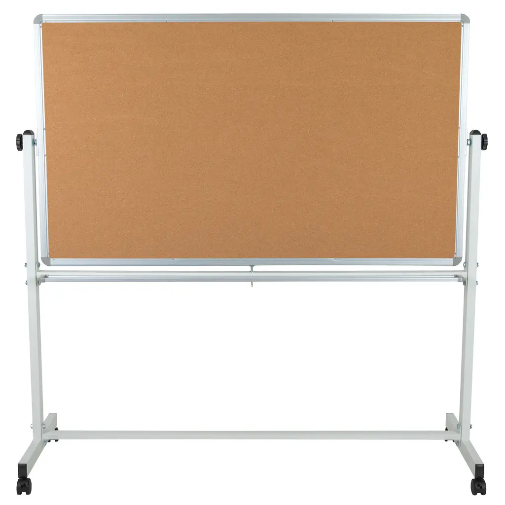 Keep up with the daily demands of your classroom with a multipurpose mobile board. This convenient freestanding cork board can be placed near the front of the classroom for pupils to get the latest school news or obtain classroom information before the start of class. Once you're ready to start your session, roll to the center of the room, flip and use the dry erase side for lessons. Interact with colleagues and clients with the aid of a reversible cork board and whiteboard. Write out your plans, ideas and budgets on the dry erase side, flip over to display outlines and blueprints. The mobile board will allow you to roll the board around the conference room or keep it centered at the front of the table for a clear view around the room. The combo rolling board offer some great features: - Magnetic dry erase surface to hang up documents - - Includes 6 magnets - - Spring clip secures board while in use; pull down to activate flipping motion - - Marker tray to hold markers, pens and laser pointers - - Self-healing natural cork material, eliminating large puncture holes - - Two front-wheel locking casters to lock the freestanding board in place - From school to office, the reversible cork board and dry erase combo will outperform your standard wall board by providing you with the flexibility to mobilize your lessons or presentations.