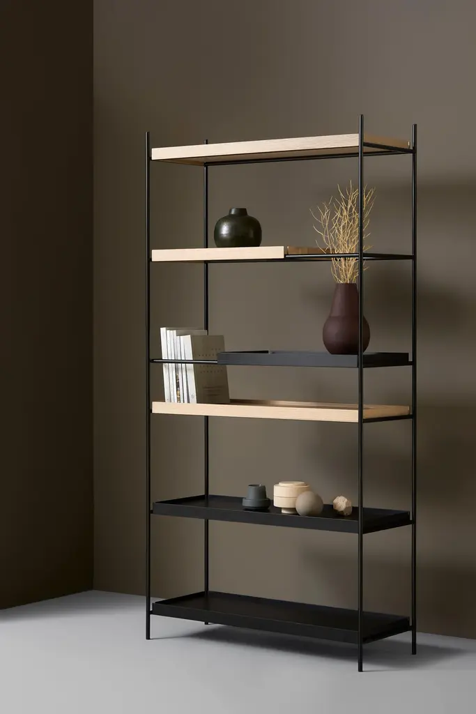 High Black Oak Tray shelf by Hanne Willmann.Materials: Metal, oak.Dimensions: D 40 x W 100 x H 201 cm.Also available in different tray conbinations and 2 sizes: H81, H 201 cm.Hanne Willmann is a dynamic German designer with her own multidisciplinar y design studio based in Berlin. She has an impressive portfolio of furniture and lighting designs, projects, jury memberships and workshops at the University of the Arts, Berlin. Her designs reveal a profound fascination for details and emphasise the high-value aesthetic appeal.With an open mind and a strong dedication to the craft, Hanne Willmann is determined to fully reveal the essence of every piece she comes across. This meticulousness is visible in her understanding of materials, colour and innovative production techniques. A shared feature for her designs is the consistent timelessness.Tray Shelf is designed with this sustainable mindset and with the intention of staying functional and beautiful as time goes past. Its simple expression, elegant materials and solid construction are made for use for many years to come.WOUDThe founders, Mia and Torben Koed, decided to put their 30 years of experience into a new project. It was time for a change and a new challenge. The challenge was to build an ambitious design brand from the ground up with high-quality materials and great attention to the little details. With a drive to create new originals, the WOUD collection is founded upon the idea to look ahead instead of looking back and share the love for honest design. Therefore, we are eager to discover and develop new ideas whether it being in form, function or choice of material.