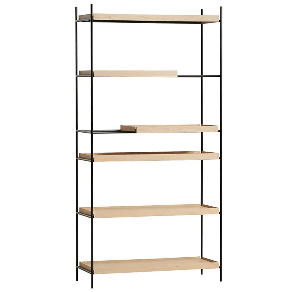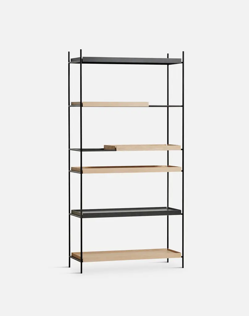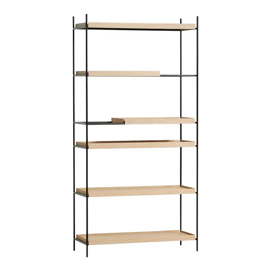 High oak and black tray shelf III by Hanne Willmann.Materials: metal, oak.Dimensions: D 40 x W 100 x H 201 cm.Also available in different tray conbinations and 2 sizes: H 81, H 201 cm.Hanne Willmann is a dynamic German designer with her own multidisciplinar y design studio based in Berlin. She has an impressive portfolio of furniture and lighting designs, projects, jury memberships and workshops at the University of the Arts, Berlin. Her designs reveal a profound fascination for details and emphasise the high-value aesthetic appeal.With an open mind and a strong dedication to the craft, Hanne Willmann is determined to fully reveal the essence of every piece she comes across. This meticulousness is visible in her understanding of materials, colour and innovative production techniques. A shared feature for her designs is the consistent timelessness.Tray Shelf is designed with this sustainable mindset and with the intention of staying functional and beautiful as time goes past. Its simple expression, elegant materials and solid construction are made for use for many years to come.WOUDThe founders, Mia and Torben Koed, decided to put their 30 years of experience into a new project. It was time for a change and a new challenge. The challenge was to build an ambitious design brand from the ground up with high-quality materials and great attention to the little details. With a drive to create new originals, the WOUD collection is founded upon the idea to look ahead instead of looking back and share the love for honest design. Therefore, we are eager to discover and develop new ideas whether it being in form, function or choice of material.