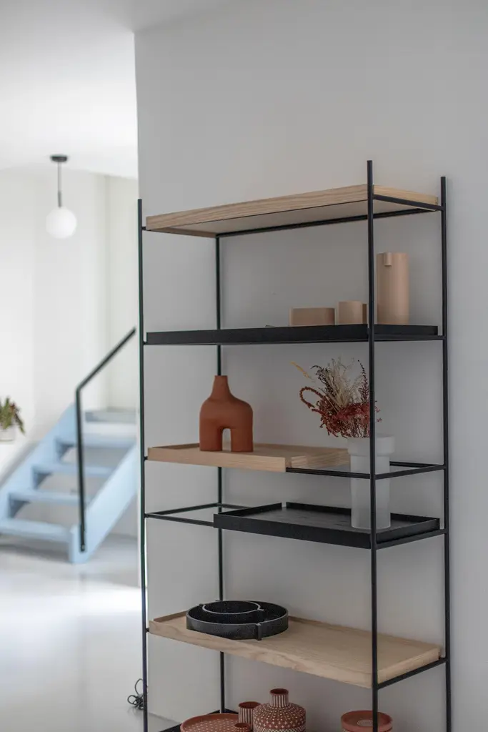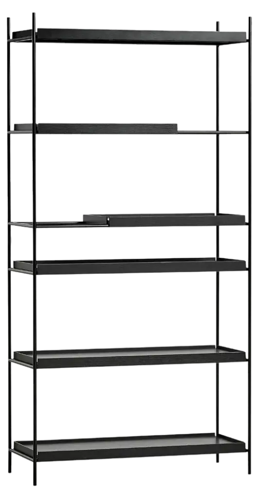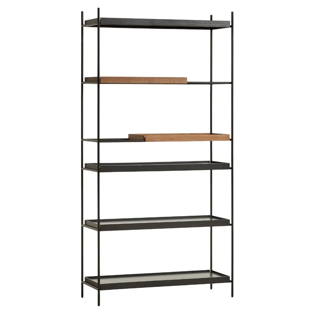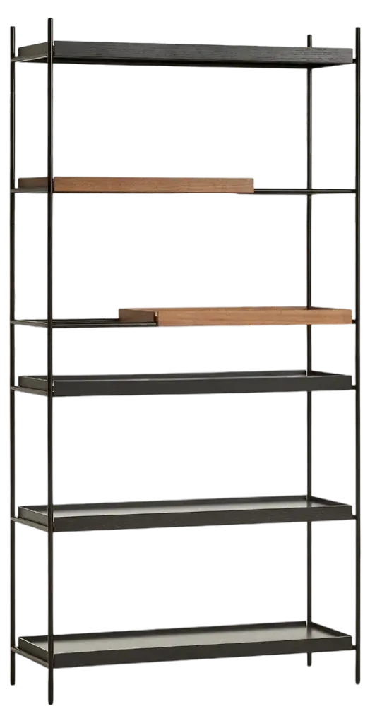 High Oak and black tray shelf IV by Hanne Willmann.Materials: metal, oak.Dimensions: D 40 x W 100 x H 201 cm.Also available in different tray conbinations and 2 sizes: H 81, H 201 cm.Hanne Willmann is a dynamic German designer with her own multidisciplinar y design studio based in Berlin. She has an impressive portfolio of furniture and lighting designs, projects, jury memberships and workshops at the University of the Arts, Berlin. Her designs reveal a profound fascination for details and emphasise the high-value aesthetic appeal.With an open mind and a strong dedication to the craft, Hanne Willmann is determined to fully reveal the essence of every piece she comes across. This meticulousness is visible in her understanding of materials, colour and innovative production techniques. A shared feature for her designs is the consistent timelessness.Tray Shelf is designed with this sustainable mindset and with the intention of staying functional and beautiful as time goes past. Its simple expression, elegant materials and solid construction are made for use for many years to come.WOUDThe founders, Mia and Torben Koed, decided to put their 30 years of experience into a new project. It was time for a change and a new challenge. The challenge was to build an ambitious design brand from the ground up with high-quality materials and great attention to the little details. With a drive to create new originals, the WOUD collection is founded upon the idea to look ahead instead of looking back and share the love for honest design. Therefore, we are eager to discover and develop new ideas whether it being in form, function or choice of material.