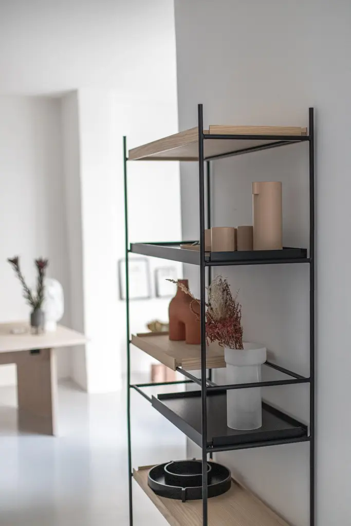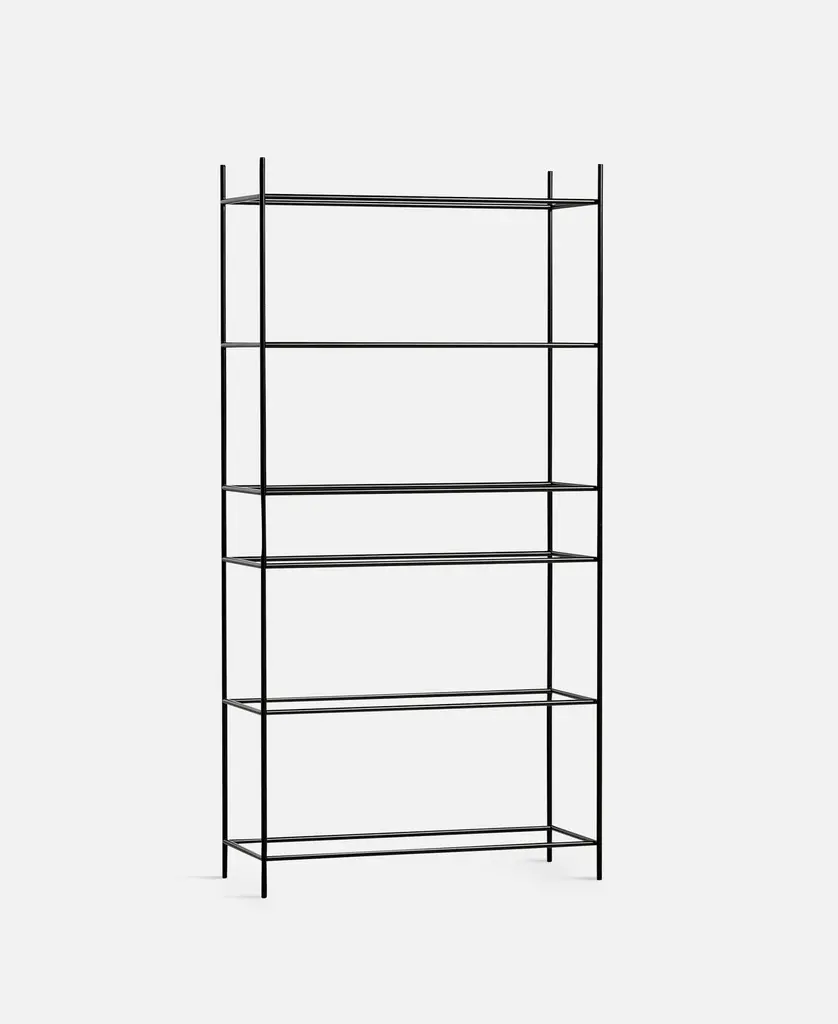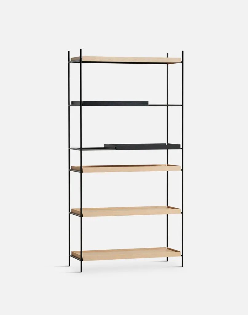 High oak and black tray shelf VII by Hanne WillmannMaterials: metal, oak.Dimensions: D 40 x W 100 x H 201 cmAlso available in different tray conbinations and 2 sizes: H81, H 201 cm.Hanne Willmann is a dynamic German designer with her own multidisciplinar y design studio based in Berlin. She has an impressive portfolio of furniture and lighting designs, projects, jury memberships and workshops at the University of the Arts, Berlin. Her designs reveal a profound fascination for details and emphasise the high-value aesthetic appeal.With an open mind and a strong dedication to the craft, Hanne Willmann is determined to fully reveal the essence of every piece she comes across. This meticulousness is visible in her understanding of materials, colour and innovative production techniques. A shared feature for her designs is the consistent timelessness.Tray Shelf is designed with this sustainable mindset and with the intention of staying functional and beautiful as time goes past. Its simple expression, elegant materials and solid construction are made for use for many years to come.WOUDThe founders, Mia and Torben Koed, decided to put their 30 years of experience into a new project. It was time for a change and a new challenge. The challenge was to build an ambitious design brand from the ground up with high-quality materials and great attention to the little details. With a drive to create new originals, the WOUD collection is founded upon the idea to look ahead instead of looking back and share the love for honest design. Therefore, we are eager to discover and develop new ideas whether it being in form, function or choice of material.