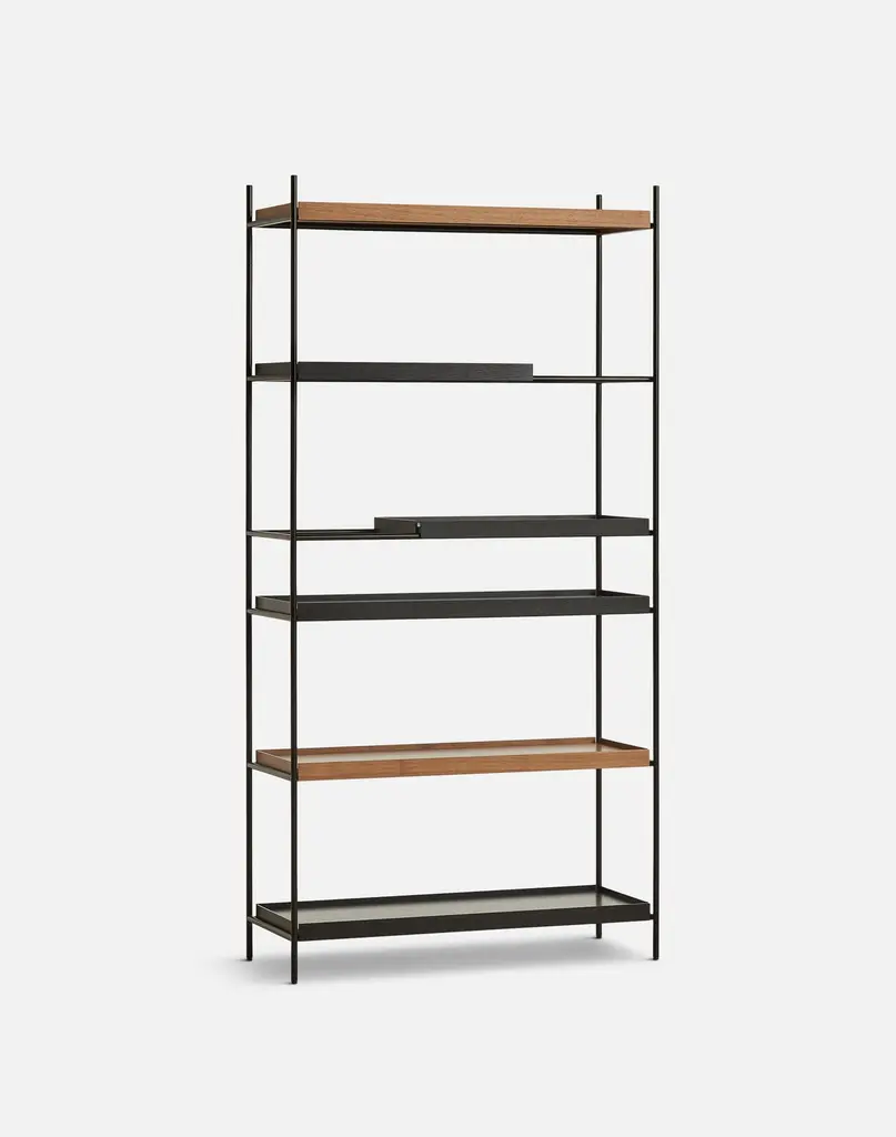 High walnut and black tray shelf II by Hanne Willmann.Materials: metal, walnut.Dimensions: D 40 x W 100 x H 201 cm.Also available in different tray conbinations and 2 sizes: H81, H 201 cm.Hanne Willmann is a dynamic German designer with her own multidisciplinar y design studio based in Berlin. She has an impressive portfolio of furniture and lighting designs, projects, jury memberships and workshops at the University of the Arts, Berlin. Her designs reveal a profound fascination for details and emphasise the high-value aesthetic appeal.With an open mind and a strong dedication to the craft, Hanne Willmann is determined to fully reveal the essence of every piece she comes across. This meticulousness is visible in her understanding of materials, colour and innovative production techniques. A shared feature for her designs is the consistent timelessness.Tray Shelf is designed with this sustainable mindset and with the intention of staying functional and beautiful as time goes past. Its simple expression, elegant materials and solid construction are made for use for many years to come.WOUDThe founders, Mia and Torben Koed, decided to put their 30 years of experience into a new project. It was time for a change and a new challenge. The challenge was to build an ambitious design brand from the ground up with high-quality materials and great attention to the little details. With a drive to create new originals, the WOUD collection is founded upon the idea to look ahead instead of looking back and share the love for honest design. Therefore, we are eager to discover and develop new ideas whether it being in form, function or choice of material.