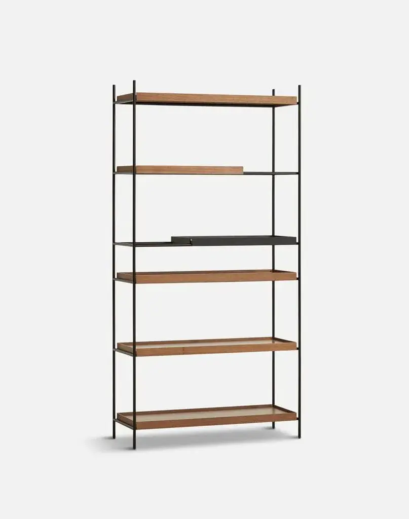 High walnut and black tray shelf v by hanne willmann materials: metal, walnut. Dimensions: d 40 x w 100 x h 201 cm available separately in different tray conbinations and 2 sizes: h81, h 201 cm. Hanne willmann is a dynamic german designer with her own multidisciplinar y design studio based in berlin. She has an impressive portfolio of furniture and lighting designs, projects, jury memberships and workshops at the university of the arts, berlin. Her designs reveal a profound fascination for details and emphasise the high-value aesthetic appeal. With an open mind and a strong dedication to the craft, hanne willmann is determined to fully reveal the essence of every piece she comes across. This meticulousness is visible in her understanding of materials, colour and innovative production techniques. A shared feature for her designs is the consistent timelessness. Tray shelf is designed with this sustainable mindset and with the intention of staying functional and beautiful as time goes past. Its simple expression, elegant materials and solid construction are made for use for many years to come. Woud the founders, mia and torben koed, decided to put their 30 years of experience into a new project. It was time for a change and a new challenge. The challenge was to build an ambitious design brand from the ground up with high-quality materials and great attention to the little details. With a drive to create new originals, the woud collection is founded upon the idea to look ahead instead of looking back and share the love for honest design. Therefore, we are eager to discover and develop new ideas whether it being in form, function or choice of material.