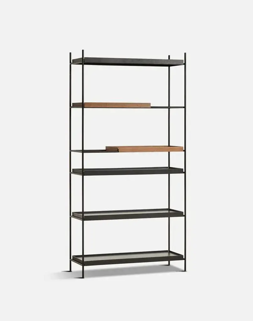High walnut and black tray shelf vi by hanne willmann. Materials: metal, walnut. Dimensions: d 40 x w 100 x h 201 cm. May be available separately in different tray conbinations and 2 sizes: h81, h 201 cm. Hanne willmann is a dynamic german designer with her own multidisciplinar y design studio based in berlin. She has an impressive portfolio of furniture and lighting designs, projects, jury memberships and workshops at the university of the arts, berlin. Her designs reveal a profound fascination for details and emphasise the high-value aesthetic appeal. With an open mind and a strong dedication to the craft, hanne willmann is determined to fully reveal the essence of every piece she comes across. This meticulousness is visible in her understanding of materials, colour and innovative production techniques. A shared feature for her designs is the consistent timelessness. Tray shelf is designed with this sustainable mindset and with the intention of staying functional and beautiful as time goes past. Its simple expression, elegant materials and solid construction are made for use for many years to come. Woud the founders, mia and torben koed, decided to put their 30 years of experience into a new project. It was time for a change and a new challenge. The challenge was to build an ambitious design brand from the ground up with high-quality materials and great attention to the little details. With a drive to create new originals, the woud collection is founded upon the idea to look ahead instead of looking back and share the love for honest design. Therefore, we are eager to discover and develop new ideas whether it being in form, function or choice of material.