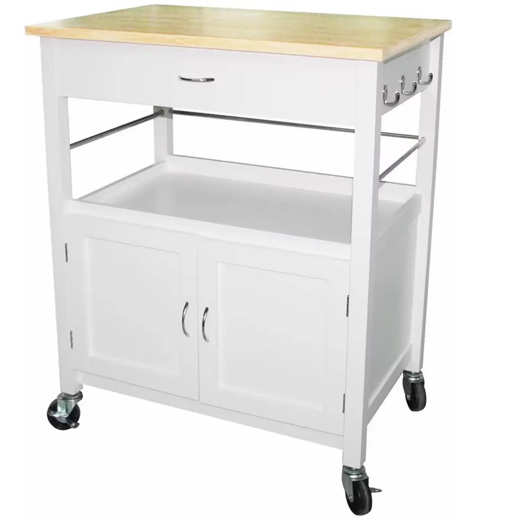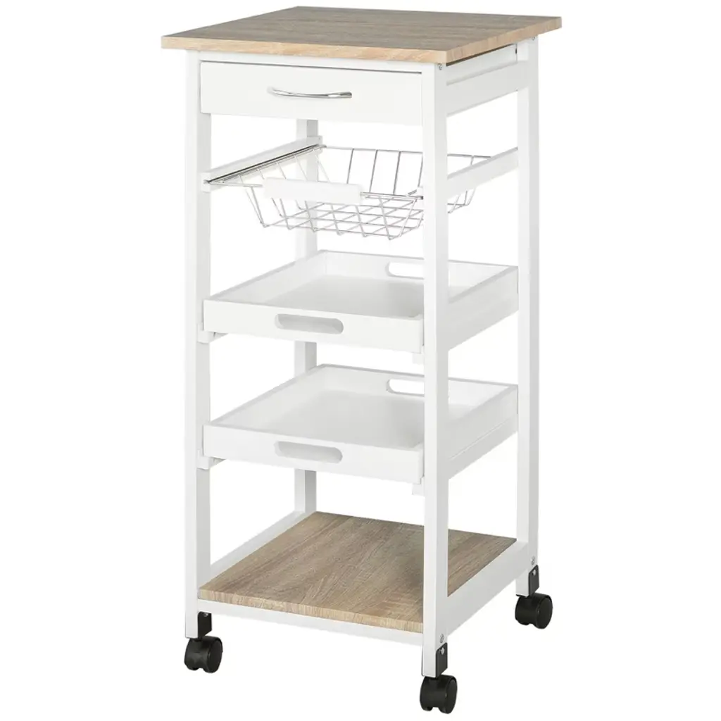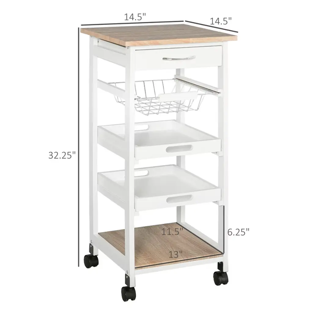 Homcom Mobile Kitchen Cart, Rolling Kitchen Island With Storage, Solid Wood Frame Utility Cart With Wire Fruit Baskets, Trays And Drawer, White