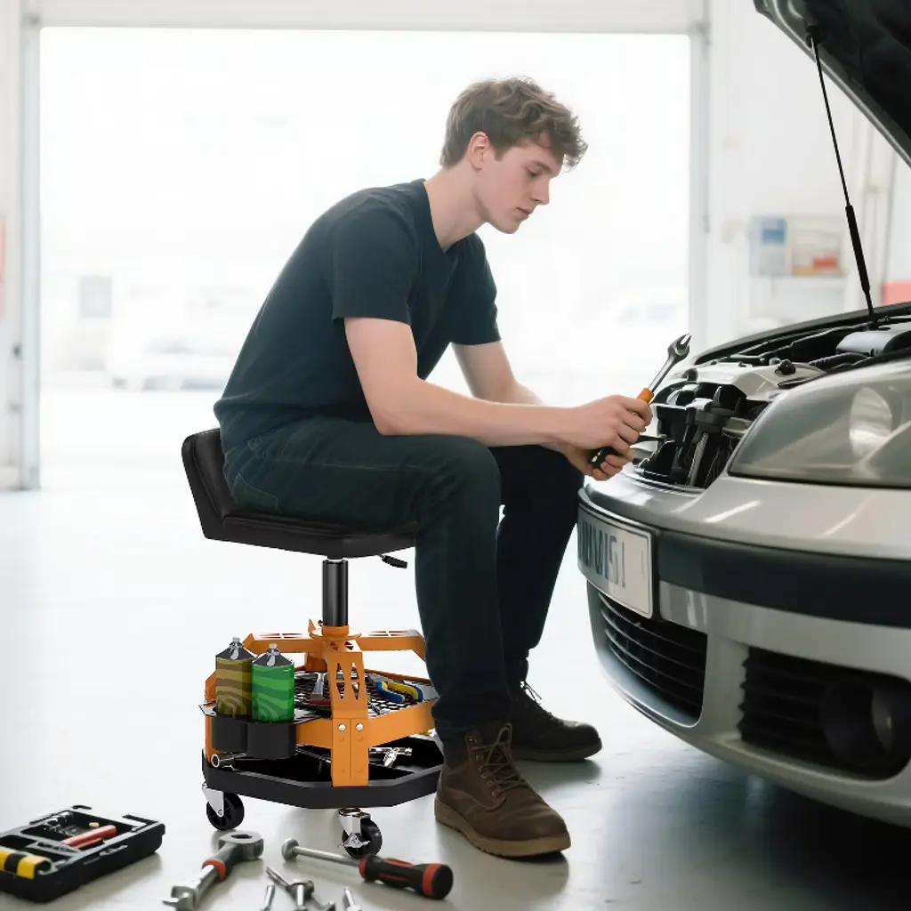 Revolutionize the way you work with the HOMCOM Rolling Shop Stool! Spending long hours in the garage or workshop? An ergonomic work stool is a must-have for superior comfort and support. It lets you sit comfortably instead of squatting. With a 300 lbs weight capacity, it offers secure seating for most adults. Plus, the adjustable height and 360° swivel casters ensure smooth movement on any surface—providing stability and comfort for every task in your garage!