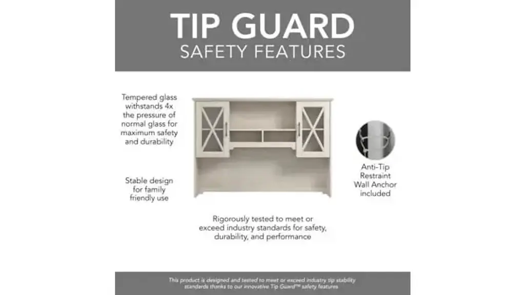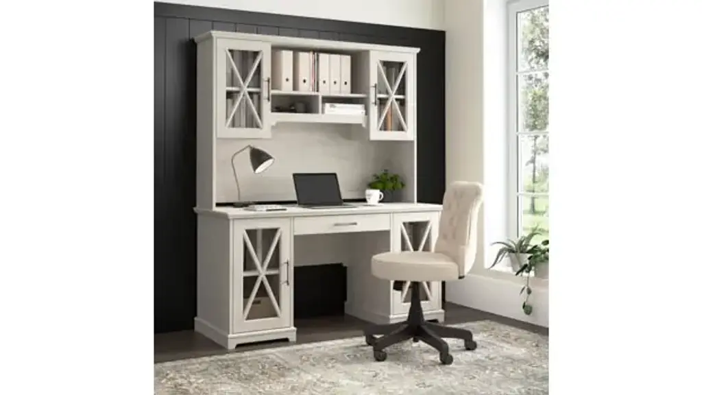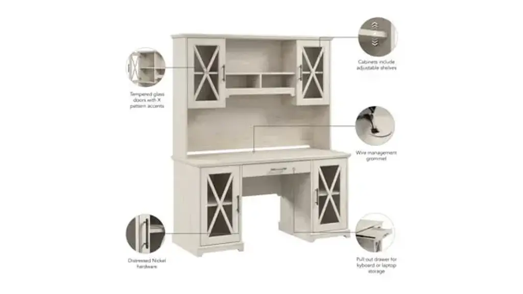 The Bush Furniture Lennox 60" W Farmhouse Desk with Hutch and Keyboard Tray boasts a practical design to help you complete projects and assignments while conveying a natural, easy-going charm. Spread out with materials and equipment on a spacious 60" W desk surface that supports up to 200 lbs and includes built-in wire management to keep cords and cables in order. A pull-out drawer offers space to store your keyboard or laptop while two cabinets with tempered glass doors and X pattern accents keep materials and supplies close by. Each cabinet contains one adjustable shelf to accommodate items of various sizes. The Desk Hutch adds two more glass cabinets with adjustable shelves and a large open section that can be used to organize a small collection of books and reference materials or to give the room a personal touch with your favorite decorations. The style and versatility of this computer desk with hutch works well in a home office, but it can also be integrated flawlessly into a living room or any other residential space. The Lennox Collection's intentionally distressed finish and hardware reflect the best elements of coastal and farmhouse styling to fit perfectly in homes that embrace a more relaxed vibe. This home office desk with storage has been meticulously tested to meet or exceed industry standards for safety, durability, and performanc. See the full collection for coordinating items available. Overall Dimensions: 60" W x 24" D x 72" H. Ships ready for easy assembly.