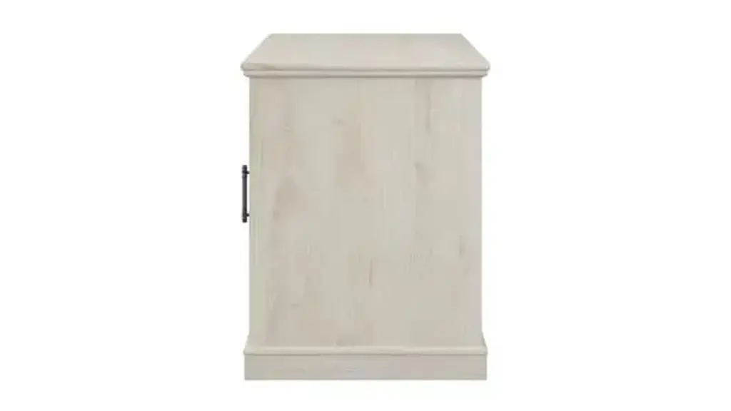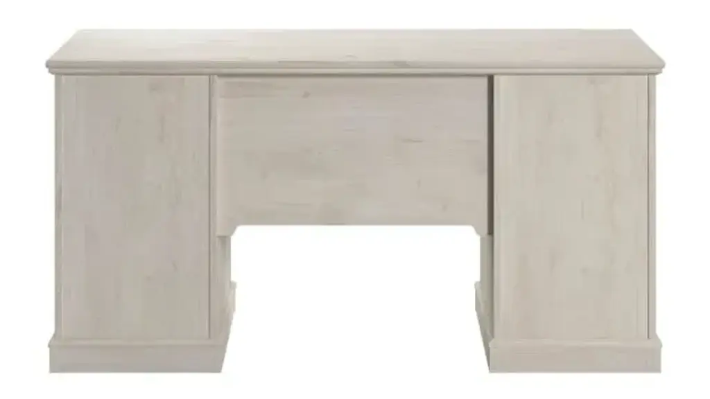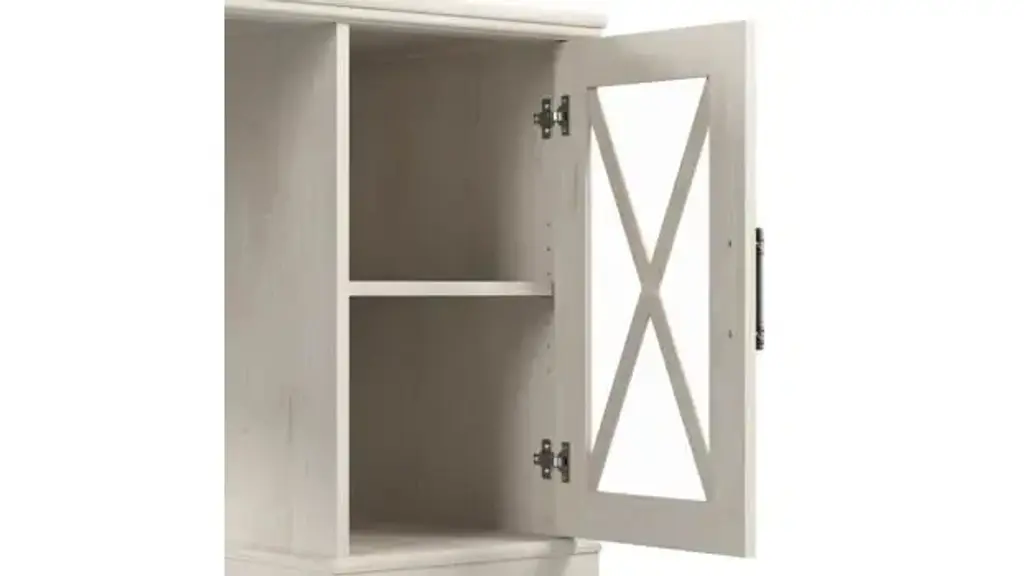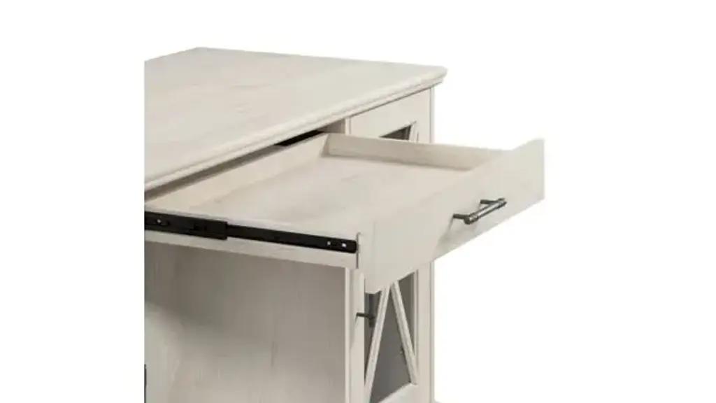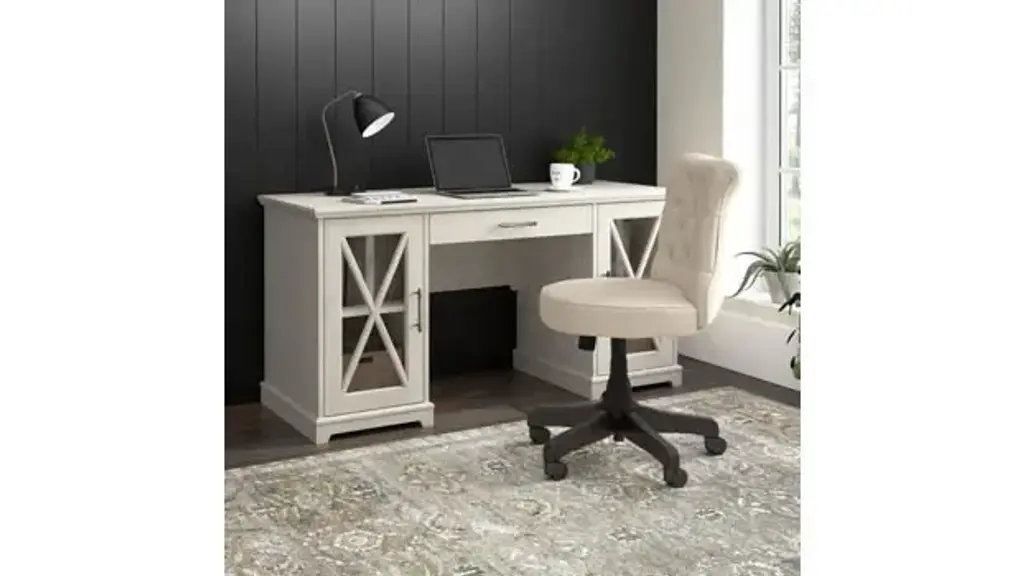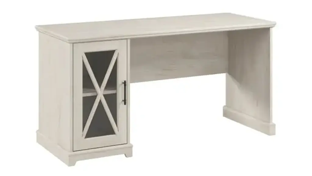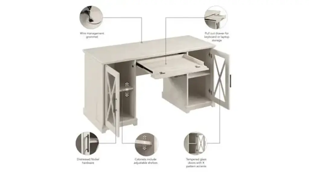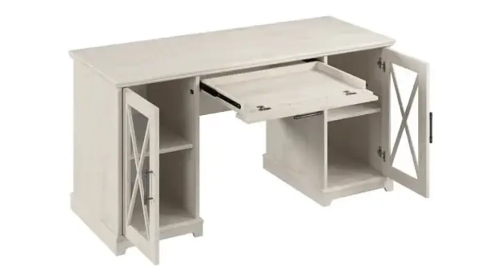 The Bush Furniture Lennox 60" W Farmhouse Desk with Storage and Keyboard Tray boasts a practical design to help you complete projects and assignments while conveying a natural, easy-going charm. Spread out with materials and equipment on a spacious 60" desk surface that supports up to 200 lbs and includes a built-in wire management grommet to keep cords and cables in order. A pull-out drawer offers space to store your keyboard or laptop while two cabinets with tempered glass doors and X pattern accents keep important materials and supplies close by while you work. Each cabinet contains one adjustable shelf to accommodate books and binders of various sizes. The style and versatility of this computer desk works well in a dedicated home office, but it can also be integrated flawlessly into a living room or any other residential space. The Lennox Collection's intentionally distressed finish and hardware reflect the best elements of coastal and farmhouse styling to fit perfectly in homes that embrace a more relaxed vibe. This home office desk with storage has been meticulously tested to meet or exceed industry standards for safety, durability, and performance. The Lennox Collection features a coordinating 60" W Desk Hutch, File Cabinet with Shelves, Bookcase with Doors, and plenty of other items to build a cohesive living space. Overall Dimensions: 59.37" W x 23.62" D x 30" H Ships ready for easy assembly.