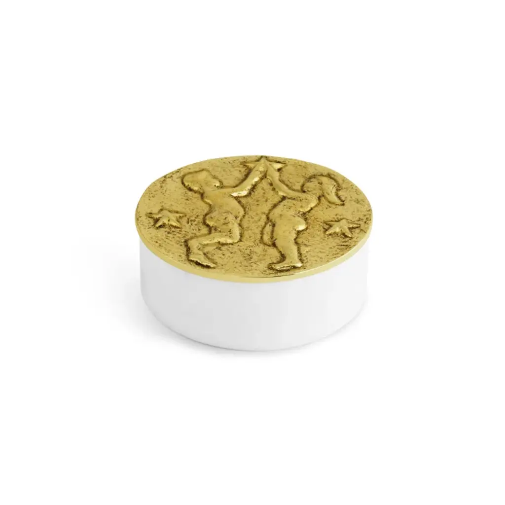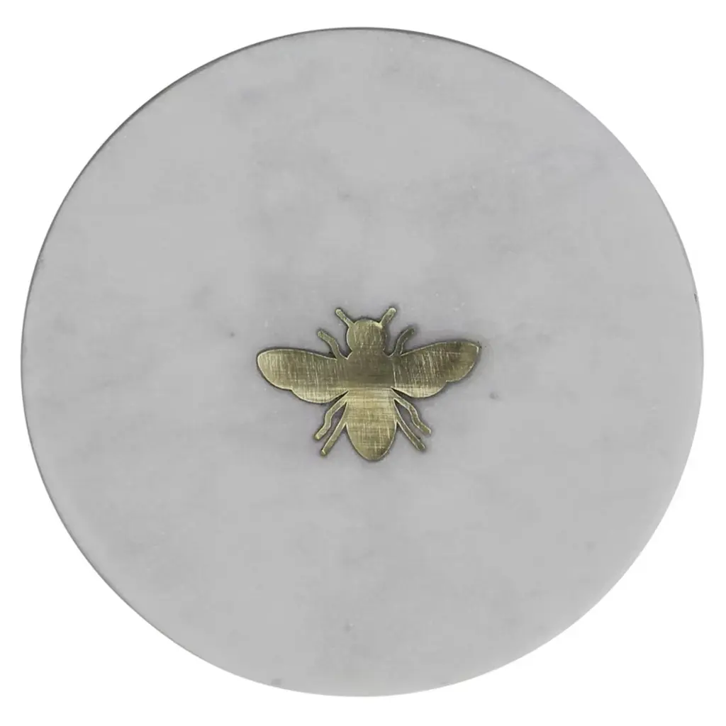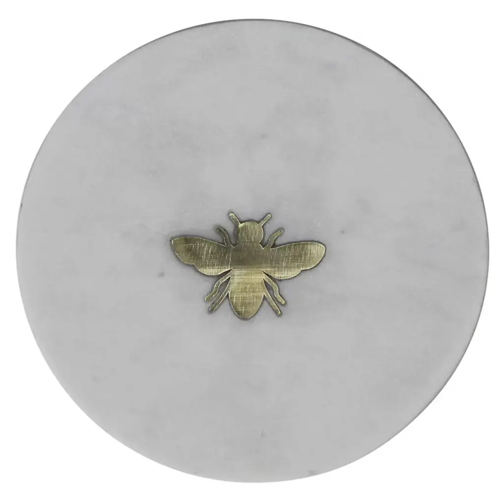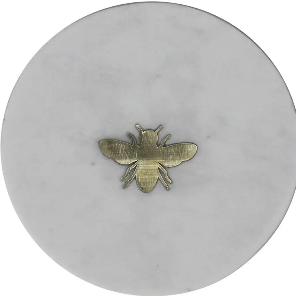 With this Bumble Bee Inlay Marble Serving Tray, you can add the perfect touch of contemporary design to your home. This tray is made from solid marble which is white in color with gray veining through it. In the middle of the round, slightly indented tray, there is a gold bumble bee inlay which is made from metal. This tray will look great as a decor piece but can also be used to serve snacks and drinks at your next dinner party. The whimsical yet classy nature of this tray will definitely be a purchase you won't regret. 1-inch H x 6-inch W x 6-inch D
