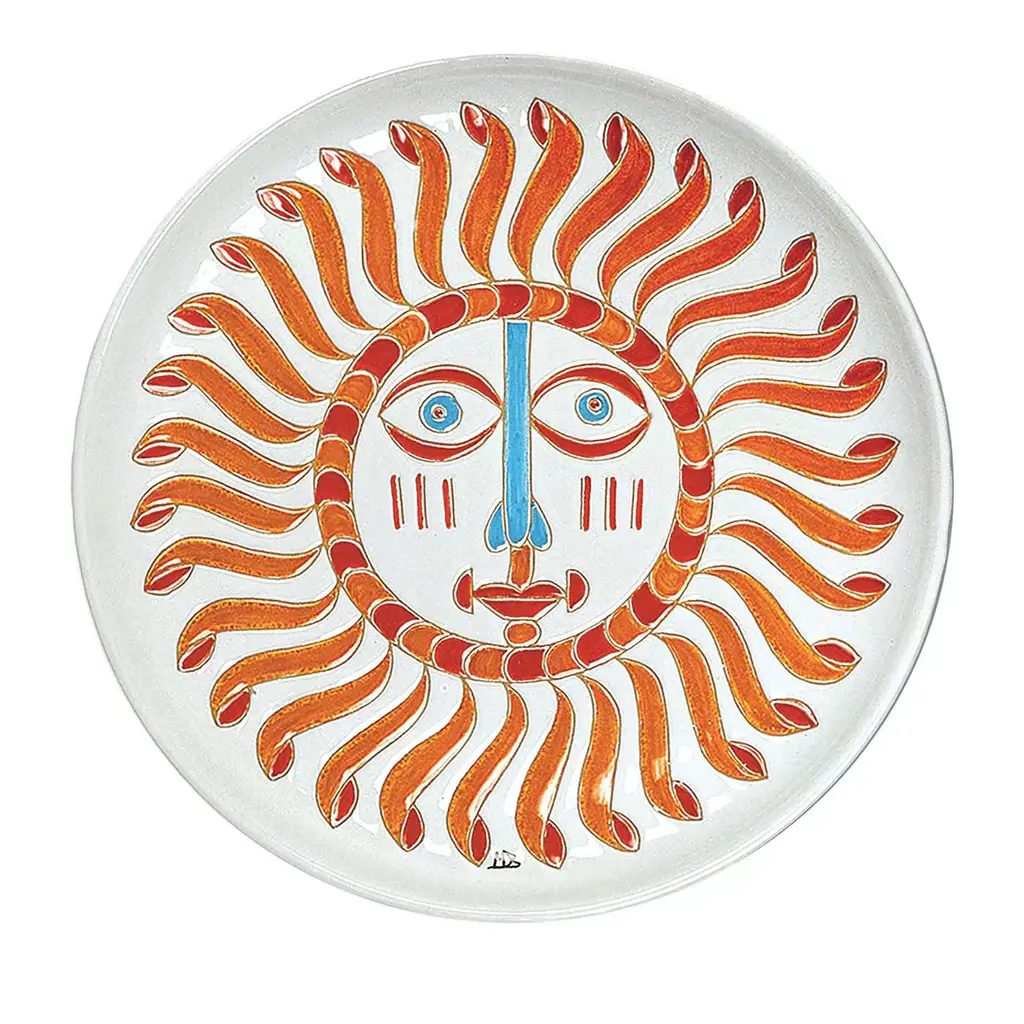 Evoking the glorious sun of the summer solstice, the decoration gracing this round tray is a fresh addition to an eclectic collection. The surface of this handmade terracotta piece is scratched by the skilled hands of Cerasarda's artisans using the graffito technique, creating the elegant decoration in vibrant enamel colors.